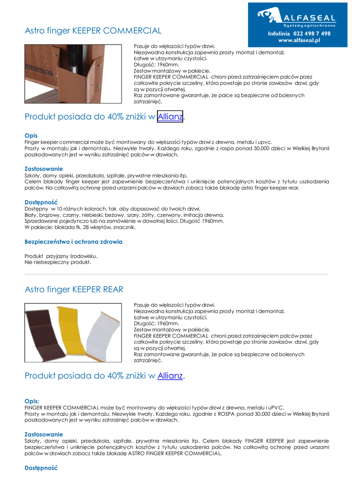 Astro finger KEEPER COMMERCIAL Pasuje do większości typów drzwi. Niezawodna konstrukcja zapewnia prosty montaż i demontaż. Łatwe w utrzymaniu czystości. Długość: 1960mm. Zestaw montażowy w pakiecie. FINGER KEEPER COMMERCIAL chroni przed zatrzaśnięciem palców przez całkowite pokrycie szczeliny, która powstaje po stronie zawiasów drzwi, gdy są w pozycji otwartej. Raz zamontowane gwarantuje, że palce są bezpieczne od bolesnych zatrzaśnięć. Produkt posiada do 40% zniżki w Allianz. Opis Finger keeper commercial może być montowany do większości typów drzwi z drewna, metalu i upvc. Prosty w montażu jak i demontażu. Niezwykle trwały. Każdego roku, zgodnie z rospa ponad 30.000 dzieci w Wielkiej Brytanii poszkodowanych jest w wyniku zatrzaśnięć palców w drzwiach. Zastosowanie Szkoły, domy opieki, przedszkola, szpitale, prywatne mieszkania itp. Celem blokady finger keeper jest zapewnienie bezpieczeństwa i uniknięcie potencjalnych kosztów z tytułu uszkodzenia palców. Na całkowitą ochronę przed urazami palców w drzwiach zobacz także blokadę astro finger keeper rear. Dostępność Dostępny w 10 różnych kolorach, tak aby dopasować do twoich drzwi. Biały, brązowy, czarny, niebieski, beżowy, szary, żółty, czerwony, imitacja drewna. Sprzedawane pojedynczo lub na zamówienie w dowolnej ilości. Długość 1960mm. W pakiecie: blokada fk, 28 wkrętów, znacznik. Bezpieczeństwo i ochrona zdrowia Produkt przyjazny środowisku. Nie niebezpieczny produkt. Astro finger KEEPER REAR Pasuje do większości typów drzwi. Niezawodna konstrukcja zapewnia prosty montaż i demontaż. Łatwe w utrzymaniu czystości. Długość: 1960mm. Zestaw montażowy w pakiecie. FINGER KEEPER COMMERCIAL chroni przed zatrzaśnięciem palców przez całkowite pokrycie szczeliny, która powstaje po stronie zawiasów drzwi, gdy są w pozycji otwartej. Raz zamontowane gwarantuje, że palce są bezpieczne od bolesnych zatrzaśnięć. Produkt posiada do 40% zniżki w Allianz. Opis: FINGER KEEPER COMMERCIAL może być montowany do większości typów drzwi z drewna, metalu i uPV C. Prosty w montażu jak i demontażu. Niezwykle trwały. Każdego roku, zgodnie z ROSPA ponad 30.000 dzieci w Wielkiej Brytanii poszkodowanych jest w wyniku zatrzaśnięć palców w drzwiach. Zastosowanie Szkoły, domy opieki, przedszkola, szpitale, prywatne mieszkania itp. Celem blokady FINGER KEEPER jest zapewnienie bezpieczeństwa i uniknięcie potencjalnych kosztów z tytułu uszkodzenia palców. Na całkowitą ochronę przed urazami palców w drzwiach zobacz także blokadę ASTRO FINGER KEEPER COMMERCIAL. Dostępność Dostępny w 10 różnych kolorach, tak aby dopasować do Twoich drzwi. BIAŁY, BRĄZOWY, CZARNY, NIEBIESKI, BEŻOWY, SZARY, ŻÓŁTY, CZERWONY, IMITACJA DREWNA. Pakowanie Sprzedawane pojedynczo lub na zamówienie w dowolnej ilości. Długość 1960mm. W pakiecie: Blokada FK, 28 wkrętów, znacznik. Bezpieczeństwo i ochrona zdrowia Produkt przyjazny środowisku.