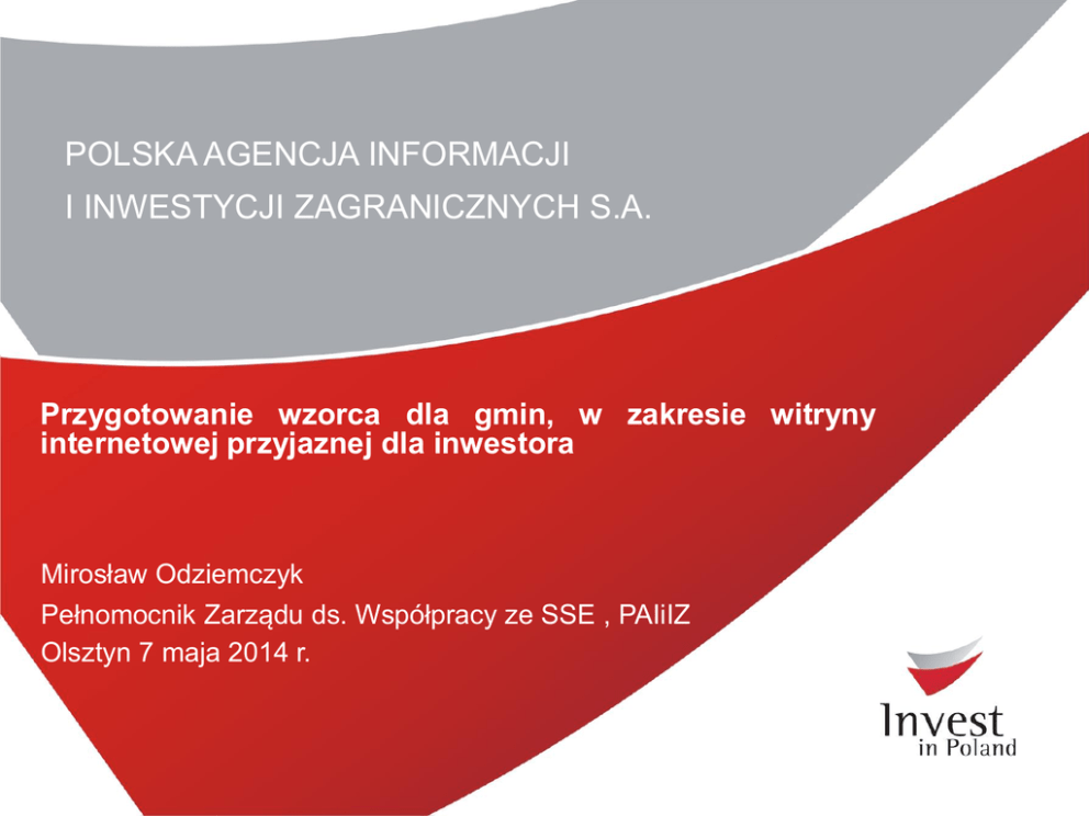 POLSKA AGENCJA INFORMACJI I INWESTYCJI ZAGRANICZNYCH S.A. Przygotowanie wzorca dla gmin, w zakresie witryny internetowej przyjaznej dla inwestora Mirosław Odziemczyk Pełnomocnik Zarządu ds. Współpracy ze SSE , PAIiIZ Olsztyn 7 maja 2014 r. MIO Plan prezentacji • Cele działania • Określenie grupy docelowej • Reguły obowiązujące przy tworzeniu witryny internetowej przyjaznej dla inwestora – zgodnie ze standardami PAIiIZ S.A. • Zawartość merytoryczna serwisu internetowego • Realizacja strony internetowej i jej utrzymania Cele działania • Doskonalenie stron internetowych jako istotnego narzędzia promocji inwestycji zagranicznych w Polsce, w skali gminy. • Standaryzacja zawartości stron internetowych gmin zainteresowanych promowaniem własnej oferty lokalizacyjnej w/g. zasad wypracowanych przez PAIiIZ S.A. • Stworzenie możliwości dodatkowej formy promocji w przyszłości przez Regionalne Centra Obsługi Inwestora i PAIiIZ S.A. dla wyróżniających się gmin. Określenie grupy docelowej • Witryna internetowa, a w szczególności specjalistyczna zakładka poświęcona promowaniu potencjału inwestycyjnego gminy, w tym jej oferty lokalizacyjnej skierowana jest do inwestorów polskich i zagranicznych. • Informacje na temat zidentyfikowanych przez gminę obszarów działalności gospodarczej powinny być czytelne dla każdego użytkownika portalu. Reguły obowiązujące przy tworzeniu witryny internetowej przyjaznej dla inwestora - 1 • Proponujemy aby nazwa zakładki przeznaczonej dla inwestorów została umieszczona na stronie głównej gminy po lewej stronie pod logotypem gminy. • Zakładka ta o nazwie np. „Invest in (nazwa gminy)” powinna być głównym elementem portalu, w którym należy umieścić „wszystkie” niezbędne informacje dla potencjalnego inwestora. Reguły obowiązujące przy tworzeniu witryny internetowej przyjaznej dla inwestora - 2 • Dodatkowo na stronie głównej serwisu można zamieścić w celach marketingowych najlepsze „flagowe” oferty inwestycyjne (produkcyjne i usługowe) typu greenfield i brownfield (1 – 2 oferty) – tj. bardzo krótki opis promocyjny ze zdjęciami i mapkami. • Korzystne jest również zamieszczenie wypowiedzi przedstawicieli firm (ze zdjęciem i podpisem lub krótki film), które zainwestowały w gminie, podkreślające walor „lokalizacji”. Ważne jest by „kliknięcie” na dowolny z prezentowanych tu elementów powodowało przejście do zakładki adresowanej dla inwestora. Reguły obowiązujące przy tworzeniu witryny internetowej przyjaznej dla inwestora – 3, 4, 5 • Wszystkie elementy i opisy na stronie głównej serwisu , czy w zakładce adresowanej do inwestorów powinny być przygotowane przynajmniej w dwóch wersjach językowych: polskiej i angielskiej. • W zakładce przeznaczonej dla inwestorów tworzymy punkty startowe, z których użytkownicy mogą w szybki sposób wykorzystać jej możliwości i zasoby. • Menu zakładki powinno zawierać następujące elementy: O gminie, Dlaczego warto tu zainwestować, Wsparcie dla inwestora, Oferty inwestycyjne, Kontakty. Reguły obowiązujące przy tworzeniu witryny internetowej przyjaznej dla inwestora – 6, 7, 8 • Zakładka powinna również zawierać „aktywne” banery i linki, które ułatwią korzystanie z serwisu poprzez szybkie przejście w odpowiednie sekcje. • W „Aktualnościach” należy umieszczać informacje o wydarzeniach ważnych z punktu widzenia potencjalnego inwestora, w tym sukcesy inwestycyjne gminy. • Proponujemy unikanie zbyt wielu kolorów i innych efektów specjalnych t.zw. „wodotrysków” oraz zbyt ciężkiej i niewiele wnoszącej do treści serwisu grafiki gdyż potencjalny inwestor oczekuje odpowiedzi na podstawowe pytania i nie należy go zniechęcić nadmiarem zbędnych treści, które wydłużają czas poszukiwania informacji merytorycznej. Zawartość merytoryczna serwisu internetowego – przykład strony głównej Logo i nazwa Gminy Gmina Samorząd LOGO Invest in Gmina Super locations/ flagowe oferty Baner reklamowy gminy Urząd Informator Komunikaty Wydarzenia aktualne BIP Wybór języka strony Przeglądarka E - urząd Wydarzenia aktualne Materiały promocyjne gminy Link i i banery Wydarzenia aktualne Zawartość merytoryczna serwisu internetowego O gminie Dlaczego warto tu zainwestować Wsparcie dla inwestora Oferty inwestycyjne Baner 1 Baner 2 Baner 3 Aktualności Link 1 Link 2 Link 3 Kontakt Zawartość merytoryczna serwisu internetowego O gminie dane statystyczne, np. ludność, powierzchnia, itp. charakter gminy, np. gmina turystyczna, gmina z tradycjami dotyczącymi sektora / sektorów produkcyjnych krótki opis gminy i jej dostępności komunikacyjnej (mapka oraz opis w punktach) wraz z podaniem działających w województwie stref ekonomicznych, parków naukowo technologicznych, inkubatorów przedsiębiorczości, opis sektorów „wysokiej szansy” dla inwestorów, czyli tych, które mają najlepsze warunku do rozwoju w danej gminie, wykaz instytucji okołobiznesowych (firm konsultingowych, kancelarii prawnych, firm rekrutacyjnych itp.), przekazanie informacji o najważniejszych inwestorach krajowych i zagranicznych obecnych w gminie czy regionie, potencjał ludzki, dane dotyczące rynku pracy w powiecie (stopa bezrobocia, średnia płaca), edukacja, infrastruktura techniczna (dostępna w gminie i w obrębie terenów inwestycyjnych) firmy z kapitałem zagranicznym zlokalizowane w gminie (nazwa, sektor, lokalizacja) ważne instytucje do współpracy dla inwestora (tu można zamieścić informacje m.in. o PAIiIZ i SSE, parkach naukowo – technologicznych itp.) Zawartość merytoryczna serwisu internetowego O gminie Wszelkie informacje muszą być aktualne i mieć odzwierciedlenie w faktach. Tytułem uzupełnienia należy podać informacje makroekonomiczne o Polsce lub przekierować na strony internetowe zewnętrzne, gdzie taka informacja się znajduje Zawartość merytoryczna