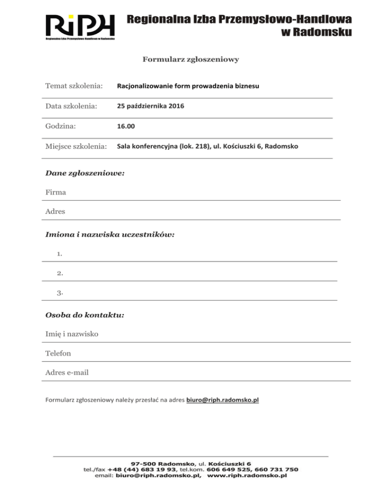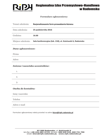 Formularz zgłoszeniowy Temat szkolenia: Racjonalizowanie form prowadzenia biznesu Data szkolenia: 25 października 2016 Godzina: 16.00 Miejsce szkolenia: Sala konferencyjna (lok. 218), ul. Kościuszki 6, Radomsko Dane zgłoszeniowe: Firma Adres Imiona i nazwiska uczestników: 1. 2. 3. Osoba do kontaktu: Imię i nazwisko Telefon Adres e-mail Formularz zgłoszeniowy należy przesłać na adres [email protected]