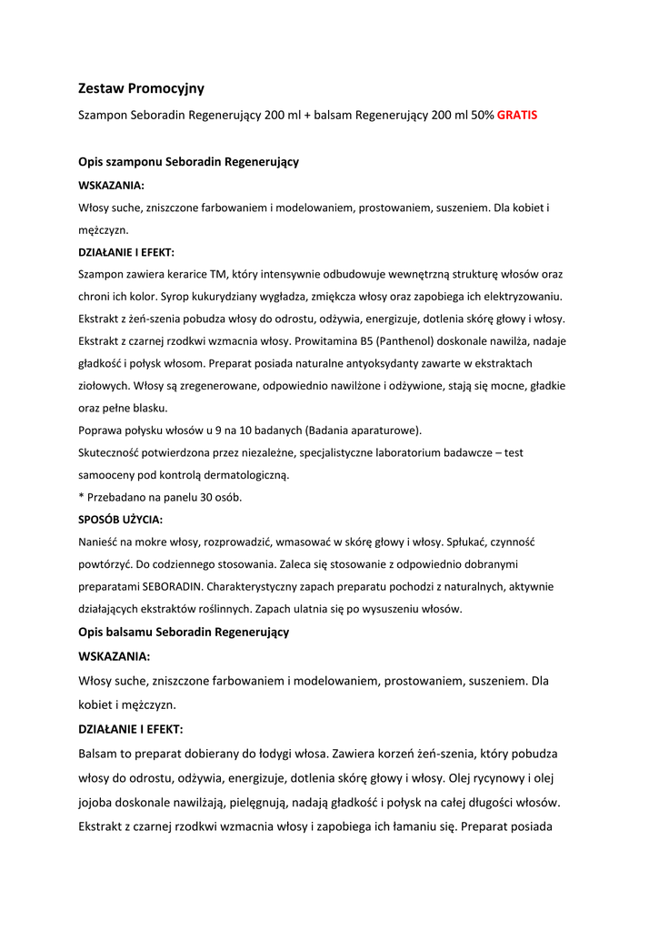 Zestaw Promocyjny Szampon Seboradin Regenerujący 200 ml + balsam Regenerujący 200 ml 50% GRATIS Opis szamponu Seboradin Regenerujący WSKAZANIA: Włosy suche, zniszczone farbowaniem i modelowaniem, prostowaniem, suszeniem. Dla kobiet i mężczyzn. DZIAŁANIE I EFEKT: Szampon zawiera kerarice TM, który intensywnie odbudowuje wewnętrzną strukturę włosów oraz chroni ich kolor. Syrop kukurydziany wygładza, zmiękcza włosy oraz zapobiega ich elektryzowaniu. Ekstrakt z żeń-szenia pobudza włosy do odrostu, odżywia, energizuje, dotlenia skórę głowy i włosy. Ekstrakt z czarnej rzodkwi wzmacnia włosy. Prowitamina B5 (Panthenol) doskonale nawilża, nadaje gładkość i połysk włosom. Preparat posiada naturalne antyoksydanty zawarte w ekstraktach ziołowych. Włosy są zregenerowane, odpowiednio nawilżone i odżywione, stają się mocne, gładkie oraz pełne blasku. Poprawa połysku włosów u 9 na 10 badanych (Badania aparaturowe). Skuteczność potwierdzona przez niezależne, specjalistyczne laboratorium badawcze – test samooceny pod kontrolą dermatologiczną. * Przebadano na panelu 30 osób. SPOSÓB UŻYCIA: Nanieść na mokre włosy, rozprowadzić, wmasować w skórę głowy i włosy. Spłukać, czynność powtórzyć. Do codziennego stosowania. Zaleca się stosowanie z odpowiednio dobranymi preparatami SEBORADIN. Charakterystyczny zapach preparatu pochodzi z naturalnych, aktywnie działających ekstraktów roślinnych. Zapach ulatnia się po wysuszeniu włosów. Opis balsamu Seboradin Regenerujący WSKAZANIA: Włosy suche, zniszczone farbowaniem i modelowaniem, prostowaniem, suszeniem. Dla kobiet i mężczyzn. DZIAŁANIE I EFEKT: Balsam to preparat dobierany do łodygi włosa. Zawiera korzeń żeń-szenia, który pobudza włosy do odrostu, odżywia, energizuje, dotlenia skórę głowy i włosy. Olej rycynowy i olej jojoba doskonale nawilżają, pielęgnują, nadają gładkość i połysk na całej długości włosów. Ekstrakt z czarnej rzodkwi wzmacnia włosy i zapobiega ich łamaniu się. Preparat posiada naturalne antyoksydanty zawarte w ekstraktach ziołowych. Balsam zapobiega elektryzowaniu się włosów, ułatwia rozczesywanie. Włosy są zregenerowane, odżywione, nawilżone, lśniące i miękkie. Skuteczność potwierdzona przez niezależne, specjalistyczne laboratorium badawcze – test samooceny pod kontrolą dermatologiczną. SPOSÓB UŻYCIA: Nanieść na umyte włosy odpowiednio dobranym do skóry głowy szamponem SEBORADIN, rozprowadzić, wmasować we włosy. Spłukać po 3-5 min. Do codziennego stosowania. Nie obciąża włosów. Zaleca się stosowanie z odpowiednio dobranymi preparatami SEBORADIN. Charakterystyczny zapach preparatu pochodzi z naturalnych, aktywnie działających ekstraktów roślinnych. Zapach ulatnia się po wysuszeniu włosów. Pojemność: Szampon Regenerujący – 200 ml Balsam Regenerujący – 200 ml