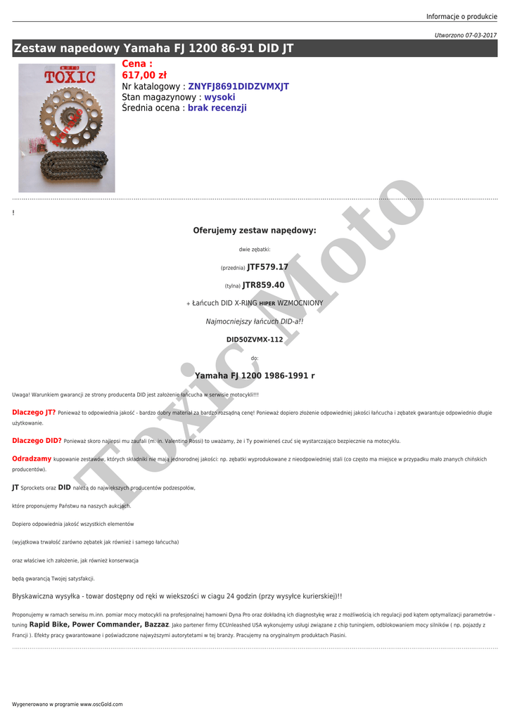 Informacje o produkcie Utworzono 07-03-2017 Zestaw napedowy Yamaha FJ 1200 86-91 DID JT Cena : 617,00 zł ot o Nr katalogowy : ZNYFJ8691DIDZVMXJT Stan magazynowy : wysoki Średnia ocena : brak recenzji ! Oferujemy zestaw napędowy: dwie zębatki: (przednia) + JTR859.40 M (tylna) JTF579.17 Łańcuch DID X-RING HIPER WZMOCNIONY Najmocniejszy łańcuch DID-a!! DID50ZVMX-112 c do: Yamaha FJ 1200 1986-1991 r Dlaczego JT? xi Uwaga! Warunkiem gwarancji ze strony producenta DID jest założenie łańcucha w serwisie motocykli!!! Ponieważ to odpowiednia jakość - bardzo dobry materiał za bardzo rozsądną cenę! Ponieważ dopiero złożenie odpowiedniej jakości łańcucha i zębatek gwarantuje odpowiednio długie użytkowanie. To Dlaczego DID? Ponieważ skoro najlepsi mu zaufali (m. in. Valentino Rossi) to uważamy, że i Ty powinieneś czuć się wystarczająco bezpiecznie na motocyklu. Odradzamy kupowanie zestawów, których składniki nie mają jednorodnej jakości: np. zębatki wyprodukowane z nieodpowiedniej stali (co często ma miejsce w przypadku mało znanych chińskich producentów). JT Sprockets oraz DID należą do największych producentów podzespołów, które proponujemy Państwu na naszych aukcjach. Dopiero odpowiednia jakość wszystkich elementów (wyjątkowa trwałość zarówno zębatek jak również i samego łańcucha) oraz właściwe ich założenie, jak również konserwacja będą gwarancją Twojej satysfakcji. Błyskawiczna wysyłka - towar dostępny od ręki w wiekszości w ciagu 24 godzin (przy wysyłce kurierskiej)!! Proponujemy w ramach serwisu m.inn. pomiar mocy motocykli na profesjonalnej hamowni Dyna Pro oraz dokładną ich diagnostykę wraz z możliwością ich regulacji pod kątem optymalizacji parametrów tuning Rapid Bike, Power Commander, Bazzaz. Jako partener firmy ECUnleashed USA wykonujemy usługi związane z chip tuningiem, odblokowaniem mocy silników ( np. pojazdy z Francji ). Efekty pracy gwarantowane i poświadczone najwyższymi autorytetami w tej branży. Pracujemy na oryginalnym produktach Piasini. Wygenerowano w programie www.oscGold.com