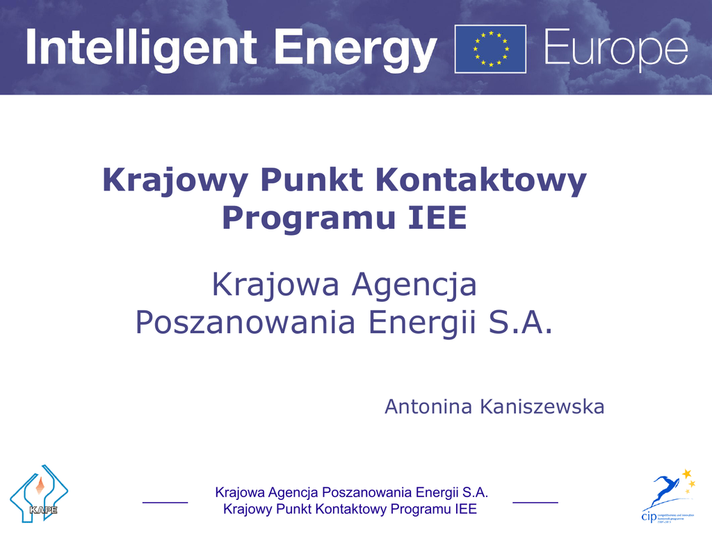Krajowy Punkt Kontaktowy Programu IEE Krajowa Agencja Poszanowania Energii S.A. Antonina Kaniszewska Krajowa Agencja Poszanowania Energii S.A. Krajowy Punkt Kontaktowy Programu IEE Krajowy Punkt Kontaktowy Krajowa Agencja Poszanowania Energii S.A. pełni rolę Krajowego Punktu Kontaktowego: – w latach 1999 – 2002 programu SAVE i ALTENER – od roku 2004 programu Inteligentna Energia – program dla Europy *w roku 2003 polskie podmioty nie brały udziału w programie Krajowa Agencja Poszanowania Energii S.A. Krajowy Punkt Kontaktowy Programu IEE 2 Krajowy Punkt Kontaktowy udział w spotkaniach związanych z programem IEE w Brukseli (dni informacyjne, posiedzenia Komitetu Sterującego, spotkania KPK) organizacja dni informacyjnych i szkoleń dla instytucji zainteresowanych udziałem w programie udział w szkoleniach, konferencjach i warsztatach organizowanych przez inne instytucje Krajowa Agencja Poszanowania Energii S.A. Krajowy Punkt Kontaktowy Programu IEE 3 Krajowy Punkt Kontaktowy tłumaczenie dokumentów roboczych wydanie materiałów informacyjnych przekazywanie zainteresowanym instytucjom informacji na temat programu przygotowanie i aktualizacja strony internetowej www.cip.gov.pl przygotowanie sprawozdań z udziału polskich podmiotów w wezwaniach do składania wniosków pomoc w przygotowaniu wniosków aplikacyjnych Krajowa Agencja Poszanowania Energii S.A. Krajowy Punkt Kontaktowy Programu IEE 4 Krajowy Punkt Kontaktowy Pomysł działania Krajowy Punkt Kontaktowy: udzielanie informacji o IEE pomoc w znalezieniu partnerów doradzanie przy wypełnieniu wniosku aplikacyjnego Znalezienie partnerów (wniosek musi byd złożony przez co najmniej 3 partnerów z 3 różnych krajów UE lub krajów stowarzyszonych) Przygotowanie wniosku aplikacyjnego Złożenie wniosku w Agencji wykonawczej programu CIP w Brukseli Krajowa Agencja Poszanowania Energii S.A. Krajowy Punkt Kontaktowy Programu IEE 5 6 Krajowy Punkt Kontaktowy Krajowy Punkt Kontaktowy: wsparcie w procesie negocjacji warunków umowy z Agencją Wykonawczą Programu Pozytywna ocena wniosku – negocjacje z Agencją Wykonawczą programu CIP w Brukseli Podpisanie kontraktu z Agencja Wykonawczą Programu CIP Krajowy Punkt Kontaktowy: wsparcie w realizacji kontraktu (kwestie finansowe i administracyjne) Realizacja działao zapisanych w kontrakcie Krajowa Agencja Poszanowania Energii S.A. Krajowy Punkt Kontaktowy Programu IEE Negatywna ocena wniosku Kontakt Krajowy Punkt Kontaktowy „Inteligentna Energia – Program dla Europy” Krajowa Agencja Poszanowania Energii S.A. ul. Mokotowska 35 00-560 Warszawa tel. (22) 626-09-10, fax. (22) 626-09-11 www.kape.gov.pl , www.cip.gov.pl/iee-kpkkape e-mail: [email protected] Krajowa Agencja Poszanowania Energii S.A. Krajowy Punkt Kontaktowy Programu IEE 7 Projekty z udziałem podmiotów z Polski Krajowa Agencja Poszanowania Energii S.A. Krajowy Punkt Kontaktowy Programu IEE 8
