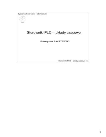 Systemy wbudowane – laboratorium Sterowniki PLC – układy czasowe Przemysław ZAKRZEWSKI Sterowniki PLC – układy czasowe (1) 1 Systemy wbudowane – laboratorium Sterowanie bramą garażową Sterowniki PLC – układy czasowe (2) Należy zaimplementować algorytm sterowania bramą garażową, wykorzystując języki IL, LD i SFC. Wejścia: - OW – otwieranie bramy od wewnątrz, - ZW – zamykanie bramy od wewnątrz, - OZ – otwieranie bramy z zewnętrz, - ZZ – zamykanie bramy z zewnątrz, - S – stop, - F – fotokomórka, - LG – czujnik położenia bramy – góra, - LD – czujnik położenia bramy – dół, Wyjścia: - MG – silnik – góra, - MD – silnik – dół, - RB – sygnalizacja ruchu bramy: RB = 1 przez 1 [s] i RB = 0 przez 0,5 [s]. 2 Systemy wbudowane – laboratorium Przebieg procesu • Otwieranie bramy • Zamykanie bramy Sterowniki PLC – układy czasowe (3) Otwieranie/zamykanie bramy może być realizowane albo od wewnątrz albo z zewnątrz. Do wyłączenia silnika sterującego ruchem bramy służy przycisk STOP. Jeżeli w trakcie zamykania bramy znajdzie się pod nią jakaś przeszkoda wykryta przez fotokomórkę, wówczas brama się zatrzymuje i po upływie 2 [s] otwiera się. Stan otwarcia/zamknięcia bramy sygnalizują czujniki położenia bramy. 3 Systemy wbudowane – laboratorium Wymagania • Warunki początkowe • Sygnalizacja stanów alarmowych Sterowniki PLC – układy czasowe (4) Należy przyjąć następujące warunki początkowe: - brama zamknięta: LG = 1, LD = 1, - silnik bramy wyłączony: MG = 0, MD = 0, RB = 0. Użytkownikowi należy sygnalizować stany alarmowe – anormalne wskazania czujników położenia bramy (np. LG = 0, LD = 1). UWAGA: Po wystąpieniu stanu alarmowego warunkiem ponownego uruchomienia algorytmu sterowania bramą garażową jest przywrócenie warunków początkowych. 4 Systemy wbudowane – laboratorium Algorytm sterowania • Sterowanie otwieraniem bramy • Sterowanie zamykaniem bramy Sterowniki PLC – układy czasowe (5) W przypadku sterowania bramą garażową należy poddać analizie warunki jakie muszą być spełnione, aby można przeprowadzić otwieranie/zamykanie bramy. Np. algorytm sterowania otwieraniem bramy: - sprawdzenie warunków początkowych, - jeżeli warunki początkowe zostały spełnione i pojawiło się żądanie otwarcia bramy od wewnątrz (OW = 1) lub otwarcie bramy z zewnątrz (OZ = 1), to rozpoczynamy otwieranie bramy (MG = 1), - po całkowitym otwarciu bramy (LG = 0, LD = 0), wyłączamy otwieranie bramy (MG = 0). Analogicznie należy rozważyć sterowanie pozostałymi elementami wykonawczymi oraz przeanalizować wszystkie sytuacje alarmowe. 5