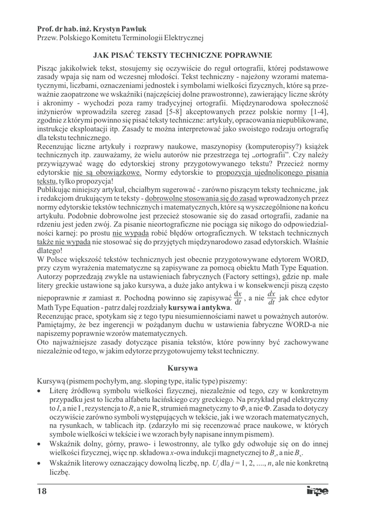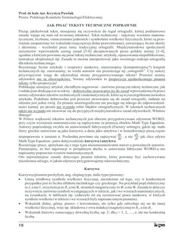 Prof. dr hab. inż. Krystyn Pawluk Przew. Polskiego Komitetu Terminologii Elektrycznej JAK PISAĆ TEKSTY TECHNICZNE POPRAWNIE Pisząc jakikolwiek tekst, stosujemy się oczywiście do reguł ortografii, której podstawowe zasady wpaja się nam od wczesnej młodości. Tekst techniczny - najeżony wzorami matematycznymi, liczbami, oznaczeniami jednostek i symbolami wielkości fizycznych, które są przeważnie zaopatrzone we wskaźniki (najczęściej dolne prawostronne), zawierający liczne skróty i akronimy - wychodzi poza ramy tradycyjnej ortografii. Międzynarodowa społeczność inżynierów wprowadziła szereg zasad [5-8] akceptowanych przez polskie normy [1-4], zgodnie z którymi powinno się pisać teksty techniczne: artykuły, opracowania niepublikowane, instrukcje eksploatacji itp. Zasady te można interpretować jako swoistego rodzaju ortografię dla tekstu technicznego. Recenzując liczne artykuły i rozprawy naukowe, maszynopisy (komputeropisy?) książek technicznych itp. zauważamy, że wielu autorów nie przestrzega tej ”ortografii”. Czy należy przywiązywać wagę do edytorskiej strony przygotowywanego tekstu? Przecież normy edytorskie nie są obowiązkowe. Normy edytorskie to propozycja ujednoliconego pisania tekstu, tylko propozycja! Publikując niniejszy artykuł, chciałbym sugerować - zarówno piszącym teksty techniczne, jak i redakcjom drukującym te teksty - dobrowolne stosowania się do zasad wprowadzonych przez normy edytorskie tekstów technicznych i matematycznych, które są wyszczególnione na końcu artykułu. Podobnie dobrowolne jest przecież stosowanie się do zasad ortografii, zadanie na rdzeniu jest jeden zwój. Za pisanie nieortograficzne nie pociąga się nikogo do odpowiedzialności karnej: po prostu nie wypada robić błędów ortograficznych. W tekstach technicznych także nie wypada nie stosować się do przyjętych międzynarodowo zasad edytorskich. Właśnie dlatego! W Polsce większość tekstów technicznych jest obecnie przygotowywane edytorem WORD, przy czym wyrażenia matematyczne są zapisywane za pomocą obiektu Math Type Equation. Autorzy poprzedzają zwykle na ustawieniach fabrycznych (Factory settings), gdzie np. małe litery greckie ustawione są jako kursywa, a duże jako antykwa i w konsekwencji piszą często dx dx niepoprawnie π zamiast π. Pochodną powinno się zapisywać00, a nie 00jak chce edytor dt dt Math Type Equation - patrz dalej rozdziały kursywa i antykwa. Recenzując prace, spotykam się z tego typu niesumiennościami nawet u poważnych autorów. Pamiętajmy, że bez ingerencji w pożądanym duchu w ustawienia fabryczne WORD-a nie napiszemy poprawnie wzorów matematycznych. Oto najważniejsze zasady dotyczące pisania tekstów, które powinny być zachowywane niezależnie od tego, w jakim edytorze przygotowujemy tekst techniczny. Kursywa Kursywą (pismem pochyłym, ang. sloping type, italic type) piszemy: · Literę źródłową symbolu wielkości fizycznej, niezależnie od tego, czy w konkretnym przypadku jest to liczba alfabetu łacińskiego czy greckiego. Na przykład prąd elektryczny to I, a nie I , rezystencja to R, a nie R, strumień magnetyczny to Φ, a nie Φ. Zasada to dotyczy oczywiście zarówno symboli występujących w tekście, jak i we wzorach matematycznych, na rysunkach, w tablicach itp. (zdarzyło mi się recenzować prace naukowe, w których symbole wielkości w tekście i we wzorach były napisane innym pismem). · Wskaźnik dolny, górny, prawo- i lewostronny, ale tylko gdy odwołuje się on do innej wielkości fizycznej, więc np. składowa x-owa indukcji magnetycznej to Bx, a nie Bx. · Wskaźnik literowy oznaczający dowolną liczbę, np. Uj dla j = 1, 2, ...., n, ale nie konkretną liczbę. 18 · O gólny symbol funkcji, np. f lub g, ale nie symbol konkretnej funkcji. · Symbol macierzy, której elementami są wielkości fizyczne, przy czym stosujemy czcionkę półgrubą (bold), np. L = 00 a nie L, jak często pisze się w tekstach matematycznych. · Symbol wektora reprezentującego wielkość fizyczną piszemy zasadniczo kursywą półgrubą, np. H, ale przy konflikcie z symbolem macierzy pisanej tak samo trzeba pisać H lub H. Antykwa Antykwą (pismem prostym, ang. upright type, roman type) piszemy: · Cyfry. · Symbole konkretnych funkcji, np. sin ωt, a nie sin ωt. 0 · Operatory, np. operatory różniczkowania (zwyczajne i cząstkowe) to d i ¶ , a nie d ani ¶ - patrz wcześniej podany prawidłowy zapis pochodnej, a także Ö -1 = j, a nie j: część rzeczywista liczby zespolonej to Re, a nie Re. · Symbole liczb o konkretnej wartości, np. 3, 14.... = π, a nie π, i podobnie 2,718.... = e , a nie e. · Indeksy, jeśli odwołują się: - do obiektów (fizycznych, geometrycznych), np. natężenie pola elektrycznego w punkcie A to EA, a nie EA, - do zjawisk lub stanów fizycznych, np. prąd zwarcia to Ik, a nie Ik, i podobnie moc mechaniczna to Pm, a nie Pm, - do nazwisk, np. temperatura Curie to TC, a nie TC, - do charakteru wielkości symbolizowanej przez literę źródłową, np. wartość szczytowa napięcia to Um , a nie Um . · Oznaczenia jednostek miar, np. mikrowolt oznaczamy μV, a nie μV. Jednostki miar Jak wspomniano powyżej, oznaczenia jednostek miar pisze się zawsze antykwą. Zapisując konkretną wartość fizyczną, podaje się jej wartość liczbową i jednostkę miary; dobrze jest zachować tu następujące zasady: · Zapisując wartość liczbową cyframi, wpisujemy po spacji oznaczenie jednostki miar, a nie jej nazwę, więc poprawnie jest na przykład 100 V a niepoprawnie 100 woltów, a jeszcze gorzej 100 wolt, bo jednostki w języku polskim podlegają deklinacji, podobnie jak rzeczowniki. · Zapisując wartość liczbową słowami, dopisujemy po niej nazwę, a nie oznaczenie jednostki, więc poprawnie jest sto woltów a niepoprawnie sto V. O powyższej zasadzie trzeba szczególnie pamiętać w przypadku jednostek miar, których oznaczenie jest identyczne