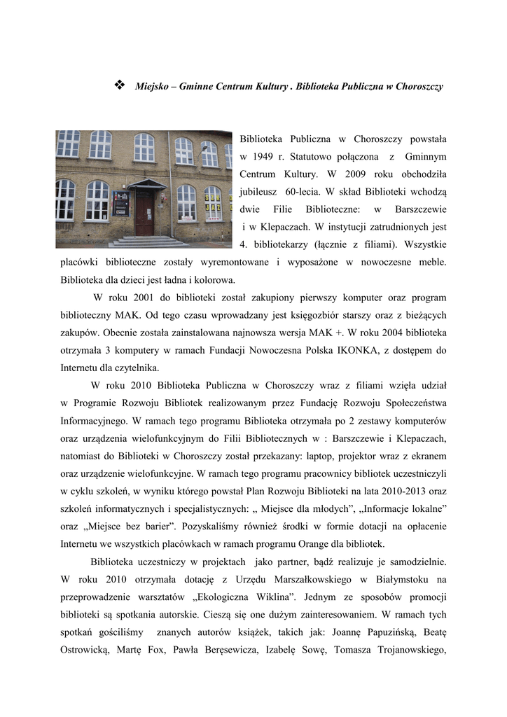 Miejsko – Gminne Centrum Kultury . Biblioteka Publiczna w Choroszczy Biblioteka Publiczna w Choroszczy powstała w 1949 r. Statutowo połączona z Gminnym Centrum Kultury. W 2009 roku obchodziła jubileusz 60-lecia. W skład Biblioteki wchodzą dwie Filie Biblioteczne: w Barszczewie i w Klepaczach. W instytucji zatrudnionych jest 4. bibliotekarzy (łącznie z filiami). Wszystkie placówki biblioteczne zostały wyremontowane i wyposażone w nowoczesne meble. Biblioteka dla dzieci jest ładna i kolorowa. W roku 2001 do biblioteki został zakupiony pierwszy komputer oraz program biblioteczny MAK. Od tego czasu wprowadzany jest księgozbiór starszy oraz z bieżących zakupów. Obecnie została zainstalowana najnowsza wersja MAK +. W roku 2004 biblioteka otrzymała 3 komputery w ramach Fundacji Nowoczesna Polska IKONKA, z dostępem do Internetu dla czytelnika. W roku 2010 Biblioteka Publiczna w Choroszczy wraz z filiami wzięła udział w Programie Rozwoju Bibliotek realizowanym przez Fundację Rozwoju Społeczeństwa Informacyjnego. W ramach tego programu Biblioteka otrzymała po 2 zestawy komputerów oraz urządzenia wielofunkcyjnym do Filii Bibliotecznych w : Barszczewie i Klepaczach, natomiast do Biblioteki w Choroszczy został przekazany: laptop, projektor wraz z ekranem oraz urządzenie wielofunkcyjne. W ramach tego programu pracownicy bibliotek uczestniczyli w cyklu szkoleń, w wyniku którego powstał Plan Rozwoju Biblioteki na lata 2010-2013 oraz szkoleń informatycznych i specjalistycznych: „ Miejsce dla młodych”, „Informacje lokalne” oraz „Miejsce bez barier”. Pozyskaliśmy również środki w formie dotacji na opłacenie Internetu we wszystkich placówkach w ramach programu Orange dla bibliotek. Biblioteka uczestniczy w projektach jako partner, bądź realizuje je samodzielnie. W roku 2010 otrzymała dotację z Urzędu Marszałkowskiego w Białymstoku na przeprowadzenie warsztatów „Ekologiczna Wiklina”. Jednym ze sposobów promocji biblioteki są spotkania autorskie. Cieszą się one dużym zainteresowaniem. W ramach tych spotkań gościliśmy znanych autorów książek, takich jak: Joannę Papuzińską, Beatę Ostrowicką, Martę Fox, Pawła Beręsewicza, Izabelę Sowę, Tomasza Trojanowskiego, Grzegorz Kasdepke, Krzysztofa Kamińskiego, Barbarę Gawryluk, Izabelę Klebańską, Wiolettę Piasecką, Jana Sienkiewicza, Zofię Olek-Redlarską, Joannę Olech, Elżbietę Michalską, Katarzynę Zdanowicz, Antoniego Hukałowicza, Janusza Koronkiewicza, Jana Leończuka. W maju 2009 roku w naszej bibliotece rozpoczął działalność Dyskusyjny Klub Książki. Jest to projekt powstały z inicjatywy Instytutu Książki i British Council. Do klubu należy 18 osób. Klubowicze mieli okazję spotkać się z : Roksanę Jędrzejewską-Wróbel, Leszka Mazana, znanego dziennikarza i publicystę z Krakowa, Janusza Koronkiewicza, autora książki „Pogaduszki przy piecu”, Zuzannę Celmer, Barbarę Kosmowską oraz Wiesława Szymańskiego. Raz w tygodniu odbywają są zajęcia biblioteczne dla dzieci. Są to formy różne zajęć recytatorskie, : plastyczne, literackie, w formie zabawy i inne. Celem organizowania tych zajęć jest zachęcenie dzieci do korzystania z biblioteki, rozbudzenie ich wyobraźni, zainteresowanie przeczytanych książek oraz treścią dobra zabawa. Biblioteka Publiczna w Choroszczy współpracuje z Biblioteką Publiczną Powiatu Białostockiego. Działania i praca Biblioteki zostały nagrodzone, otrzymała w 2009 roku (w drugiej edycji rankingu bibliotek ) I miejsce w kategorii bibliotek miejsko-gminnych na najaktywniejszą bibliotekę w środowisku lokalnym powiatu białostockiego organizowanym przez Książnicę Podlaską – Bibliotekę Powiatu Białostockiego im. Łukasza Górnickiego w Białymstoku. Szeroki zakres działań naszej placówki i różnorodność form pracy z czytelnikiem sprawiła, że Biblioteka współtworzy oraz skupia życie kulturalne Choroszczy i jest miejscem ważnym dla wszystkich mieszkańców miasta i gminy.
