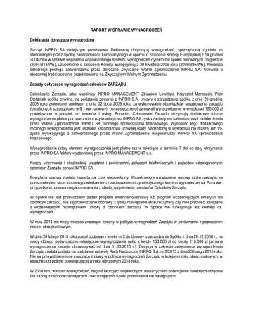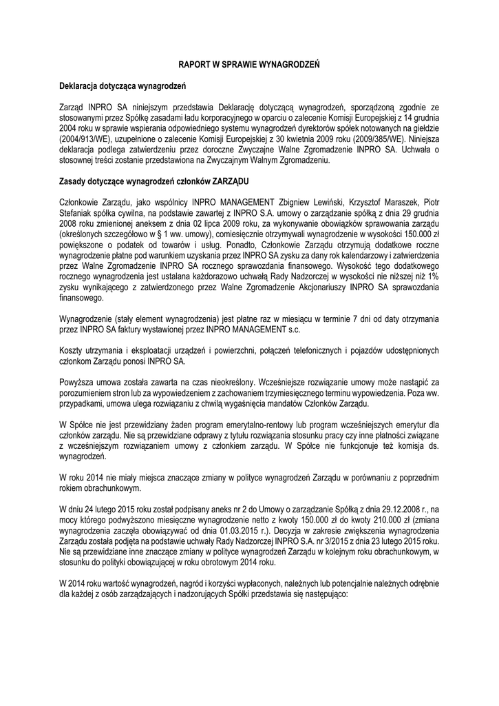 RAPORT W SPRAWIE WYNAGRODZEŃ Deklaracja dotycząca wynagrodzeń Zarząd INPRO SA niniejszym przedstawia Deklarację dotyczącą wynagrodzeń, sporządzoną zgodnie ze stosowanymi przez Spółkę zasadami ładu korporacyjnego w oparciu o zalecenie Komisji Europejskiej z 14 grudnia 2004 roku w sprawie wspierania odpowiedniego systemu wynagrodzeń dyrektorów spółek notowanych na giełdzie (2004/913/WE), uzupełnione o zalecenie Komisji Europejskiej z 30 kwietnia 2009 roku (2009/385/WE). Niniejsza deklaracja podlega zatwierdzeniu przez doroczne Zwyczajne Walne Zgromadzenie INPRO SA. Uchwała o stosownej treści zostanie przedstawiona na Zwyczajnym Walnym Zgromadzeniu. Zasady dotyczące wynagrodzeń członków ZARZĄDU Członkowie Zarządu, jako wspólnicy INPRO MANAGEMENT Zbigniew Lewiński, Krzysztof Maraszek, Piotr Stefaniak spółka cywilna, na podstawie zawartej z INPRO S.A. umowy o zarządzanie spółką z dnia 29 grudnia 2008 roku zmienionej aneksem z dnia 02 lipca 2009 roku, za wykonywanie obowiązków sprawowania zarządu (określonych szczegółowo w § 1 ww. umowy), comiesięcznie otrzymywali wynagrodzenie w wysokości 150.000 zł powiększone o podatek od towarów i usług. Ponadto, Członkowie Zarządu otrzymują dodatkowe roczne wynagrodzenie płatne pod warunkiem uzyskania przez INPRO SA zysku za dany rok kalendarzowy i zatwierdzenia przez Walne Zgromadzenie INPRO SA rocznego sprawozdania finansowego. Wysokość tego dodatkowego rocznego wynagrodzenia jest ustalana każdorazowo uchwałą Rady Nadzorczej w wysokości nie niższej niż 1% zysku wynikającego z zatwierdzonego przez Walne Zgromadzenie Akcjonariuszy INPRO SA sprawozdania finansowego. Wynagrodzenie (stały element wynagrodzenia) jest płatne raz w miesiącu w terminie 7 dni od daty otrzymania przez INPRO SA faktury wystawionej przez INPRO MANAGEMENT s.c. Koszty utrzymania i eksploatacji urządzeń i powierzchni, połączeń telefonicznych i pojazdów udostępnionych członkom Zarządu ponosi INPRO SA. Powyższa umowa została zawarta na czas nieokreślony. Wcześniejsze rozwiązanie umowy może nastąpić za porozumieniem stron lub za wypowiedzeniem z zachowaniem trzymiesięcznego terminu wypowiedzenia. Poza ww. przypadkami, umowa ulega rozwiązaniu z chwilą wygaśnięcia mandatów Członków Zarządu. W Spółce nie jest przewidziany żaden program emerytalno-rentowy lub program wcześniejszych emerytur dla członków zarządu. Nie są przewidziane odprawy z tytułu rozwiązania stosunku pracy czy inne płatności związane z wcześniejszym rozwiązaniem umowy z członkiem zarządu. W Spółce nie funkcjonuje też komisja ds. wynagrodzeń. W roku 2014 nie miały miejsca znaczące zmiany w polityce wynagrodzeń Zarządu w porównaniu z poprzednim rokiem obrachunkowym. W dniu 24 lutego 2015 roku został podpisany aneks nr 2 do Umowy o zarządzanie Spółką z dnia 29.12.2008 r., na mocy którego podwyższono miesięczne wynagrodzenie netto z kwoty 150.000 zł do kwoty 210.000 zł (zmiana wynagrodzenia zaczęła obowiązywać od dnia 01.03.2015 r.). Decyzja w zakresie zwiększenia wynagrodzenia Zarządu została podjęta na podstawie uchwały Rady Nadzorczej INPRO S.A. nr 3/2015 z dnia 23 lutego 2015 roku. Nie są przewidziane inne znaczące zmiany w polityce wynagrodzeń Zarządu w kolejnym roku obrachunkowym, w stosunku do polityki obowiązującej w roku obrotowym 2014 roku. W 2014 roku wartość wynagrodzeń, nagród i korzyści wypłaconych, należnych lub potencjalnie należnych odrębnie dla każdej z osób zarządzających i nadzorujących Spółki przedstawia się następująco: Tabela wartości wynagrodzeń wypłaconych członkom organów INPRO SA w 2014 roku. W spółce 1 ZARZĄD wynagrodzenie z umowy cywilnoprawnej Management s.c. Piotr Stefaniak Dywidendy wypłacone w 2014 r. 846 000 Krzysztof Maraszek 651 811 651 811 Zbigniew Lewiński 651 811 1 001 000 1 955 433 2 793 000 RAZEM RADA NADZORCZA W 2. GRUPIE Piotr Stefaniak 3 Wynagrodzenie ze stosunku pracy w INPRO SA W innych podmiotach grupy 946 000 Krzysztof Maraszek 39 600,00 39 600,00 Zbigniew Lewiński 39 600,00 RAZEM RADA NADZORCZA INPRO SA Jerzy Glanc 118 800,00 17 000,00 Krzysztof Gąsak 14 000,00 Robert Maraszek 12 000,00 Wojciech Stefaniak 7 600,00 Szymon Lewiński 7 600,00 166 499,50 27 642,72 RAZEM 58 200,00 194 142,22 RAZEM 2 013 633 194 142,22 2 793 000 118 800,00 Zasady dotyczące wynagrodzeń członków RADY NADZORCZEJ Członkowie Rady Nadzorczej Spółki, zgodnie z § 10 ust. 15 Statutu Spółki, otrzymują wynagrodzenie w wysokości ustalonej przez Walne Zgromadzenie. W 2014 roku obowiązujące były następujące stawki wynagrodzenia: Na podstawie Uchwały nr 23/2011 z dnia 16 czerwca 2011 roku Zwyczajnego Walnego Zgromadzenia INPRO SA w sprawie ustalenia wynagrodzeń członków Rady Nadzorczej INPRO SA ustalono wynagrodzenie członków Rady Nadzorczej w następującej wysokości: - wynagrodzenie Przewodniczącego Rady Nadzorczej w wysokości 3.500,00 zł brutto za każde posiedzenie Rady Nadzorczej - wynagrodzenie Wiceprzewodniczącego Rady Nadzorczej w wysokości 3.000,00 zł brutto za każde posiedzenie Rady Nadzorczej - wynagrodzenie Sekretarza Rady Nadzorczej w wysokości 2.500,00 zł brutto za każde posiedzenie Rady Nadzorczej, - wynagrodzenie poszczególnych Członków Rady Nadzorczej, niepełniących funkcji Przewodniczącego, Wiceprzewodniczącego czy Sekretarza Rady Nadzorczej, w wysokości 2.300,00 zł brutto za każde posiedzenie Rady Nadzorczej. Powyższe wynagrodzenie zostało zmienione na mocy Uchwały nr 23/2014 z dnia 11 czerwca 2014 roku Zwyczajnego Walnego Zgromadzenia INPRO SA w sprawie ustalenia wynagrodzeń członków Rady Nadzorczej INPRO SA: - wynagrodzenie Przewodniczącego Rady Nadzorczej w wysokości 5.000,00 zł brutto za każde posiedzenie Rady Nadzorczej - wynagrodzenie Wiceprzewodniczącego Rady Nadzorczej w wysokości 4.000,00 zł brutto za każde posiedzenie Rady Nadzorczej wynagrodzenie Sekretarza Ra