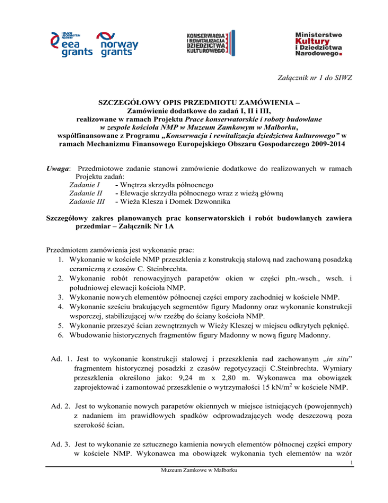 Załącznik nr 1 do SIWZ SZCZEGÓŁOWY OPIS PRZEDMIOTU ZAMÓWIENIA – Zamówienie dodatkowe do zadań I, II i III, realizowane w ramach Projektu Prace konserwatorskie i roboty budowlane w zespole kościoła NMP w Muzeum Zamkowym w Malborku, współfinansowane z Programu „Konserwacja i rewitalizacja dziedzictwa kulturowego” w ramach Mechanizmu Finansowego Europejskiego Obszaru Gospodarczego 2009-2014 Uwaga: Przedmiotowe zadanie stanowi zamówienie dodatkowe do realizowanych w ramach Projektu zadań: Zadanie I - Wnętrza skrzydła północnego Zadanie II - Elewacje skrzydła północnego wraz z wieżą główną Zadanie III - Wieża Klesza i Domek Dzwonnika Szczegółowy zakres planowanych prac konserwatorskich i robót budowlanych zawiera przedmiar – Załącznik Nr 1A Przedmiotem zamówienia jest wykonanie prac: 1. Wykonanie w kościele NMP przeszklenia z konstrukcją stalową nad zachowaną posadzką ceramiczną z czasów C. Steinbrechta. 2. Wykonanie robót renowacyjnych parapetów okien w części płn.-wsch., wsch. i południowej elewacji kościoła NMP. 3. Wykonanie nowych elementów północnej części empory zachodniej w kościele NMP. 4. Wykonanie sześciu brakujących segmentów figury Madonny oraz wykonanie konstrukcji wsporczej, stabilizującej w/w rzeźbę do ściany kościoła NMP. 5. Wykonanie przeszyć ścian zewnętrznych w Wieży Kleszej w miejscu odkrytych pęknięć. 6. Wbudowanie historycznych fragmentów figury Madonny w nową figurę Madonny. Ad. 1. Jest to wykonanie konstrukcji stalowej i przeszklenia nad zachowanym „in situ” fragmentem historycznej posadzki z czasów regotycyzacji C.Steinbrechta. Wymiary przeszklenia określono jako: 9,24 m x 2,80 m. Wykonawca ma obowiązek zaprojektować i zamontować przeszklenie o wytrzymałości 15 kN/m2 w kościele NMP. Ad. 2. Jest to wykonanie nowych parapetów okiennych w miejsce istniejących (powojennych) z nadaniem im prawidłowych spadków odprowadzających wodę deszczową poza szerokość ścian. Ad. 3. Jest to wykonanie ze sztucznego kamienia nowych elementów północnej części empory w kościele NMP. Wykonawca ma obowiązek wykonania tych elementów na wzór 1 Muzeum Zamkowe w Malborku ________________________________________________________________________________________________________ Znak sprawy Zp 15/2015 ________________________________________________________________________________________________________ elementów południowej części empory i przekazania ich MZM w celu wbudowania w obiekt przez Wykonawcę prac realizowanych we wnętrzach skrzydła północnego. Ad. 4. Jest to wykonanie z kamienia sztucznego sześciu elementów figury Madonny brakujących do jej scalenia, po inwentaryzacji historycznych elementów Madonny oraz wykonanie konstrukcji wsporczej, na której będą oparte wszystkie scalone elementy figury. Do obowiązku Wykonawcy należy zaprojektowanie w/w konstrukcji i uzgodnienie jej z Zamawiającym i Wykonawcą prac realizowanych na elewacjach kościoła NMP. Ad. 5. Jest to wykonanie przeszyć ścian zewnętrznych Wieży Kleszej w miejscach pęknięć odkrytych w trakcie robót konserwatorskich, w ilościach podanych w załączonym przedmiarze. Ad. 6. Jest to inwentaryzacja, konserwacja, scalenie i wbudowanie historycznych fragmentów figury Madonny w nową figurę Madonny wykonywaną przez Wykonawcę prac elewacyjnych kościoła NMP. opracował: Mirosław Jonakowski Leszek Natora Lipiec 2015r. 2 Muzeum Zamkowe w Malborku