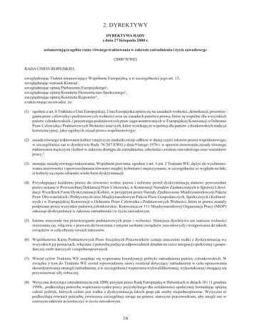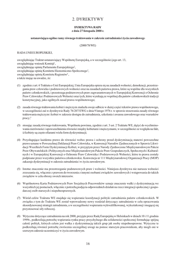 2. DYREKTYWY DYREKTYWA RADY z dnia 27 listopada 2000 r. ustanawiaj¹ca ogólne ramy równego traktowania w zakresie zatrudnienia i ¿ycia zawodowego (2000/78/WE) RADA UNII EUROPEJSKIEJ, uwzglêdniaj¹c Traktat ustanawiaj¹cy Wspólnotê Europejsk¹, a w szczególnoci jego art. 13, uwzglêdniaj¹c wniosek Komisji1, uwzglêdniaj¹c opiniê Parlamentu Europejskiego2, uwzglêdniaj¹c opiniê Komitetu Ekonomiczno-Spo³ecznego 3, uwzglêdniaj¹c opiniê Komitetu Regionów4 , a tak¿e maj¹c na uwadze, ¿e: (1) zgodnie z art. 6 Traktatu o Unii Europejskiej, Unia Europejska opiera siê na zasadach wolnoci, demokracji, przestrzegania praw cz³owieka i podstawowych wolnoci oraz na zasadach pañstwa prawa, które s¹ wspólne dla wszystkich pañstw cz³onkowskich, i przestrzega podstawowych praw zagwarantowanych w Europejskiej Konwencji o Ochronie Praw Cz³owieka i Podstawowych Wolnoci oraz tych, które wynikaj¹ ze wspólnej dla pañstw cz³onkowskich tradycji konstytucyjnej, jako ogólnych zasad prawa wspólnotowego; (2) zasada równego traktowania kobiet i mê¿czyzn znalaz³a swoje odbicie w du¿ej czêci tekstów prawa wspólnotowego, w szczególnoci za w dyrektywie Rady 76/207/EWG z dnia 9 lutego 1976 r. w sprawie stosowania zasady równego traktowania mê¿czyzn i kobiet w zakresie dostêpu do zatrudnienia, szkolenia i awansu zawodowego oraz warunków pracy;5 (3) stosuj¹c zasadê równego traktowania, Wspólnota powinna, zgodnie z art. 3 ust. 2 Traktatu WE, d¹¿yæ do wyeliminowania nierównoci i upowszechnienia równoci miêdzy kobietami i mê¿czyznami, w szczególnoci ze wzglêdu na fakt, i¿ kobiety s¹ czêsto ofiarami wielu form dyskryminacji; (4) Przys³uguj¹ce ka¿demu prawo do równoci wobec prawa i ochrony przed dyskryminacj¹ stanowi powszechne prawo uznane w Powszechnej Deklaracji Praw Cz³owieka, w Konwencji Narodów Zjednoczonych w Sprawie Likwidacji Wszelkich Form Dyskryminacji Kobiet, w przyjêtym przez Narody Zjednoczone Miêdzynarodowym Pakcie Praw Obywatelskich i Politycznych oraz Miêdzynarodowym Pakcie Praw Gospodarczych, Spo³ecznych i Kulturalnych i w Europejskiej Konwencji o Ochronie Praw Cz³owieka i Podstawowych Wolnoci, które to prawa zosta³y podpisane przez wszystkie pañstwa cz³onkowskie. Konwencja nr 111 Miêdzynarodowej Organizacji Pracy (MOP) zakazuje dyskryminacji w zakresie zatrudnienia i w ¿yciu zawodowym. (5) Istotne znaczenie ma przestrzeganie podstawowych praw i wolnoci. Niniejsza dyrektywa nie narusza wolnoci zrzeszania siê, w³¹cznie z prawem do tworzenia z innymi osobami zwi¹zków zawodowych i wstêpowania do takich zwi¹zków w celu obrony swoich interesów. (6) Wspólnotowa Karta Podstawowych Praw Socjalnych Pracowników uznaje znaczenie walki z dyskryminacj¹ we wszystkich jej postaciach, w³¹cznie z potrzeb¹ podjêcia odpowiednich dzia³añ na rzecz integracji spo³ecznej i gospodarczej osób starszych i niepe³nosprawnych. (7) Wród celów Traktatu WE znajduje siê wspieranie koordynacji polityki zatrudnienia pañstw cz³onkowskich. W zwi¹zku z tym do Traktatu WE zosta³ wprowadzony nowy rozdzia³ dotycz¹cy zatrudnienia w celu opracowania skoordynowanej strategii zatrudnienia, a w szczególnoci wspierania wykwalifikowanej, wykszta³conej i mog¹cej siê przystosowaæ si³y roboczej. (8) Wytyczne dotycz¹ce zatrudnienia na rok 2000, przyjête przez Radê Europejsk¹ w Helsinkach w dniach 10 i 11 grudnia 1999r., podkrelaj¹ potrzebê wspierania rynku pracy przychylnego dla solidarnoci spo³ecznej formu³uj¹c spójn¹ ca³oæ polityk, których celem jest walka z dyskryminacj¹ takich grup jak osoby niepe³nosprawne. Wytyczne te podkrelaj¹ równie¿ potrzebê zwrócenia szczególnej uwagi na pomoc starszym pracownikom, aby mogli oni w szerszym zakresie uczestniczyæ w ¿yciu zawodowym. 16 (9) Zatrudnienie i praca s¹ podstawowymi elementami maj¹cymi zapewniæ równoæ szans dla wszystkich i w szerokim zakresie przyczyniaj¹ siê do pe³nego uczestnictwa obywateli w ¿yciu, gospodarczym, kulturalnym i spo³ecznym oraz do ich rozwoju. (10) W dniu 29 czerwca 2000r. Rada przyjê³a dyrektywê w sprawie stosowania zasady równego traktowania osób bez wzglêdu na pochodzenie rasowe lub etniczne6, która ju¿ zapewnia ochronê przed tego rodzaju dyskryminacj¹ na polu zatrudnienia i pracy. (11) Dyskryminacja ze wzglêdu na religiê lub przekonania, niepe³nosprawnoæ, wiek lub orientacjê seksualn¹ mo¿e byæ przeszkod¹ w realizacji celów Traktatu WE, w szczególnoci w zakresie zatrudnienia i zabezpieczenia spo³ecznego, podnoszenia poziomu i jakoci ¿ycia, spójnoci gospodarczej i spo³ecznej, solidarnoci i wolnego przep³ywu osób. (12) W tym celu wszelka dyskryminacja ze wzglêdu na wyznawan¹ religiê lub przekonania, niepe³nosprawnoæ, wiek lub orientacjê seksualn¹ w zakresie regulowanym niniejsz¹ dyrektyw¹ powinna byæ zakazana na ca³ym obszarze Wspólnoty. Zakaz dyskryminacji powinien równie¿ dotyczyæ obywateli pañstw trzecich, ale nie obejmie on odmiennego traktowania ze wzglêdu na narodowoæ i nie narusza przepisów reguluj¹cych wjazd i pobyt obywateli pañstw trzecich oraz ich dostêp do zatrudnienia i pracy. (13) Niniejszej procedury nie stosuje siê do uregulowañ w zakresie ubezpieczenia i zabezpieczenia spo³ecznego, których korzyci nie s¹ to¿same z dochodami w znaczeniu nadanym temu terminowi dla celów stosowania art. 141 Traktatu WE ani do wszelkiego rodzaju p³atnoci dokonywanych przez pañstwo, których celem jest dostêp do zatrudnienia lub utrzymanie zatrudnienia. (14) Niniejsza dyrektywa nie narusza przepisów krajowych okrelaj¹cych wiek emerytalny. (15) Ocena faktów, na podstawie których mo¿na wnosiæ o wyst¹pieniu bezporedniej i poredniej dyskryminacji nale¿y do s¹du lub innego w³aciwego organu krajowego, zgodnie z prawem krajowym lub praktyk¹ krajow¹, które mog¹ stanowiæ, w szczególnoci, ¿e fakt wystêpowania dyskryminacji poredniej mo¿na udowodniæ z wykorzystaniem wszelkich rodk