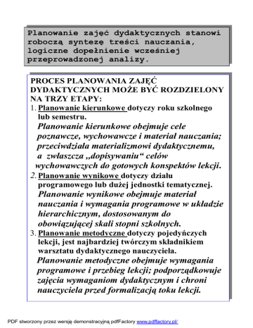 Planowanie zajęć dydaktycznych stanowi roboczą syntezę treści nauczania, logiczne dopełnienie wcześniej przeprowadzonej analizy. PROCES PLANOWANIA ZAJĘĆ DYDAKTYCZNYCH MOŻE BYĆ ROZDZIELONY NA TRZY ETAPY: 1. Planowanie kierunkowe dotyczy roku szkolnego lub semestru. Planowanie kierunkowe obejmuje cele poznawcze, wychowawcze i materiał nauczania; przeciwdziała materializmowi dydaktycznemu, a zwłaszcza ,,dopisywaniu“ celów wychowawczych do gotowych konspektów lekcji. 2. Planowanie wynikowe dotyczy działu programowego lub dużej jednostki tematycznej. Planowanie wynikowe obejmuje materiał nauczania i wymagania programowe w układzie hierarchicznym, dostosowanym do obowiązującej skali stopni szkolnych. 3. Planowanie metodyczne dotyczy pojedyńczych lekcji, jest najbardziej twórczym składnikiem warsztatu dydaktycznego nauczyciela. Planowanie metodyczne obejmuje wymagania programowe i przebieg lekcji; podporządkowuje zajęcia wymaganiom dydaktycznym i chroni nauczyciela przed formalizacją toku lekcji. PDF stworzony przez wersję demonstracyjną pdfFactory www.pdffactory.pl/ PLANOWANIE METODYCZNE • PLAN METODYCZNY ZAJĘĆ, ZWANY TEŻ KONSPEKTEM LUB SCENARIUSZEM LEKCJI, PRZEKSZTAŁCA TREŚĆ NAUCZANIA W SYTUACJE ZADANIOWE, SKŁANIAJĄCE UCZĄCEGO SIĘ DO WYKONANIA PRZEWIDZIANYCH CZYNNOŚCI. • Nie wszystkie czynności, jakie powinny być wykonane, odpowiadają wymaganiom programowym i są w tym sensie ,, docelowe“. • Sztuka planowania metodycznego polega na takim doborze czynności prostszych, ,,pośredniczących“, by ułatwić wykonanie czynności docelowych i ustrzec się przed niepowodzeniami. PDF stworzony przez wersję demonstracyjną pdfFactory www.pdffactory.pl/ Plany lekcji zwykle zarysowują :treść nauczania, sposoby motywowania, dokładnie określają czynności uczniów, potrzebne materiały dydaktyczne oraz proces kontroli i oceny. Konspekt stanowi projekt lekcji zawierający główne jej treści i uwzględniający sposób jej przeprowadzenia. Plan lekcji zwykle obejmuje jasno ( operacyjnie) sformułowane cele oraz ułożone kolejno czynności uczenia się; rozpoczyna się od uaktywnienia uczniów, a kończy przemyślanym zakończeniem i zadaniem pracy domowej. Można wyodrębnić • • • • • kroki w planowaniu lekcji: dobór tematu, rozpoznanie wiedzy uprzedniej, wyszczególnienie celów, określenie procedur, ustalenie form ewaluacji zastosowanych procedur nauczania. PDF stworzony przez wersję demonstracyjną pdfFactory www.pdffactory.pl/ • WŁAŚCIWOŚCI PLANU METODYCZNEGO: Część Czynności uczniów Czynności Wyposażenie zajęć docelowe pośredniczące nauczyciela Wstępna Np. przypomnienie wiedzy; odpowiadają na pytania, obserwują pokaz. Np. zadaje pytania, przeprowdza pokaz , krótki wykład Główna Przyswojenie nowej wiedzy (osiągnięcie celów lekcji) Np. dyskutują, obserwują, wykonują ćwiczenia, rozwiązują zadania dydaktyczne Np. lista pytań, Np. kieruje środki dydaktyczne dyskusją, pokazuje, pomaga w ćwiczeniach uczniowskich Końcowa Np. lista pytań Nastawienie do uczenia się, uzmysłowienie celów lekcji Wzmocnienie Np. odpowiadają na nowej pytania, interpretują, wiedzy, analizują, stosują zbudowanie struktury logicznej Np. pomaga Np. graf, tabela, uporządkować zadanie wiedzę, wyjaśnia, ocenia 1. Czynności uczniów są zapisane wcześniej niż nauczyciela. Uczenie się przewodzi nauczaniu, a nie odwrotnie. Zadaniem nauczyciela jest zorganizowanie sytuacji uczenia się odpowiednich wiadomości i umiejętności. Sam pozostaje on jakby ,,w cieniu“, ograniczając swoje głośne wystąpienia. 2. Czynności uczniów są dwojakie: - ,,docelowe“- równoważne wymaganiom programowym, - ,, pośredniczące“- będące elementami czynności docelowych lub ich uproszczoną wersją; opanowanie zaplanowanych czynności pośredniczących powinno zapewnić opanowanie czynności docelowej, a więc spełnienie wymagań. 3. Czynności docelowe mogą przeplatać się w planie. PDF stworzony przez wersję demonstracyjną pdfFactory www.pdffactory.pl/ Główne zasady dydaktyki fizyki Podstawową zasadą nauczania fizyki powinna być zasada upodobnienia uczenia do badania ( uczenie przez odkrywanie). Do najważniejszych zasad nauczania fizyki należą: • zasada poglądowości: pokazywać uczniom omawiane zjawiska oraz skłaniać ich do samodzielnych badań zjawisk fizycznych, • zasada stopniowania trudności ( systematyczności), • precyzyjne określanie celów ( zadań dydaktycznych), • strukturyzacja wiedzy ( łączenie wiedzy w struktury logiczne: akcentowanie elementów centralnych oraz uwzględnianie ścieżek dydaktycznych), • operatywność wiedzy ( ograniczenie wiedzy deklaratywnej na rzecz proceduralnej), • łączenie teorii z praktyką ( poznania z działaniem), • aktywny udział uczniów, • indywidualizacja nauczania. PDF stworzony przez wersję demonstracyjną pdfFactory www.pdffactory.pl/ STRUKTURA LEKCJI KREATORSKIEJ W KTÓREJ DOMINUJE SAMODZIELNA PRACA UCZNIÓW W GRUPACH. Aby uczniowie zrozumieli zdobywane informacje i rozwinęli nabywane umiejętności, muszą mieć możliwość zaangażowania się w proces uczenia się ( rozwiązywanie problemów, prace badawcze i ćwiczenia pod kierunkiem nauczyciela). Podstawą pomyślnego uczenia się w grupach jest staranne zaplanowanie zajęć przez nauczyciela. PDF stworzony przez wersję demonstracyjną pdfFactory www.pdffactory.pl/ W lekcji ,,kreatorskiej“ wyróżnia się następujące etapy: 1. ZAANGAŻOWANIE • przedstawienie przez nauczyciela problemu, który ma być rozwiazany przez grupę • sprecyzowanie celów, poleceń, • stworzenie ram organizacyjnych zajęć, 2. BADANIE • analiza zadania otrzymanego przez uczniów, • dyskutowanie, negocjowanie, ustalanie sposobów rozwiązania zadanai, 3. PRZEKSZTAŁCANIE • uporządkowanie wiedzy w twórczy sposób, • przyjęcie ostatecznej wersji rozwiązania zadania, • funkcjonaliza