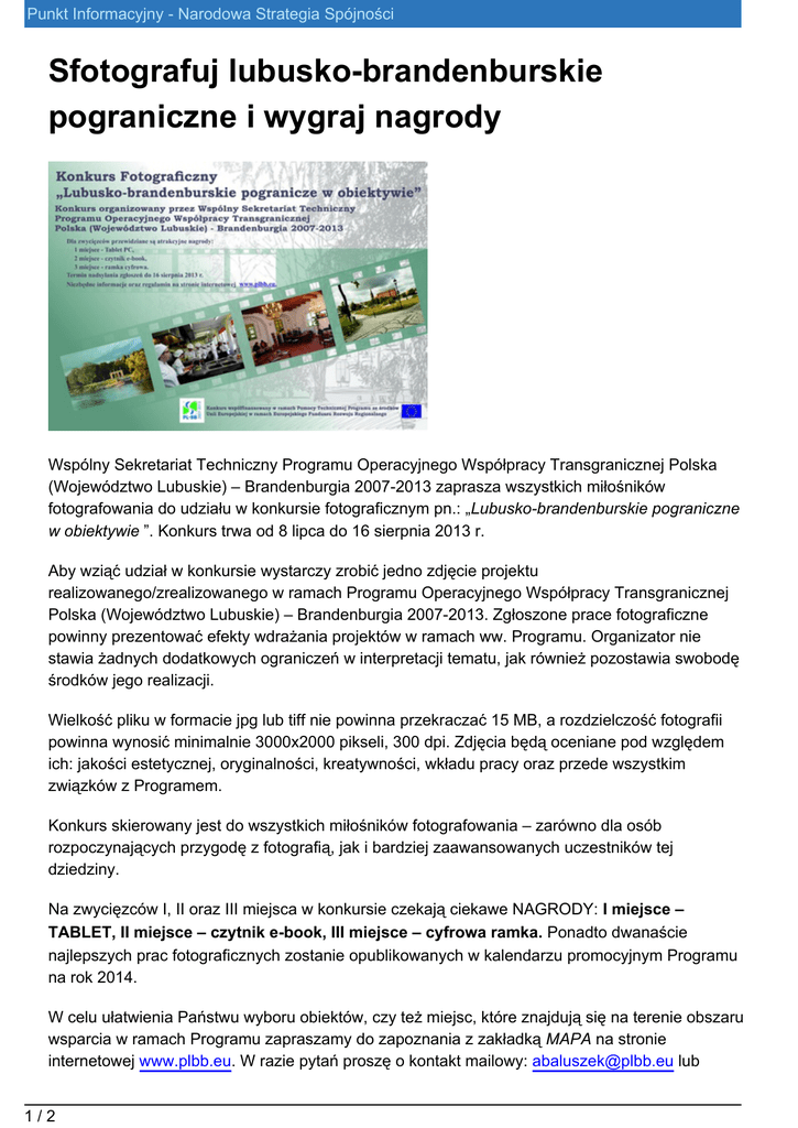 Punkt Informacyjny - Narodowa Strategia Spójności Sfotografuj lubusko-brandenburskie pograniczne i wygraj nagrody Wspólny Sekretariat Techniczny Programu Operacyjnego Współpracy Transgranicznej Polska (Województwo Lubuskie) – Brandenburgia 2007-2013 zaprasza wszystkich miłośników fotografowania do udziału w konkursie fotograficznym pn.: „Lubusko-brandenburskie pograniczne w obiektywie ”. Konkurs trwa od 8 lipca do 16 sierpnia 2013 r. Aby wziąć udział w konkursie wystarczy zrobić jedno zdjęcie projektu realizowanego/zrealizowanego w ramach Programu Operacyjnego Współpracy Transgranicznej Polska (Województwo Lubuskie) – Brandenburgia 2007-2013. Zgłoszone prace fotograficzne powinny prezentować efekty wdrażania projektów w ramach ww. Programu. Organizator nie stawia żadnych dodatkowych ograniczeń w interpretacji tematu, jak również pozostawia swobodę środków jego realizacji. Wielkość pliku w formacie jpg lub tiff nie powinna przekraczać 15 MB, a rozdzielczość fotografii powinna wynosić minimalnie 3000x2000 pikseli, 300 dpi. Zdjęcia będą oceniane pod względem ich: jakości estetycznej, oryginalności, kreatywności, wkładu pracy oraz przede wszystkim związków z Programem. Konkurs skierowany jest do wszystkich miłośników fotografowania – zarówno dla osób rozpoczynających przygodę z fotografią, jak i bardziej zaawansowanych uczestników tej dziedziny. Na zwycięzców I, II oraz III miejsca w konkursie czekają ciekawe NAGRODY: I miejsce – TABLET, II miejsce – czytnik e-book, III miejsce – cyfrowa ramka. Ponadto dwanaście najlepszych prac fotograficznych zostanie opublikowanych w kalendarzu promocyjnym Programu na rok 2014. W celu ułatwienia Państwu wyboru obiektów, czy też miejsc, które znajdują się na terenie obszaru wsparcia w ramach Programu zapraszamy do zapoznania z zakładką MAPA na stronie internetowej www.plbb.eu. W razie pytań proszę o kontakt mailowy: [email protected] lub 1/2 Punkt Informacyjny - Narodowa Strategia Spójności telefoniczny pod nr +48 68 3256561. Wypełniony Formularz zgłoszeniowy oraz – w przypadku udziału osób małoletnich – Oświadczenie opiekuna prawnego , jak i prace fotograficzne , należy przesłać najpóźniej do dnia 16 sierpnia 2013 r. na CD lub DVD na adres korespondencyjny Wspólnego Sekretariatu Technicznego (ul. Kościelna 2, 65-064 Zielona Góra) lub drogą elektroniczną na adres mailowy: [email protected] . Konkurs zostanie rozstrzygnięty do dnia 30 sierpnia 2013 r. Jeżeli macie oczy otwarte na zmiany, czy to w swoim najbliższym otoczeniu, czy też podczas wakacyjnych podróży po lubusko-brandenburskim pograniczu, podzielcie się swoimi wrażeniami w obiektywie. WST zachęca wszystkich mieszkańców pogranicza lubusko-brandenburskiego – i nie tylko – do udziału w konkursie! Konkurs współfinansowany jest ze środków Unii Europejskiej w ramach Europejskiego Funduszu Rozwoju Regionalnego Programu Operacyjnego Współpracy Transgranicznej Polska (Województwo Lubuskie) – Brandenburgia 2007 -2013. 2/2
