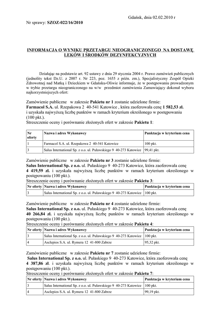 Gdańsk, dnia 02.02.2010 r Nr sprawy: SZOZ-022/16/2010 INFORMACJA O WYNIKU PRZETARGU NIEOGRANICZONEGO NA DOSTAWĘ LEKÓW I ŚRODKÓW DEZYNFEKCYJNYCH Działając na podstawie art. 92 ustawy z dnia 29 stycznia 2004 r. Prawo zamówień publicznych (jednolity tekst Dz.U. z 2007 r. Nr 223, poz. 1655 z późn. zm.), Specjalistyczny Zespół Opieki Zdrowotnej nad Matką i Dzieckiem w Gdańsku-Oliwie informuje, że w postępowaniu prowadzonym w trybie przetargu nieograniczonego na w/w przedmiot zamówienia Zamawiający dokonał wyboru najkorzystniejszych ofert: Zamówienie publiczne w zakresie Pakietu nr 1 zostanie udzielone firmie: Farmacol S.A. ul. Rzepakowa 2 40-541 Katowice , która zaoferowała cenę 1 582,53 zł. i uzyskała najwyższą liczbę punktów w ramach kryterium określonego w postępowaniu (100 pkt.). Streszczenie oceny i porównanie złożonych ofert w zakresie Pakietu 1: Nr oferty Nazwa i adres Wykonawcy Punktacja w kryterium cena 1 Farmacol S.A. ul. Rzepakowa 2 40-541 Katowice 100 pkt. 3 Salus International Sp. z o.o. ul. Puławskiego 9 40-273 Katowice 99,41 pkt. Zamówienie publiczne w zakresie Pakietu nr 3 zostanie udzielone firmie: Salus International Sp. z o.o. ul. Pułaskiego 9 40-273 Katowice, która zaoferowała cenę 4 419,59 zł. i uzyskała najwyższą liczbę punktów w ramach kryterium określonego w postępowaniu (100 pkt.). Streszczenie oceny i porównanie złożonych ofert w zakresie Pakietu 3: Nr oferty Nazwa i adres Wykonawcy 3 Punktacja w kryterium cena Salus International Sp. z o.o. ul. Puławskiego 9 40-273 Katowice 100 pkt. Zamówienie publiczne w zakresie Pakietu nr 4 zostanie udzielone firmie: Salus International Sp. z o.o. ul. Pułaskiego 9 40-273 Katowice, która zaoferowała cenę 40 266,84 zł. i uzyskała najwyższą liczbę punktów w ramach kryterium określonego w postępowaniu (100 pkt.). Streszczenie oceny i porównanie złożonych ofert w zakresie Pakietu 4: Nr oferty Nazwa i adres Wykonawcy Punktacja w kryterium cena 3 Salus International Sp. z o.o. ul. Puławskiego 9 40-273 Katowice 100 pkt. 4 Asclepios S.A. ul. Rymera 12 41-800 Zabrze 95,32 pkt. Zamówienie publiczne w zakresie Pakietu nr 7 zostanie udzielone firmie: Salus International Sp. z o.o. ul. Pułaskiego 9 40-273 Katowice, która zaoferowała cenę 4 387,86 zł. i uzyskała najwyższą liczbę punktów w ramach kryterium określonego w postępowaniu (100 pkt.). Streszczenie oceny i porównanie złożonych ofert w zakresie Pakietu 7: Nr oferty Nazwa i adres Wykonawcy Punktacja w kryterium cena 3 Salus International Sp. z o.o. ul. Puławskiego 9 40-273 Katowice 100 pkt. 4 Asclepios S.A. ul. Rymera 12 41-800 Zabrze 99,19 pkt. Zamówienie publiczne w zakresie Pakietu nr 8 zostanie udzielone firmie: Farmacol S.A. ul. Rzepakowa 2 40-541 Katowice , która zaoferowała cenę 1 637,10 zł. i uzyskała najwyższą liczbę punktów w ramach kryterium określonego w postępowaniu (100 pkt.). Streszczenie oceny i porównanie złożonych ofert w zakresie Pakietu 8: Nr oferty Nazwa i adres Wykonawcy Punktacja w kryterium cena 1 Farmacol S.A. ul. Rzepakowa 2 40-541 Katowice 100 pkt. 3 Salus International Sp. z o.o. ul. Puławskiego 9 40-273 Katowice 98,51 pkt. 4 Asclepios S.A. ul. Rymera 12 41-800 Zabrze 94,00 pkt. 5 PGF Urtica Sp. z o.o. ul. Krzemieniecka 120 54-613 Wrocław 96,10 pkt. Zamówienie publiczne w zakresie Pakietu nr 9 zostanie udzielone firmie: Farmacol S.A. ul. Rzepakowa 2 40-541 Katowice , która zaoferowała cenę 1 586,81 zł. i uzyskała najwyższą liczbę punktów w ramach kryterium określonego w postępowaniu (100 pkt.). Streszczenie oceny i porównanie złożonych ofert w zakresie Pakietu 9: Nr oferty Nazwa i adres Wykonawcy Punktacja w kryterium cena 1 Farmacol S.A. ul. Rzepakowa 2 40-541 Katowice 100 pkt. 3 Salus International Sp. z o.o. ul. Puławskiego 9 40-273 Katowice 94,59 pkt. 5 PGF Urtica Sp. z o.o. ul. Krzemieniecka 120 54-613 Wrocław 92,51 pkt. Zamówienie publiczne w zakresie Pakietu nr 10 zostanie udzielone firmie: Farmacol S.A. ul. Rzepakowa 2 40-541 Katowice , która zaoferowała cenę 2 985,30 zł. i uzyskała najwyższą liczbę punktów w ramach kryterium określonego w postępowaniu (100 pkt.). Streszczenie oceny i porównanie złożonych ofert w zakresie Pakietu 10: Nr oferty Nazwa i adres Wykonawcy Punktacja w kryterium cena 1 Farmacol S.A. ul. Rzepakowa 2 40-541 Katowice 100 pkt. 2 Bialmed Sp. z o.o. ul. M. Konopnickiej 11a 12-230 Biała Piska 97,68 pkt. 4 Asclepios S.A. ul. Rymera 12 41-800 Zabrze 97,28 pkt. 5 PGF Urtica Sp. z o.o. ul. Krzemieniecka 120 54-613 Wrocław 98,51 pkt. Zamówienie publiczne w zakresie Pakietu nr 11 zostanie udzielone firmie: Farmacol S.A. ul. Rzepakowa 2 40-541 Katowice , która zaoferowała cenę 1 310,96 zł. i uzyskała najwyższą liczbę punktów w ramach kryterium określonego w postępowaniu (100 pkt.). Streszczenie oceny i porównanie złożonych ofert w zakresie Pakietu 11: Nr oferty Nazwa i adres Wykonawcy Punktacja w kryterium cena 1 Farmacol S.A. ul. Rzepakowa 2 40-541 Katowice 100 pkt. 3 Salus International Sp. z o.o. ul. Puławskiego 9 40-273 Katowice 92,12 pkt. Zamówienie publiczne w zakresie Pakietu nr 2, 5 i 6 unieważniono zgodnie z art. 93 ust. 1 pkt. 1 Prawo zamówień publicznych (jednolity tekst Dz.U. z 2007 r. Nr 223, poz. 1655 z późn. zm.) z powodu niezłożenia żadnej oferty niepodlegającej odrzuceniu. Powyższą informację wywieszono na tablicy ogłoszeń, stronie internetowej www.szozmd.pl – Specjalistycznego Zespołu Opieki Zdrowotnej nad Matką i Dzieckiem w Gdańsku-Oliwie oraz wysłano listem poleconym do wszystkich uczestników postępowania w dniu 02.02.2010r.
