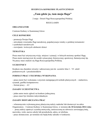 III EDYCJA KONKURSU PLASTYCZNEGO „Tam gdzie ja, tam moja flaga” 2 maja - Dzień Flagi Rzeczypospolitej Polskiej REGULAMIN ORGANIZATOR Centrum Kultury w Kamiennej Górze CELE KONKURSU - promocja Święta Flagi - utrwalanie wizerunku flagi narodowej, popularyzacja wiedzy o polskiej tożsamości i symbolach narodowych - rozwijanie twórczych zdolności dzieci TEMATYKA Praca musi być artystyczną wizją miejsca i sytuacji, w których możemy spotkać flagę. Praca może nawiązywać do scenki sytuacyjnej, historycznej, sportowej, fantastycznej itp. Na pracy musi znaleźć się flaga Rzeczypospolitej Polskiej. UCZESTNICY Konkurs ma charakter otwarty i adresowany jest do uczniów klas I – VI szkół podstawowych i przedszkolaków FORMAT PRAC I TECHNIKA WYKONANIA - praca może być wykonana z użyciem następujących technik plastycznych - malarstwo, rysunek, grafika komputerowa - format pracy – A3 ZASADY UCZESTNICTWA - jeden autor może zgłosić na konkurs jedną pracę - praca musi być dziełem indywidualnym ZASADY DOSTARCZANIA PRAC - własnoręcznie wykonaną pracę plastyczną należy nadesłać lub dostarczyć na adres Organizatora – Centrum Kultury w Kamiennej Górze, w terminie do 10 kwietnia 2014 roku - pracę należy opatrzyć czytelną metryczką, umieszczoną na odwrocie zawierającą imię, nazwisko, wiek, nazwa szkoły lub przedszkola, adres, nr telefonu. - prace dostarczone po terminie nie będą brały udziału w konkursie. KRYTERIA OCENY Prace zostaną ocenione przez Jury powołane przez Organizatora według następujących kryteriów: - realizacja tematu konkursu - oryginalny pomysł - wrażenie artystyczne - estetyka i staranność wykonania Dorosłych prosimy o nie wykonywanie prac za dzieci. ZAKOŃCZENIE KONKURSU - lista laureatów zostanie ogłoszona na stronie internetowej organizatora 2 maja 2014 r. - uroczyste zakończenie konkursu i wręczenie nagród odbędzie się 2 maja 2014 r. o godz. 17.00 w sali widowiskowej Centrum Kultury - laureaci konkursu otrzymają nagrody rzeczowe ufundowane przez organizatora - o sposobie podziału nagród decyduje jury konkursu - zakwalifikowane przez jury prace będą prezentowane w Galerii na Piętrze w Centrum Kultury - ostateczna interpretacja regulaminu należy do jury konkursu UWAGI KOŃCOWE - nadesłane prace przechodzą na własność organizatora i nie podlegają zwrotowi; dostarczenie prac na konkurs jest równoznaczne z akceptacją warunków regulaminu i zgodą na publikację danych osobowych - dostarczając prace na konkurs, każdy uczestnik przenosi autorskie prawa majątkowe na organizatora w następujących polach eksploatacji: wielokrotne eksponowanie prac, zamieszczanie fotografii prac w materiałach reklamowych, wszelkiego rodzaju wydawnictwach i na stronach internetowych - organizator zastrzega sobie prawo do publikacji danych osobowych - uczestnik, który dostarczy pracę na konkurs, wyraża zgodę na przetwarzanie jego danych na potrzeby konkursu