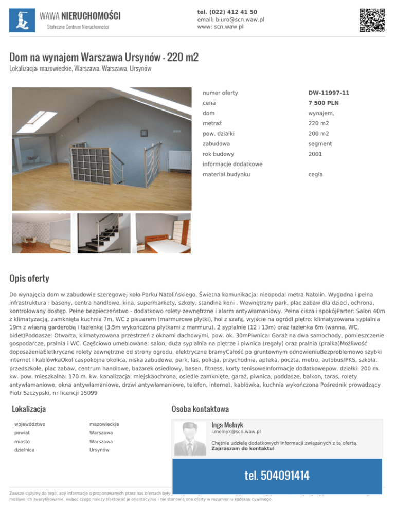tel. (022) 412 41 50 email: [email protected] www: scn.waw.pl Dom na wynajem Warszawa Ursynów - 220 m2 Lokalizacja: mazowieckie, Warszawa, Warszawa, Ursynów numer oferty DW-11997-11 cena 7 500 PLN dom wynajem, metraż 220 m2 pow. działki 200 m2 zabudowa segment rok budowy 2001 informacje dodatkowe materiał budynku cegła Opis oferty Do wynajęcia dom w zabudowie szeregowej koło Parku Natolińskiego. Świetna komunikacja: nieopodal metra Natolin. Wygodna i pełna infrastruktura : baseny, centra handlowe, kina, supermarkety, szkoły, standina koni . Wewnętrzny park, plac zabaw dla dzieci, ochrona, kontrolowany dostęp. Pełne bezpieczeństwo - dodatkowo rolety zewnętrzne i alarm antywłamaniowy. Pełna cisza i spokójParter: Salon 40m z klimatyzacją, zamknięta kuchnia 7m, WC z pisuarem (marmurowe płytki), hol z szafą, wyjście na ogródI piętro: klimatyzowana sypialnia 19m z własną garderobą i łazienką (3,5m wykończona płytkami z marmuru), 2 sypialnie (12 i 13m) oraz łazienka 6m (wanna, WC, bidet)Poddasze: Otwarta, klimatyzowana przestrzeń z oknami dachowymi, pow. ok. 30mPiwnica: Garaż na dwa samochody, pomieszczenie gospodarcze, pralnia i WC. Częściowo umeblowane: salon, duża sypialnia na piętrze i piwnica (regały) oraz pralnia (pralka)Możliwość doposażeniaEletkryczne rolety zewnętrzne od strony ogrodu, elektryczne bramyCałość po gruntownym odnowieniuBezproblemowo szybki internet i kablówkaOkolicaspokojna okolica, niska zabudowa, park, las, policja, przychodnia, apteka, poczta, metro, autobus/PKS, szkoła, przedszkole, plac zabaw, centrum handlowe, bazarek osiedlowy, basen, fitness, korty tenisoweInformacje dodatkowepow. działki: 200 m. kw. pow. mieszkalna: 170 m. kw. kanalizacja: miejskaochrona, osiedle zamknięte, garaż, piwnica, poddasze, balkon, taras, rolety antywłamaniowe, okna antywłamaniowe, drzwi antywłamaniowe, telefon, internet, kablówka, kuchnia wykończona Pośrednik prowadzący Piotr Szczypski, nr licencji 15099 Lokalizacja Osoba kontaktowa Inga Melnyk województwo mazowieckie powiat Warszawa [email protected] miasto Warszawa dzielnica Ursynów Chętnie udzielę dodatkowych informacji związanych z tą ofertą. Zapraszam do kontaktu! tel. 504091414 Zawsze dążymy do tego, aby informacje o proponowanych przez nas ofertach były jak najbardziej dokładne. Niekiedy jednak, ze względu na fakt, iż uzyskujemy je od osób trzecich nie jest możliwe ich zweryfikowanie, wobec czego należy traktować je orientacyjnie i nie stanowią one oferty w rozumieniu kodeksu cywilnego.