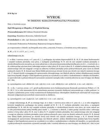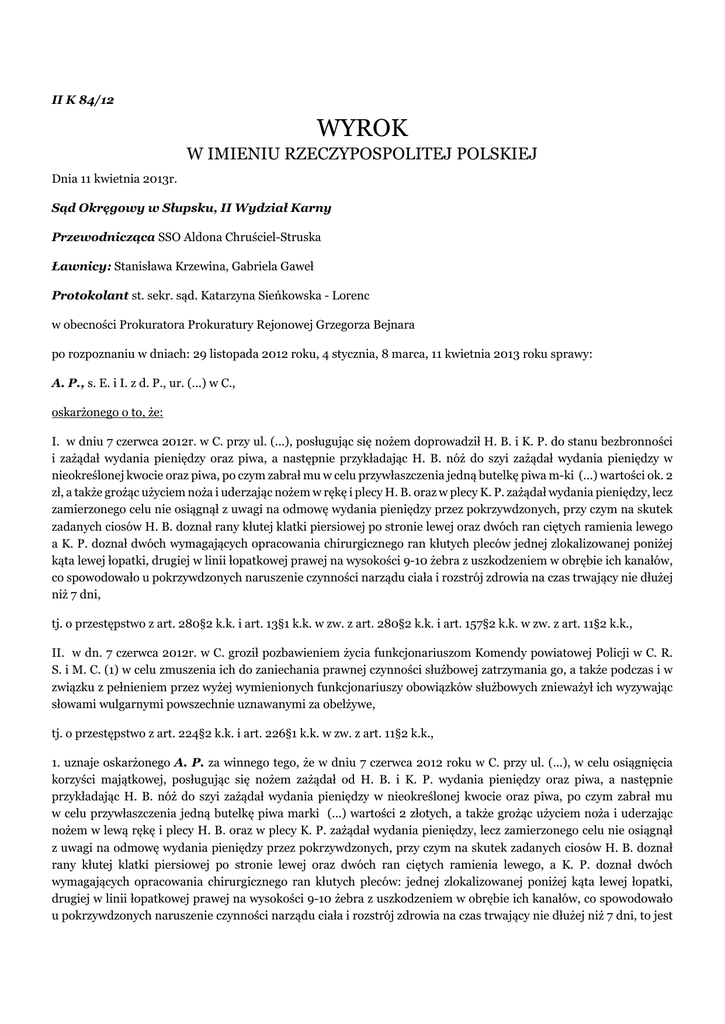 II K 84/12 WYROK W IMIENIU RZECZYPOSPOLITEJ POLSKIEJ Dnia 11 kwietnia 2013r. Sąd Okręgowy w Słupsku, II Wydział Karny Przewodnicząca SSO Aldona Chruściel-Struska Ławnicy: Stanisława Krzewina, Gabriela Gaweł Protokolant st. sekr. sąd. Katarzyna Sieńkowska - Lorenc w obecności Prokuratora Prokuratury Rejonowej Grzegorza Bejnara po rozpoznaniu w dniach: 29 listopada 2012 roku, 4 stycznia, 8 marca, 11 kwietnia 2013 roku sprawy: A. P., s. E. i I. z d. P., ur. (...) w C., oskarżonego o to, że: I. w dniu 7 czerwca 2012r. w C. przy ul. (...), posługując się nożem doprowadził H. B. i K. P. do stanu bezbronności i zażądał wydania pieniędzy oraz piwa, a następnie przykładając H. B. nóż do szyi zażądał wydania pieniędzy w nieokreślonej kwocie oraz piwa, po czym zabrał mu w celu przywłaszczenia jedną butelkę piwa m-ki (...) wartości ok. 2 zł, a także grożąc użyciem noża i uderzając nożem w rękę i plecy H. B. oraz w plecy K. P. zażądał wydania pieniędzy, lecz zamierzonego celu nie osiągnął z uwagi na odmowę wydania pieniędzy przez pokrzywdzonych, przy czym na skutek zadanych ciosów H. B. doznał rany kłutej klatki piersiowej po stronie lewej oraz dwóch ran ciętych ramienia lewego a K. P. doznał dwóch wymagających opracowania chirurgicznego ran kłutych pleców jednej zlokalizowanej poniżej kąta lewej łopatki, drugiej w linii łopatkowej prawej na wysokości 9-10 żebra z uszkodzeniem w obrębie ich kanałów, co spowodowało u pokrzywdzonych naruszenie czynności narządu ciała i rozstrój zdrowia na czas trwający nie dłużej niż 7 dni, tj. o przestępstwo z art. 280§2 k.k. i art. 13§1 k.k. w zw. z art. 280§2 k.k. i art. 157§2 k.k. w zw. z art. 11§2 k.k., II. w dn. 7 czerwca 2012r. w C. groził pozbawieniem życia funkcjonariuszom Komendy powiatowej Policji w C. R. S. i M. C. (1) w celu zmuszenia ich do zaniechania prawnej czynności służbowej zatrzymania go, a także podczas i w związku z pełnieniem przez wyżej wymienionych funkcjonariuszy obowiązków służbowych znieważył ich wyzywając słowami wulgarnymi powszechnie uznawanymi za obelżywe, tj. o przestępstwo z art. 224§2 k.k. i art. 226§1 k.k. w zw. z art. 11§2 k.k., 1. uznaje oskarżonego A. P. za winnego tego, że w dniu 7 czerwca 2012 roku w C. przy ul. (...), w celu osiągnięcia korzyści majątkowej, posługując się nożem zażądał od H. B. i K. P. wydania pieniędzy oraz piwa, a następnie przykładając H. B. nóż do szyi zażądał wydania pieniędzy w nieokreślonej kwocie oraz piwa, po czym zabrał mu w celu przywłaszczenia jedną butelkę piwa marki (...) wartości 2 złotych, a także grożąc użyciem noża i uderzając nożem w lewą rękę i plecy H. B. oraz w plecy K. P. zażądał wydania pieniędzy, lecz zamierzonego celu nie osiągnął z uwagi na odmowę wydania pieniędzy przez pokrzywdzonych, przy czym na skutek zadanych ciosów H. B. doznał rany kłutej klatki piersiowej po stronie lewej oraz dwóch ran ciętych ramienia lewego, a K. P. doznał dwóch wymagających opracowania chirurgicznego ran kłutych pleców: jednej zlokalizowanej poniżej kąta lewej łopatki, drugiej w linii łopatkowej prawej na wysokości 9-10 żebra z uszkodzeniem w obrębie ich kanałów, co spowodowało u pokrzywdzonych naruszenie czynności narządu ciała i rozstrój zdrowia na czas trwający nie dłużej niż 7 dni, to jest przestępstwa z art. 280 § 2 k.k. i art. 157 § 2 k.k. przy zast. art. 11 § 2 k.k. i za to na mocy art. 280 § 2 k.k. przy zast. art. 11 § 3 k.k. skazuje go na karę 3 (trzech) lat i 6 (sześciu) miesięcy pozbawienia wolności; 2. uznaje oskarżonego A. P. za winnego tego, że w dniu 7 czerwca 2012 roku w C. podczas i w związku z pełnieniem przez funkcjonariuszy Komendy Powiatowej Policji w C. R. S. i M. C. (1) obowiązków służbowych znieważył ich wyzywając słowami powszechnie uznawanymi za obelżywe, to jest przestępstwa z art. 226 § 1 k.k. i za to na mocy art. 226 § 1 k.k. skazuje go na karę 6 (sześciu) miesięcy pozbawienia wolności; 3. na mocy art. 85 k.k. i art. 86 § 1 k.k. wymierza A. P. karę łączną 3 (trzech) lat i 6 (sześciu) miesięcy pozbawienia wolności; 4. na mocy art. 63 § 1 k.k. na poczet orzeczonej kary pozbawienia wolności zalicza A. P. okres rzeczywistego pozbawienia wolności w sprawie od dnia 7 czerwca 2012 roku do dnia 1 października 2012 roku i od dnia 31 października 2012 roku do dnia 11 kwietnia 2013 roku, przy czym jeden dzień rzeczywistego pozbawienia wolności w sprawie równa się jednemu dniowi kary pozbawienia wolności; 5. na mocy art. 230 § 2 k.p.k. nakazuje zwrócić W. M. dowody rzeczowe w postaci noża stalowego z ząbkami, noża kuchennego z czarną plastikową rękojeścią i butelki po piwie (...) opisane w wykazie dowodów rzeczowych na k. 244 akt sprawy pod poz. 1-3; 6. zasądza od Skarbu Państwa na rzecz adw. P. K. adwokacka w S. kwotę 1180,80 (tysiąc sto osiemdziesiąt, osiemdziesiąt ) złotych brutto tytułem nieopłaconej pomocy prawnej udzielonej oskarżonemu A. P. z urzędu; 7. zasądza od oskarżonego A. P. na rzecz Skarbu Państwa koszty sądowe, a w tym tytułem opłaty kwotę 400 (czterysta) złotych. UZASADNIENIE W dniu 7 czerwca 2012 roku w C. H. B. i K. P. postanowili wspólnie wypić piwo. Za pieniądze K. P., H. B. zakupił w sklepie dwa piwa W., łącznie za kwotę około 2 złotych. Następnie około godz. 16,00 mężczyźni udali się na ul. (...), gdzie na podwórku zamierzali spożyć piwo. (dowód: zeznania K. P. - k. 2-3, 113v-114, 557-558v, zeznania H. B.- k. 5-6, 110-111, 512v-514, zeznania M. C. (1) - k. 67v, zeznania R. S. - k. 92-94,183-184) W tym czasie w mieszkaniu W. M. przy ul. (...) przebywali A. P., jego ojciec E. P., H. N., M. W.. Mężczyźni spożywali tam alkohol. W. M. w tym czasie spał. (dowód: wyjaśnienia A. P. - k. 46-47, zeznania H. N. - k. 208v, 382v-384, 387v, częściowe zeznania M. W. - k. 77, 126-127, zez