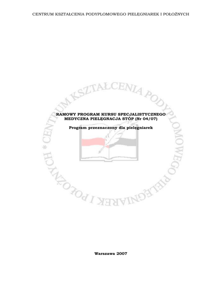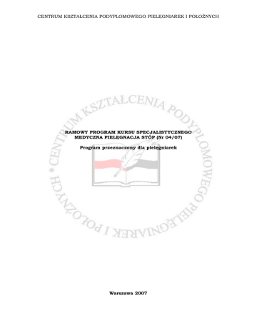 CENTRUM KSZTAŁCENIA PODYPLOMOWEGO PIELĘGNIAREK I POŁOŻNYCH RAMOWY PROGRAM KURSU SPECJALISTYCZNEGO MEDYCZNA PIELĘGNACJA STÓP (Nr 04/07) Program przeznaczony dla pielęgniarek Warszawa 2007 CENTRUM KSZTAŁCENIA PODYPLOMOWEGO PIELĘGNIAREK I POŁOŻNYCH AUTORZY WSPÓŁPRACUJĄCY Z CENTRUM KSZTAŁCENIA PODYPLOMOWEGO PIELĘGNIAREK I POŁOŻNYCH W OPRACOWANIU PROGRAMU mgr Zofia Nowak-Kapusta Śląski Uniwersytet Medyczny Wydział Opieki Zdrowotnej Zakład Promocji Zdrowia i Pielęgniarstwa Środowiskowego Katowice lic. Justyna Kapuściok Szkoła Policealna nr 1 Ruda Śląska NZOZ MEDICUS Bytom piel. dypl. Mirosława Młynarczuk Samodzielny Publiczny Centralny Szpital Kliniczny Klinika Gastroenterologii i Chorób Przemiany Materii Warszawa RECENZENCI PROGRAMU prof. dr hab. Waldemar Karnafel Samodzielny Publiczny Centralny Szpital Kliniczny Klinika Gastroenterologii i Chorób Przemiany Materii Warszawa mgr Elżbieta Szwałkiewicz Konsultant Krajowy w dziedzinie pielęgniarstwa przewlekle chorych i niepełnosprawnych Centrum Pielęgnacyjne „Niebieski Parasol” Olsztyn Program opracowany w porozumieniu z Naczelną Radą Pielęgniarek i Położnych Program zatwierdził Dyrektor Pielęgniarek i Położnych Centrum Kształcenia Podyplomowego 2 CENTRUM KSZTAŁCENIA PODYPLOMOWEGO PIELĘGNIAREK I POŁOŻNYCH ZAŁOŻENIA ORGANIZACYJNO – PROGRAMOWE Rodzaj kształcenia Kurs specjalistyczny jest to rodzaj kształcenia, który zgodnie z ustawą z dnia 5 lipca 1996r. o zawodach pielęgniarki i położnej (Dz. U. z 2001r. Nr 57 poz. 602 z późn. zm.) ma na celu uzyskanie przez pielęgniarkę, położną kwalifikacji do wykonywania określonych czynności zawodowych przy udzielaniu świadczeń pielęgnacyjnych, zapobiegawczych, diagnostycznych, leczniczych lub rehabilitacyjnych. Organizator kształcenia podyplomowego, na podstawie ramowego programu sporządza program kształcenia. Program kształcenia musi uwzględniać wszystkie elementy modułów wskazanych w planie nauczania ramowego programu, jednak treści nauczania mogą być dostosowane do warunków i potrzeb lokalnych. Wykaz umiejętności będących przedmiotem kształcenia ramowego programu jest dla organizatora i uczestnika kształcenia obowiązującym elementem programu. Osiągnięcie wskazanych umiejętności gwarantuje, że każdy absolwent kursu specjalistycznego będzie posiadać takie same kwalifikacje, niezależnie od miejsca ukończenia kształcenia, podmiotu organizującego kształcenie podyplomowe oraz trybu kształcenia. Poszczególne moduły ramowego programu zawierają cel, treści nauczania oraz wykaz umiejętności wynikowych, odnoszące się zarówno do zajęć teoretycznych jak i praktycznych. W planie nauczania wskazane są wyłącznie miejsca realizacji zajęć praktycznych, dlatego też organizator oprócz programu kształcenia teoretycznego obowiązany jest opracować program szkolenia praktycznego dla każdej placówki. Program ten powinien zawierać cel i umiejętności. Jednocześnie program zajęć praktycznych powinien uwzględniać wykaz świadczeń zdrowotnych (opracowany na podstawie wykazu umiejętności), do zaliczenia których zobowiązany jest uczestnik kursu. Dokumentację zawierającą potwierdzenie zaliczenia poszczególnych świadczeń opracowuje organizator kształcenia. Stanowi ona wewnętrzny dokument organizatora. Cel kształcenia Pielęgniarka pielęgnuje stopy zdrowe i zmienione chorobowo. Czas kształcenia Łączna liczba godzin przeznaczonych na realizację programu kształcenia kursu specjalistycznego Medyczna pielęgnacja stóp (Nr 04/07) wynosi 175 godzin dydaktycznych, w tym: zajęcia teoretyczne 105 godzin, zajęcia praktyczne 70 godzin. Określona, w planie nauczania, liczba godzin poszczególnych modułów, odnosi się do realizacji programu w trybie dziennym. Z uwagi jednak na lokalne preferencje i potrzeby, gdy realizacja programu odbywała się będzie w trybie innym niż dzienny, organizator kształcenia w porozumieniu z kierownikiem kursu i wykładowcami ma prawo dokonać modyfikacji czasu trwania zajęć teoretycznych w wymiarze nie większym niż 20%. Oznacza to, że 80% czasu przeznaczonego na realizację poszczególnych modułów nie podlega zmianie. Wskazane 20% może być wykorzystane na przesunięcia pomiędzy poszczególnymi modułami lub w części może zostać przeznaczone na realizację zadań w ramach samokształcenia. Sposób organizacji Za przebieg i organizację kursu specjalistycznego odpowiedzialny jest organizator kształcenia. Planując realizację kursu organizator powinien: 3 CENTRUM KSZTAŁCENIA PODYPLOMOWEGO PIELĘGNIAREK I POŁOŻNYCH 1. Opracować program kształcenia: zajęć teoretycznych, zajęć praktycznych. 2. Opracować regulamin organizacyjny kursu specjalistycznego, który w szczególności określa: organizację, zasady i sposób naboru osób, prawa i obowiązki osób uczestniczących, zakres obowiązków wykładowców i innych osób prowadzących nauczanie teoretyczne i szkolenie praktyczne, zasady przeprowadzenia egzaminu końcowego. 3. Powołać kierownika kursu specjalistycznego. Do zadań kierownika kursu oprócz zadań określonych w rozporządzeniu Ministra Zdrowia z dnia 29 października 2003 r. w sprawie kształcenia podyplomowego pielęgniarek i położnych (Dz. U. Nr 197 poz.1923) powinno należeć: współdecydowanie o doborze kadry dydaktycznej, przedstawienie uczestnikom kursu: celu, programu i organizacji szkolenia, ocenianie placówek szkolenia praktycznego wg specyfiki i organizacji zajęć, pomaganie w rozwiązywaniu problemów, udzielanie indywidualnych konsultacji uczestnikom kursu, zbieranie i analizowanie opinii o przebiegu kursu. W dniu rozpoczęcia kursu każdy uczestnik powinien otrzymać: harmonogram zajęć teoretycznych i praktycznych, wykaz umiejętności będących przedmiotem kształcenia. 4. Przeprowadzić postępowanie kwalifikacyjne. 5. Powołać w uzgodnieniu z kierownikiem kursu opiekunów szkolenia praktycznego
