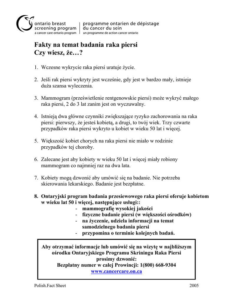 Fakty na temat badania raka piersi Czy wiesz, że…? 1. Wczesne wykrycie raka piersi uratuje życie. 2. Jeśli rak piersi wykryty jest wcześnie, gdy jest w bardzo mały, istnieje duża szansa wyleczenia. 3. Mammogram (prześwietlenie rentgenowskie piersi) może wykryć małego raka piersi, 2 do 3 lat zanim jest on wyczuwalny. 4. Istnieją dwa główne czynniki zwiększające ryzyko zachorowania na raka piersi: pierwszy, że jesteś kobietą, a drugi, to twój wiek. Trzy czwarte przypadków raka piersi wykryto u kobiet w wieku 50 lat i więcej. 5. Większość kobiet chorych na raka piersi nie miało w rodzinie przypadków tej choroby. 6. Zalecane jest aby kobiety w wieku 50 lat i więcej miały robiony mammogram co najmniej raz na dwa lata. 7. Kobiety mogą dzwonić aby umówić się na badanie. Nie potrzeba skierowania lekarskiego. Badanie jest bezpłatne. 8. Ontaryjski program badania przesiewowego raka piersi oferuje kobietom w wieku lat 50 i więcej, następujące usługi:: - mammografię wysokiej jakości - fizyczne badanie piersi (w większości ośrodków) - na życzenie, udziela informacji na temat samodzielnego badania piersi - przypomina o terminie kolejnych badań. Aby otrzymać informacje lub umówić się na wizytę w najbliższym ośrodku Ontaryjskiego Programu Skriningu Raka Piersi prosimy dzwonić: Bezpłatny numer w całej Prowincji: 1(800) 668-9304 www.cancercare.on.ca Polish.Fact Sheet 2005