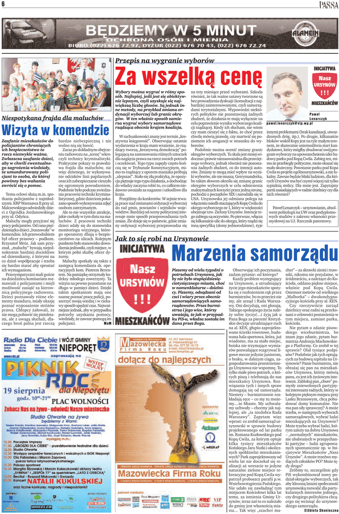 6 Przepis na wygranie wyborów Za wszelką cenę Niespotykana frajda dla maluchów Wizyta w komendzie Zaufanie mieszkańców do policjantów chroniących ich bezpieczeństwo to rzecz niezwykle ważna. Zwłaszcza zaufanie dzieci, aby w chwili ewentualnego zagrożenia wiedziały, że umundurowany policjant to osoba, do której powinny bez wahania zwrócić się o pomoc. Temu celowi służą m.in. spotkania policjantów z najmłodszymi. KRP Warszawa II przy ul. Malczewskiego odwiedziły dzieci z Ogródka Jordanowskiego przy ul. Odyńca. Maluchy mogły przyjrzeć się pracy policjantów. Od rana pięćdziesiątka dzieci „buszowała” w komendzie. Ich przewodnikiem był oficer prasowy – podkom. Krzysztof Mróz. Jak sam przyznał, „maluchy” bywają niejednokrotnie bardziej dociekliwe od dziennikarzy, z którymi na co dzień współpracuje i trzeba się bardzo starać aby sprostać ich wymaganiom. Przesympatyczni mali goście na dziedzińcu komisariatu rozmawiali z policjantami i mięli możliwość zasiąść za kierownicą policyjnego radiowozu. Dzieci poznawały różne elementy munduru, miały okazję poznać wyposażenie stróżów prawa. Chłopcy żałowali, że nie mogą pobawić się pistoletami, ale z uwagą słuchali, dlaczego broń palna jest rzeczą bardzo niebezpieczną i nie wolno nią się bawić. Zaraz po dokładnym obejrzeniu radiowozu na „scenę” wkroczyli technicy kryminalistyki. Praktyczne pokazy to prawdziwa frajda dla maluchów, nic więc dziwnego, że wykonywanie odcisków linii papilarnych oraz ich zabezpieczanie cieszyło się ogromnym powodzeniem. Podobnie było podczas zwiedzania pracowni techniki kryminalistycznej, gdzie dzieciom pokazano sposób wykonywania zdjęć osobom zatrzymanym. Ale to nie wszystkie atrakcje, jakie czekały w tym dniu na maluchów. Z pracowni techniki dzieci udały się do stanowiska monitoringu wizyjnego, którego operatorzy dbają o bezpieczeństwo na ulicach. Kolejnym punktem było stanowisko dowodzenia jednostki, czyli miejsce, w którym pełni służbę oficer dyżurny. Maluchy spotkały się także z zastępcą komendanta ds. operacyjnych kom. Piotrem Berentem. Na pamiątkę otrzymały kodeksy młodego rowerzysty. Ta wizyta na pewno pozostanie na długo w pamięci dzieci. Dzięki takim spotkaniom mają one szansę poznać pracę policji, poszerzyć swoją wiedzę i w ciekawy sposób spędzić czas. Najważniejsze jednak, aby w przypadku potrzeby uzyskania pomocy, wiedziały, że zawsze pomogą im policjanci. MaM Wybory można wygrać w różny sposób. Najlepiej, jeśli jest się obiektywnie lepszym, czyli uzyskuje się największą liczbę głosów. Są jednak inne metody, na przykład zmiana ordynacji wyborczej lub granic okręgów. W ten właśnie sposób zamierza wygrać wybory samorządowe rządząca obecnie krajem koalicja. W rachunkowości znany jest termin „kreatywna księgowość”. Obserwując ostatnie wydarzenia w kraju mam wrażenie, że rządzący tworzą „kreatywną demokrację” polegającą na zastosowaniu różnych sztuczek dla nagięcia prawa na rzecz swoich potrzeb i oczekiwań. Tego typu zapędy często kończą się w Trybunale Konstytucyjnym, mimo to rządzący z uporem maniaka próbują „ulepszać”. Stało się złą praktyką, że opozycja piętnuje tego typu działania, a dochodząc do władzy zaczyna robić to, co całkiem niedawno uważała za naganne i szkodliwe dla kraju. Przejdźmy do konkretów. W sejmie trwają prace nad zmianami ordynacji wyborczej do rad gmin, powiatów i sejmików województw. Bardziej od oceny politycznej interesuje mnie sposób przeprowadzania tych zmian. Źle dzieje się w państwie, gdzie zmiany ordynacji wyborczej przeprowadza się na trzy miesiące przed wyborami. Szkoda również, że tak ważne ustawy tworzone są bez prowadzenia dyskusji i konsultacji z najbardziej zainteresowanymi, czyli samorządami terytorialnymi. Wypowiedzi niektórych polityków nie pozostawiają żadnych złudzeń, że działania te mają wyłącznie na celu poprawienie wyniku wyborczego koalicji rządzącej. Kiedy ich słucham, nie wiem czy mam cieszyć się z faktu, że choć przez chwilę mówią prawdę, czy martwić się poziomem ich arogancji w stosunku do wyborców. Podobnie można ocenić zmiany granic okręgów wyborczych. Tu skala jest mniej widoczna i prawie niezauważalna dla przeciętnego wyborcy, jednak również nie pozostawia żadnych złudzeń, co do intencji autorów. Zmiany te mogą mieć wpływ na wyniki wyborów, ale nie muszą. Gerrymanderka, bo takim słowem określa się zmianę granic okręgów wyborczych w celu odniesienia maksymalnych korzyści przez jedną stronę, pochodzi z początków XIX i narodziła się w USA. Ursynowska jej odmiana polega na włączeniu osiedli otaczających Kopę Cwila do okręgu wyborczego nr 1, który w większości obejmuje tzw. Zielony Ursynów. Intencje tego zabiegu są oczywiste. Po pierwsze, włącza się kilkanaście ulic do okręgu, który rządzi się inną specyfiką (domy jednorodzinne), żyje Paweł Lenarczyk [email protected] innymi problemami (brak kanalizacji, utwardzonych dróg, itp.). Po drugie, kilkanaście bloków wokół Kopy jest na tyle małym terenem, że skutecznie uniemożliwia start kandydatowi, który mógłby zbudować swój program wyborczy na upowszechnieniu idei budowy parku pod Kopą Cwila. Zabieg ten, mimo że przebiegły polityczne, może okazać się mało skuteczny. Powstanie parku pod Kopa Cwila to projekt ogólnoursynowski, a nie lokalny. Zawsze będzie bliski ludziom, dla których Ursynów ma być czymś więcej niż tylko sypialnią stolicy. Dla mnie jest. Zapytajmy partii zasiadających w radzie dzielnicy czy dla nich również? Paweł Lenarczyk – ursynowianin, absolwent politologii na UW oraz podyplomowych studiów z zakresu własności przemysłowej na UJ. Rzecznik patentowy. Jak to się robi na Ursynowie Marzenia samorządu Piszemy od wielu tygodni o potrzebach Ursynowa, jak by nie by
