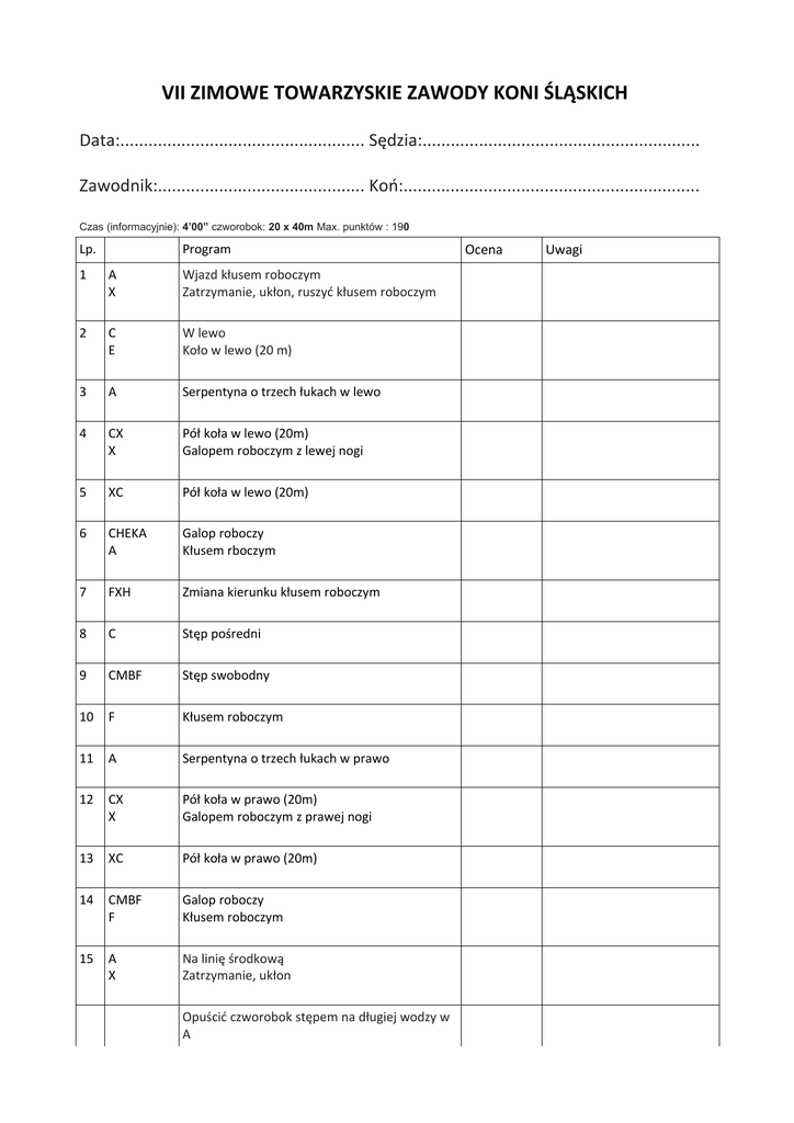 VII ZIMOWE TOWARZYSKIE ZAWODY KONI ŚLĄSKICH Data:.................................................... Sędzia:........................................................... Zawodnik:............................................ Koń:............................................................... Czas (informacyjnie): 4’00” czworobok: 20 x 40m Max. punktów : 190 Lp. Program 1 A X Wjazd kłusem roboczym Zatrzymanie, ukłon, ruszyć kłusem roboczym 2 C E W lewo Koło w lewo (20 m) 3 A Serpentyna o trzech łukach w lewo 4 CX X Pół koła w lewo (20m) Galopem roboczym z lewej nogi 5 XC Pół koła w lewo (20m) 6 CHEKA A Galop roboczy Kłusem rboczym 7 FXH Zmiana kierunku kłusem roboczym 8 C Stęp pośredni 9 CMBF Stęp swobodny 10 F Kłusem roboczym 11 A Serpentyna o trzech łukach w prawo 12 CX X Pół koła w prawo (20m) Galopem roboczym z prawej nogi 13 XC Pół koła w prawo (20m) 14 CMBF F Galop roboczy Kłusem roboczym 15 A X Na linię środkową Zatrzymanie, ukłon Opuścić czworobok stępem na długiej wodzy w A Ocena Uwagi Oceny Ogólne 1 Chody (swoboda i regularność) 2 Impuls (dążność do ruchu naprzód, elastyczność kroków, rozluźnienie grzbietu, zaangażowanie zadu) 3 Posłuszeństwo (uwaga i zaufanie, harmonia, lekkość i łatwość wykonania, wyprostowanie, przyjęcie kiełzna i lekkość przodu) 4 Postawa i dosiad jeźdźca; poprawność i skuteczność pomocy Błędy w przebiegu lub wykonaniu programu: KAŻDA POMYŁKA (-) 2 pkt. Uwagi ogólne: Wynik końcowy [%] UWAGA: w kłusie, o ile nie wskazano w danym ruchu, dosiad dowolny