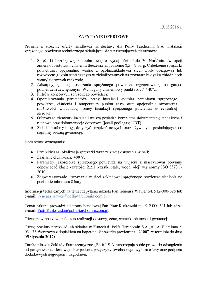 13.12.2016 r. ZAPYTANIE OFERTOWE Prosimy o złożenie oferty handlowej na dostawę dla Polfy Tarchomin S.A. instalacji sprężonego powietrza technicznego składającej się z następujących elementów: 1. Sprężarki bezolejowej stałoobrotowej o wydajności około 30 Nm3/min. /w opcji zmiennoobrotowa/ i ciśnieniu tłoczenia na poziomie 8,5 – 9 barg. Chłodzenie sprężarki powietrzne, opcjonalnie wodne z ogólnozakładowej sieci wody obiegowej lub roztworem glikolu schładzanym w zlokalizowanych na zewnątrz budynku chłodnicach wentylatorowych mokrych; 2. Adsorpcyjnej stacji osuszania sprężonego powietrza regenerowanej na gorąco powietrzem zewnętrznym. Wymagany ciśnieniowy punkt rosy /–/ 40oC. 3. Filtrów końcowych sprężonego powietrza; 4. Opomiarowania parametrów pracy instalacji /pomiar przepływu sprężonego powietrza, ciśnienia i temperatury punktu rosy/ oraz opcjonalnie stworzenia możliwości wizualizacji pracy instalacji sprężonego powietrza w centralnej sterowni. 5. Oferowane elementy instalacji muszą posiadać kompletną dokumentację techniczną i ruchową oraz dokumentację dozorową (jeżeli podlegają UDT). 6. Składane oferty mogą dotyczyć urządzeń nowych oraz używanych posiadających co najmniej roczną gwarancję. Dodatkowe wymagania: Przewidziana lokalizacja sprężarki wraz ze stacją osuszania w hali; Zasilanie elektryczne 400 V; Parametry jakościowe sprężonego powietrza na wyjściu z maszynowni powinny odpowiadać klasie czystości 2.2.1 (cząstki stałe, woda, olej) wg normy ISO 8573.12010; Zagwarantowanie utrzymania w sieci zakładowej sprężonego powietrza ciśnienia na poziomie minimum 8 barg. Informacji technicznych na temat zapytania udziela Pan Ireneusz Wawer tel. 512-000-625 lub e-mail: [email protected] Temat zakupu prowadzi od strony handlowej Pan Piotr Kurkowski tel. 512 000 641 lub adres e-mail: [email protected]. Oferta powinna zawierać: czas realizacji dostawy, cenę, warunki płatności i gwarancji. Ofertę prosimy przesyłać lub składać w Kancelarii Polfa Tarchomin S.A., ul. A. Fleminga 2, 03-176 Warszawa z dopiskiem na kopercie „Sprężarka powietrzna - 2100” w terminie do dnia 05 stycznia 2017r. Tarchomińskie Zakłady Farmaceutyczne „Polfa” S.A. zastrzegają sobie prawo do odstąpienia od postępowania ofertowego bez podania przyczyny, swobodnego wyboru oferty oraz podjęcia dodatkowych negocjacji i uzgodnień.