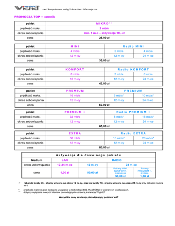 sieci komputerowe, usługi i doradztwo informatyczne PROMOCJA TOP – cennik pakiet MIKRO** prędkość maks. 2 mb/s okres zobowiązania min. 1 m-c – aktywacja 10,- zł cena 25,00 zł pakiet MINI Radio MINI prędkość maks. 4 mb/s 2 mb/s 4 mb/s okres zobowiązania 12 m-cy 12 m-cy 24 m-ce 35,00 zł cena pakiet KOMFORT Radio KOMFORT prędkość maks. 8 mb/s 3 mb/s 6 mb/s okres zobowiązania 12 m-cy 12 m-cy 24 m-ce 42,00 zł cena pakiet PREMIUM PREMIUM prędkość maks. 16 mb/s 5 mb/s* 10 mb/s* okres zobowiązania 12 m-cy 12 m-cy 24 m-ce 50,00 zł cena pakiet PREMIUM + Radio PREMIUM + prędkość maks. 32 mb/s 8 mb/s* 16 mb/s* okres zobowiązania 12 m-cy 12 m-cy 24 m-ce 65,00 zł cena pakiet EXTRA Radio EXTRA prędkość maks. 50 mb/s 10 mb/s* 20 mb/s* okres zobowiązania 12 m-cy 12 m-cy 24 m-ce 85,00 zł cena Aktywacja dla dowolnego pakietu Medium LAN okres zobowiązania 12-24 m-ce cena 1,00 zł RADIO 12 m-cy 99,00 zł 24 m-ce Pakiety MINI, KOMFORT, PREMIUM Pakiety PREMIUM +, EXTRA 50,00 zł 1,00 zł rabat do kwoty 35,- zł przy umowie na okres 12 m-cy, oraz do kwoty 10,- zł przy umowie na okres 24 m-cy przy zakupie routera wi-fi * ** prędkość maksymalna dostępna wyłącznie w technologii 802.11a (5GHz) w wybranych lokalizacjach. dotyczy wyłącznie nowych klientów posiadających sprawną instalację WigNET Wszystkie ceny zawierają obowiązujący podatek VAT