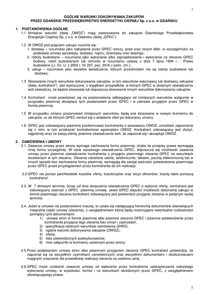 1 OGÓLNE WARUNKI DOKONYWANIA ZAKUPÓW PRZEZ GDA SKIE PRZEDSI BIORSTWO ENERGETYKI CIEPNEJ Sp. z o.o. w GDA SKU 1. POSTANOWIENIA OGÓLNE 1.1 Niniejsze warunki (dalej „OWDZ”) maj zastosowanie do zakupów Gda skiego Przedsi biorstwa Energetyki Cieplnej Sp. z o.o. w Gda sku (dalej „GPEC”). 1.2 W OWDZ pod poj ciem zakupu rozumie si : 1. dostawy – rozumiane jako nabywanie przez GPEC rzeczy, praw oraz innych dóbr, w szczególno ci na podstawie umowy sprzeda y, dostawy, najmu, dzier awy oraz leasingu; 2. roboty budowlane – rozumiane jako wykonanie albo zaprojektowanie i wykonanie na zlecenie GPEC budowy, robót budowlanych lub remontu w rozumieniu ustawy z dnia 7 lipca 1994 r. - Prawo budowlane (j.t. Dz. U. z 2003 r. Nr 207, poz. 2016 z pó n. zm.); 3. usługi – rozumiane jako wszelkie wiadczenia, których przedmiotem nie s roboty budowlane lub dostawy; 1.3 Stosowanie innych warunków dokonywania zakupów, w tym warunków wykonawcy lub dostawcy zakupów (dalej „kontrahent”) jest wykluczone, z wyj tkiem przypadków, w których GPEC w zło onym o wiadczeniu woli o wiadczy, e b dzie stosowała lub dopuszcza stosowanie innych warunków dokonywania zakupów. 1.4 Kontrahent mo e powoływa si na postanowienia odbiegaj ce od niniejszych warunków wył cznie w przypadku pisemnej akceptacji tych postanowie przez GPEC i w zakresie przyj tym przez GPEC w formie pisemnej. 1.5 W przypadku zmiany postanowie niniejszych warunków, b d one stosowane w nowym brzmieniu do zakupów, co do których GPEC zwrócił si o składanie ofert po dokonaniu zmiany. 1.6 GPEC jest zobowi zany pisemnie poinformowa kontrahenta o stosowaniu OWDZ, umo liwi zapoznanie si z nimi, w tym przekaza kontrahentowi egzemplarz OWDZ. Kontrahent zobowi zany jest zło y , najpó niej wraz ze swoj ofert , pisemne o wiadczenie woli, e zapoznał si i akceptuje OWDZ. 2. ZAMÓWIENIA I UMOWY 2.1 Zawarcie umowy przez strony wymaga zachowania formy pisemnej, chyba e przepisy prawa wymagaj innej formy szczególnej. W razie wyra nego o wiadczenia GPEC, dopuszcza si mo liwo zawarcia umowy przez pisemne o wiadczenie kontrahenta o przyj ciu pisemnego zlecenia GPEC na warunkach okre lonych w tym zleceniu. Zlecenia udzielone ustnie, telefonicznie, faksem, poczt elektroniczn lub w innych sposób bez zachowania formy pisemnej, wymagaj dla swojej wa no ci potwierdzenia pisemnego przez GPEC przed przyst pieniem przez kontrahenta do ich realizacji. 2.2.GPEC nie ponosi jakichkolwiek kosztów oferty, kosztorysów oraz wizyt oferentów; koszty takie ponosz kontrahenci. 2.3. W 7 dniowym terminie, licz c od dnia dor czenia o wiadczenia GPEC o wyborze oferty, kontrahent jest zobowi zany zawrze z GPEC pisemn umow . Je eli GPEC dopu ci mo liwo dokonania zakupu w formie pisemnego zlecenia kontrahent zobowi zany jest potwierdzi przyj cie zlecenia w podanym wy ej terminie. 2.4. Je eli w umowie nie postanowiono inaczej, to ustala si nast puj c hierarchi dokumentów stanowi cych integraln cz umowy (zlecenia), z uwzgl dnieniem której b d rozstrzygane ewentualne rozbie no ci pomi dzy tymi dokumentami: 1) umowa stron w formie pisemnej albo pisemne zlecenie GPEC i pisemne potwierdzenie przez kontrahenta przyj cia tego zlecenia bez zmian i zastrze e , 2) specyfikacja istotnych warunków zamówienia (SIWZ), 3) ogólne warunki dokonywania zakupów (OWDZ), 4) oferta, 5) lista zatwierdzonych podwykonawców, 6) inne zał czniki w brzmieniu ustalonym przez strony. 2.5.Przez podpisaniem umowy stron albo pisemnym przyj ciem zlecenia GPEC kontrahent potwierdza, e zapoznał si ze wszystkimi czynnikami cenotwórczymi oraz wszystkimi dokumentami i okoliczno ciami maj cymi znaczenie dla prawidłowej realizacji zlecenia za ustalona cen . 2.6.GPEC mo e uzale ni zawarcie umowy od wpłacenia przez kontrahenta zabezpieczenia nale ytego wykonania umowy, w wysoko ci, formie i na warunkach okre lonych przez GPEC, z uwzgl dnieniem obowi zuj cego prawa. 1 2 2.7.GPEC zastrzega sobie dokonanie zmian zamówienia tak e po zawarciu umowy, z zastrze eniem, e zmiana taka jest dopuszczalna w przypadkach i w zakresie mo liwym do przyj cia przez kontrahenta. Zmiana zamówienia, skutkuj ca zwi kszeniem lub zmniejszeniem kosztów ponoszonych przez kontrahenta lub modyfikacj terminu lub innych warunków zamówienia, powinna skutkowa tak e ich zmian . Wymaga ona, dla swojej wa no ci, podpisania przez strony pisemnego aneksu. W przypadku takiej zmiany umowy nale y uwzgl dni odpowiednio skutki dla obu stron, a zwłaszcza te odnosz ce si do zwi kszenia lub zmniejszenia kosztów, jak równie terminów dostaw. 2.8. GPEC zastrzega sobie prawo do przeprowadzenia auditu kontrahenta na zgodno jego działa z obowi zuj cymi przepisami, w szczególno ci z prawem budowlanym, prawem ochrony rodowiska, BHP i p.po oraz postanowieniami wynikaj cymi z zawartej umowy. 2.9.Wszelkie zmiany pisemnej umowy stron lub przyj cia pisemnego zlecenia wymagaj dla swojej wa no ci zachowania formy pisemnych aneksów stron. 3. CENA 3.1 Ceny zakupów zaakceptowane przez GPEC nie obejmuj jedynie podatku VAT. Podatek ten jest doliczany do cen, w obowi zuj cej wysoko ci. 3.2 Je eli GPEC nie dokona odmiennych ustale , to cena obejmuje zwłaszcza: 1) wszelkie inne podatki ni VAT i wszelkie inne opłaty publicznoprawne, w tym cło, obowi zuj ce w Polsce i poza Polsk , 2) wszelkie koszty ponoszone przez kontrahenta w celu i w zwi zku z realizacj umowy, niezale nie od miejsca jej realizacji, w tym mi dzy innymi : a) koszty transportu, opakowania i ubezpieczenia zakupów, b) koszty odbioru opakowa , c) koszty transportu zakwaterowania i ubezpieczenia pracowników kontrahenta lub stron trzecich, pokrywane przez kontrahent, d) koszty nabycia, transportu, utrzymania lub ubezpieczenia narz dzi, cz ci i materiałów niezb dnych dla realizacji zakupów przez kontrahenta, e) koszty odpraw celnych 3.3 Uzgodnione ceny s cenami stałymi – nie mog strony postanowi inaczej. by zmieniane w trakcie realizacji umowy, chyba, e 4. WYKONANIE UMOWY, TERMINY