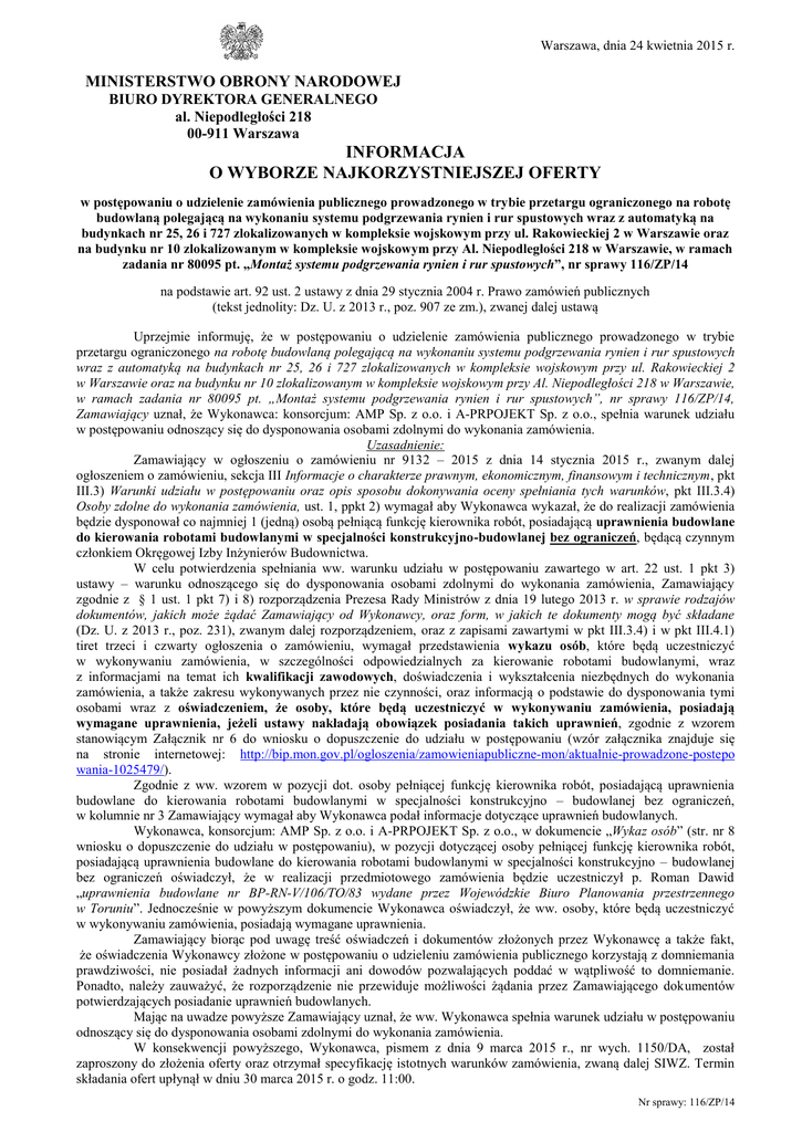 Warszawa, dnia 24 kwietnia 2015 r. MINISTERSTWO OBRONY NARODOWEJ BIURO DYREKTORA GENERALNEGO al. Niepodległości 218 00-911 Warszawa INFORMACJA O WYBORZE NAJKORZYSTNIEJSZEJ OFERTY w postępowaniu o udzielenie zamówienia publicznego prowadzonego w trybie przetargu ograniczonego na robotę budowlaną polegającą na wykonaniu systemu podgrzewania rynien i rur spustowych wraz z automatyką na budynkach nr 25, 26 i 727 zlokalizowanych w kompleksie wojskowym przy ul. Rakowieckiej 2 w Warszawie oraz na budynku nr 10 zlokalizowanym w kompleksie wojskowym przy Al. Niepodległości 218 w Warszawie, w ramach zadania nr 80095 pt. „Montaż systemu podgrzewania rynien i rur spustowych”, nr sprawy 116/ZP/14 na podstawie art. 92 ust. 2 ustawy z dnia 29 stycznia 2004 r. Prawo zamówień publicznych (tekst jednolity: Dz. U. z 2013 r., poz. 907 ze zm.), zwanej dalej ustawą Uprzejmie informuję, że w postępowaniu o udzielenie zamówienia publicznego prowadzonego w trybie przetargu ograniczonego na robotę budowlaną polegającą na wykonaniu systemu podgrzewania rynien i rur spustowych wraz z automatyką na budynkach nr 25, 26 i 727 zlokalizowanych w kompleksie wojskowym przy ul. Rakowieckiej 2 w Warszawie oraz na budynku nr 10 zlokalizowanym w kompleksie wojskowym przy Al. Niepodległości 218 w Warszawie, w ramach zadania nr 80095 pt. „Montaż systemu podgrzewania rynien i rur spustowych”, nr sprawy 116/ZP/14, Zamawiający uznał, że Wykonawca: konsorcjum: AMP Sp. z o.o. i A-PRPOJEKT Sp. z o.o., spełnia warunek udziału w postępowaniu odnoszący się do dysponowania osobami zdolnymi do wykonania zamówienia. Uzasadnienie: Zamawiający w ogłoszeniu o zamówieniu nr 9132 – 2015 z dnia 14 stycznia 2015 r., zwanym dalej ogłoszeniem o zamówieniu, sekcja III Informacje o charakterze prawnym, ekonomicznym, finansowym i technicznym, pkt III.3) Warunki udziału w postępowaniu oraz opis sposobu dokonywania oceny spełniania tych warunków, pkt III.3.4) Osoby zdolne do wykonania zamówienia, ust. 1, ppkt 2) wymagał aby Wykonawca wykazał, że do realizacji zamówienia będzie dysponował co najmniej 1 (jedną) osobą pełniącą funkcję kierownika robót, posiadającą uprawnienia budowlane do kierowania robotami budowlanymi w specjalności konstrukcyjno-budowlanej bez ograniczeń, będącą czynnym członkiem Okręgowej Izby Inżynierów Budownictwa. W celu potwierdzenia spełniania ww. warunku udziału w postępowaniu zawartego w art. 22 ust. 1 pkt 3) ustawy – warunku odnoszącego się do dysponowania osobami zdolnymi do wykonania zamówienia, Zamawiający zgodnie z § 1 ust. 1 pkt 7) i 8) rozporządzenia Prezesa Rady Ministrów z dnia 19 lutego 2013 r. w sprawie rodzajów dokumentów, jakich może żądać Zamawiający od Wykonawcy, oraz form, w jakich te dokumenty mogą być składane (Dz. U. z 2013 r., poz. 231), zwanym dalej rozporządzeniem, oraz z zapisami zawartymi w pkt III.3.4) i w pkt III.4.1) tiret trzeci i czwarty ogłoszenia o zamówieniu, wymagał przedstawienia wykazu osób, które będą uczestniczyć w wykonywaniu zamówienia, w szczególności odpowiedzialnych za kierowanie robotami budowlanymi, wraz z informacjami na temat ich kwalifikacji zawodowych, doświadczenia i wykształcenia niezbędnych do wykonania zamówienia, a także zakresu wykonywanych przez nie czynności, oraz informacją o podstawie do dysponowania tymi osobami wraz z oświadczeniem, że osoby, które będą uczestniczyć w wykonywaniu zamówienia, posiadają wymagane uprawnienia, jeżeli ustawy nakładają obowiązek posiadania takich uprawnień, zgodnie z wzorem stanowiącym Załącznik nr 6 do wniosku o dopuszczenie do udziału w postępowaniu (wzór załącznika znajduje się na stronie internetowej: http://bip.mon.gov.pl/ogloszenia/zamowieniapubliczne-mon/aktualnie-prowadzone-postepo wania-1025479/). Zgodnie z ww. wzorem w pozycji dot. osoby pełniącej funkcję kierownika robót, posiadającą uprawnienia budowlane do kierowania robotami budowlanymi w specjalności konstrukcyjno – budowlanej bez ograniczeń, w kolumnie nr 3 Zamawiający wymagał aby Wykonawca podał informacje dotyczące uprawnień budowlanych. Wykonawca, konsorcjum: AMP Sp. z o.o. i A-PRPOJEKT Sp. z o.o., w dokumencie „Wykaz osób” (str. nr 8 wniosku o dopuszczenie do udziału w postępowaniu), w pozycji dotyczącej osoby pełniącej funkcję kierownika robót, posiadającą uprawnienia budowlane do kierowania robotami budowlanymi w specjalności konstrukcyjno – budowlanej bez ograniczeń oświadczył, że w realizacji przedmiotowego zamówienia będzie uczestniczył p. Roman Dawid „uprawnienia budowlane nr BP-RN-V/106/TO/83 wydane przez Wojewódzkie Biuro Planowania przestrzennego w Toruniu”. Jednocześnie w powyższym dokumencie Wykonawca oświadczył, że ww. osoby, które będą uczestniczyć w wykonywaniu zamówienia, posiadają wymagane uprawnienia. Zamawiający biorąc pod uwagę treść oświadczeń i dokumentów złożonych przez Wykonawcę a także fakt, że oświadczenia Wykonawcy złożone w postępowaniu o udzieleniu zamówienia publicznego korzystają z domniemania prawdziwości, nie posiadał żadnych informacji ani dowodów pozwalających poddać w wątpliwość to domniemanie. Ponadto, należy zauważyć, że rozporządzenie nie przewiduje możliwości żądania przez Zamawiającego dokumentów potwierdzających posiadanie uprawnień budowlanych. Mając na uwadze powyższe Zamawiający uznał, że ww. Wykonawca spełnia warunek udziału w postępowaniu odnoszący się do dysponowania osobami zdolnymi do wykonania zamówienia. W konsekwencji powyższego, Wykonawca, pismem z dnia 9 marca 2015 r., nr wych. 1150/DA, został zaproszony do złożenia oferty oraz otrzymał specyfikację istotnych warunków zamówienia, zwaną dalej SIWZ. Termin składania ofert upłynął w dniu 30 marca 2015 r. o godz. 11:00. Nr sprawy: 116/ZP/14 Wykonawca w dniu 30 marca 2015 r. o godz. 10:45 złożył ofertę (nr 2), nr