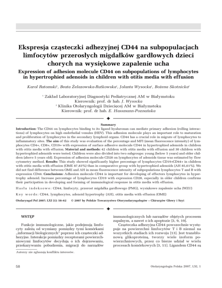 Ekspresja czàsteczki adhezyjnej CD44 na subpopulacjach limfocytów przeros∏ych migda∏ków gard∏owych dzieci chorych na wysi´kowe zapalenie ucha Expression of adhesion molecule CD44 on subpopulations of lymphocytes in hypertrophied adenoids in children with otitis media with effusion Karol Ratomski1, Beata ˚elazowska-Rutkowska1, Jolanta Wysocka1, Bo˝ena Skotnicka2 1 Zak∏ad Laboratoryjnej Diagnostyki Pediatrycznej AM w Bia∏ymstoku Kierownik: prof. dr hab. J. Wysocka 2 Klinika Otolaryngologii Dzieci´cej AM w Bia∏ymstoku Kierownik: prof. dr hab. E. Hassmann-Poznaƒska F Summary Introduction: The CD44 on lymphocytes binding to its ligand hyaluronan can mediate primary adhesion (rolling interactions) of lymphocytes on high endothelial venules (HEV). This adhesion molecule plays an important role to maturation and proliferation of lymphocytes in the secondary lymphoid organs. CD44 has a crucial role in migrate of lymphocytes to inflammatory sites. The aim of this study was evaluation of the percentage and MFI (mean fluorescence intensity) of lymphocytes CD4+, CD8+, CD19+ with expression of surface adhesive molecule CD44 in hypertrophied adenoids in children with otitis media with effusion. Material and methods: 42 children with otitis media with effusion and 30 children with hypertrophied adenoids were tested. Children were also divided into two subgroups: young (below 5 years) and older children (above 5 years old). Expression of adhesion molecule CD28 on lymphocytes of adenoids tissue was estimated by flow cytometry method. Results: This study showed significantly higher percentage of lymphocytes CD19+CD44+ in children with otitis media with effusion (OME 87,83%) than in comparative group with hypertrophied adenoids (AH 85,61%). We did not find difference between OME and AH in mean fluorescence intensity of subpopulations lymphocytes T and B with expression CD44. Conclusions: Adhesion molecule CD44 is important for developing of effectors lymphocytes in hypertrophy adenoid. Increase percentage of lymphocytes CD19 with expression CD28, especially in older children confirms their participation in developing and forming of immunological response in otitis media with effusion. H a s ∏ a i n d e k s o w e : CD44, limfocyty, przerost migda∏ka gard∏owego (PMG), wysi´kowe zapalenie ucha (WZU) K e y w o r d s : CD44, lymphocytes, adenoid hypertrophy (AH), otitis media with effusion (OME) Otolaryngol Pol 2007; LXI (1): 58–62 © 2007 by Polskie Towarzystwo Otorynolaryngologów – Chirurgów G∏owy i Szyi F WST¢P Funkcje immunologiczne, jakie podejmujà limfocyty zale˝à od wymiany pomi´dzy tymi komórkami „informacji biologicznych” poprzez ich czàsteczki adhezyjne. Interakcje pomi´dzy receptorami powierzchniowymi limfocytów decydujà o ich dojrzewaniu, przekazywaniu pobudzenia, migracji do narzàdów immunologicznych lub narzàdów obj´tych procesem zapalnym, a nawet o ich apoptozie [3, 9, 19]. Czàsteczka adhezyjna CD44 powszechnie wyst´puje na powierzchni limfocytów T i B niemal na wszystkich stadiach ich rozwoju [13]. Jest transb∏onowà glikoproteinà, tworzy wiele izoform powierzchniowych, przez co bierze udzia∏ w wielu procesach komórkowych [3, 11]. Ligandem CD44 sà Autorzy nie zg∏aszajà konfliktu interesów. 58 Otolaryngologia Polska 2007, LXI, 1 Ekspresja czàsteczki adhezyjnej CD44 czàsteczki kwasu hialuronowego obecne w macierzy pozakomórkowej [11, 15], jak równie˝ na komórkach Êródb∏onka [16, 21]. ObecnoÊç kwasu hialuronowego wykazano równie˝ na komórkach naczyƒ pozaw∏osowatych z wysokim Êródb∏onkiem (HEV) w drugorz´dowych narzàdach limfatycznych [6]. Migracja obwodowych limfocytów poza naczynia krwionoÊne zapoczàtkowana jest w procesie toczenia limfocytów po Êródb∏onku naczyƒ z udzia∏em CD44 i czàsteczek kwasu hialuronowego [2, 21]. Przechodzenie krà˝àcych limfocytów do tkanek, w których trwa proces zapalny z udzia∏em CD44, umo˝liwia rozwini´cie i utrzymanie w tym miejscu odpowiedzi zapalnej [11]. Czàsteczka CD44 bierze udzia∏ w T-komórkowo zale˝nym dojrzewaniu i ró˝nicowaniu naiwnych limfocytów B w tkance migda∏ka gard∏owego [14]. Przekazanie pobudzenia limfocytom B z udzia∏em innych czàsteczek kostymulujàcych CD40-CD40L, CD80-CD28 przyczynia si´ do funkcjonalnego formowania komórkowych oÊrodków rozmna˝ania i powstawania komórek B pami´ci zdolnych do rozwini´cia odpowiedzi immunologicznej [14]. Wi´kszoÊç limfocytów B migda∏ków z ekspresjà CD44 wytwarza immunoglobulin´ G, którà mo˝e dostarczaç nast´pnie do krà˝enia [4]. Celem badaƒ by∏a ocena odsetka limfocytów T i B z ekspresjà czàsteczki adhezyjnej CD44 w tkance przeros∏ych migda∏ków gard∏owych dzieci z wysi´kowym zapaleniem ucha Êrodkowego trwajàcym powy˝ej trzech miesi´cy. MATERIA¸ I METODY Grupa badana z przerostem migda∏ka gard∏owego i wysi´kowym zapaleniem ucha Êrodkowego trwajàcym powy˝ej 3 miesi´cy (WZU) liczy∏a 42 pacjentów w wieku od 2 do 17 roku ˝ycia. Grupa porównawcza jedynie z przerostem migda∏ków gard∏owych (PMG), którà stanowili rówieÊnicy, liczy∏a 30 dzieci. Ze wzgl´du na stopieƒ dojrza∏oÊci uk∏adu immunologicznego obydwie grupy WZU i PMU podzielono na podgrupy wiekowe dzieci m∏odszych (m∏) od 2 do 5 roku ˝ycia i dzieci starszych (st) od 6 do 17 roku ˝ycia. W grupie badanej wÊród dzieci m∏odszych WZUm∏ znalaz∏o si´ 19 osób, a w podgrupie dzieci starszych WZUst 23 badanych. Grupa dzieci m∏odszych z przerostem migda∏ka gard∏owego PMUm∏ liczy∏a 14 osób, a grupa starsza PMUst 16 dzieci. Otolaryngologia Polska 2007, LXI, 1 Materia∏em badanym by∏y migda∏ki gard∏owe uzyskane od dzieci w czasie zabiegu adenoidektomii przeprowadzonego w Klinice Otolaryngologii Dzieci´cej Akademii Medycznej w Bia∏ymstoku. Na wykonanie badaƒ uzyskano zgod´ Komisji Bioetycznej Akademii Medycznej w Bia∏ymstoku. Badania zosta∏y wy