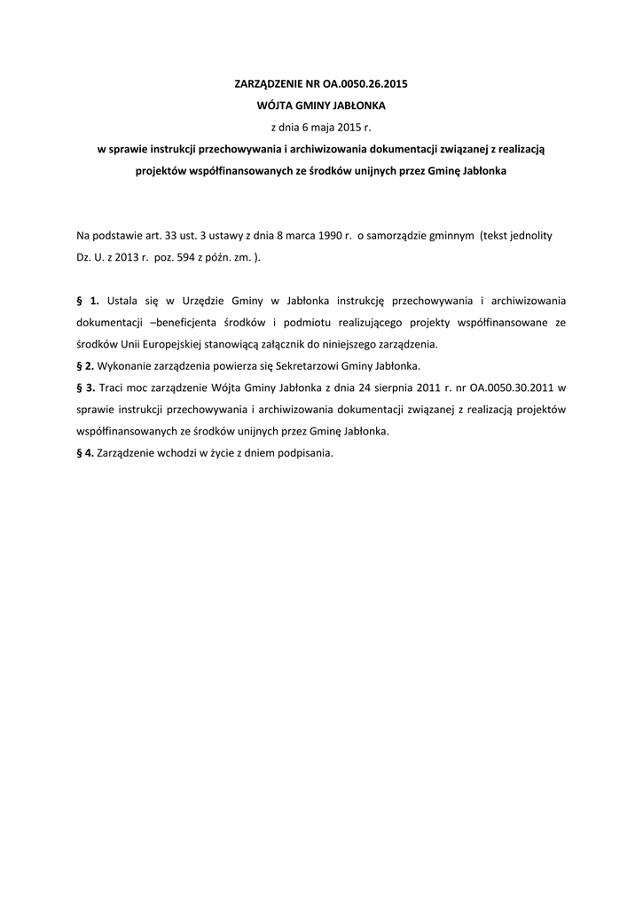 ZARZĄDZENIE NR OA.0050.26.2015 WÓJTA GMINY JABŁONKA z dnia 6 maja 2015 r. w sprawie instrukcji przechowywania i archiwizowania dokumentacji związanej z realizacją projektów współfinansowanych ze środków unijnych przez Gminę Jabłonka Na podstawie art. 33 ust. 3 ustawy z dnia 8 marca 1990 r. o samorządzie gminnym (tekst jednolity Dz. U. z 2013 r. poz. 594 z późn. zm. ). § 1. Ustala się w Urzędzie Gminy w Jabłonka instrukcję przechowywania i archiwizowania dokumentacji –beneficjenta środków i podmiotu realizującego projekty współfinansowane ze środków Unii Europejskiej stanowiącą załącznik do niniejszego zarządzenia. § 2. Wykonanie zarządzenia powierza się Sekretarzowi Gminy Jabłonka. § 3. Traci moc zarządzenie Wójta Gminy Jabłonka z dnia 24 sierpnia 2011 r. nr OA.0050.30.2011 w sprawie instrukcji przechowywania i archiwizowania dokumentacji związanej z realizacją projektów współfinansowanych ze środków unijnych przez Gminę Jabłonka. § 4. Zarządzenie wchodzi w życie z dniem podpisania. Załącznik do Zarządzenia Nr OA.0050.26.2015 Wójta Gminy Jabłonka z dnia 6 maja 2015 r. INSTRUKCJA PRZECHOWYWANIA I ARCHIWIZOWANIA DOKUMENTACJI ZWIĄZANEJ Z REALIZACJĄ PROJEKTÓW WSPÓŁFINANSOWANYCH ZE ŚRODKÓW UNIJNYCH PRZEZ GMINĘ JABŁONKA § 1 Ustala się zasady archiwizacji dokumentów dotyczących projektów współfinansowanych ze środków unijnych realizowanych przez Gminę Jabłonka § 2 Kompletna dokumentacja związana z wdrażaniem i finansowaniem projektów podlega archiwizacji zgodnie z instrukcją kancelaryjną dla organów gmin i związków międzygminnych, z zastrzeżeniem, iż okres przechowywania dokumentacji związanej z realizacją projektu współfinansowanego ze środków Unii Europejskiej nie może być krótszy niż termin archiwizowania określony w umowie o dofinansowanie oraz wytycznych Instytucji Zarządzającej. § 3 Dokumenty przechowywane będą w Referacie Strategii i Promocji, Referacie Inwestycji i Ochrony Środowiska oraz Referacie Finansów w formie oryginałów lub na powszechnie uznanych nośnikach danych, do których należą: 1. Kserokopie dokumentów oryginalnych, potwierdzone za zgodność z oryginałem, 2. Wersje elektroniczne dokumentów oryginalnych na nośnikach informatycznych, § 4 W szczególności należy przechowywać następujące dokumenty wraz z załącznikami (w tym wersje elektroniczne, jeżeli istnieją): 1. Wniosek o dofinansowanie projektu wraz z załącznikami, 2. Pisma z Instytucji Zarządzającej , 3. Umowa o dofinansowanie projektu z aneksami, 4. Wnioski o płatność wraz z załącznikami, dokumenty potwierdzające poniesienie wydatków w ramach projektu, 5. Sprawozdania, harmonogramy i dokumenty potwierdzające zawarte w nich informacje, 6. Dokumenty potwierdzające osiągnięcie zakładanych efektów projektu, protokoły odbioru, dzienniki budowy, kosztorysy inwestorskie, inwentaryzacje powykonawcze, pozwolenia , 7. Dokumentację dotyczącą zamówień publicznych, 8. Dokumentację dotyczącą wyboru najkorzystniejszej oferty w przypadku zapytań ofertowych, 9. Umowy zawarte w związku z realizowanym projektem, 10. Dokumenty związane z prowadzeniem wyodrębnionej księgowości, w tym politykę rachunkowości, plany kont, wydruki z ewidencji księgowej, ewidencji środków trwałych oraz wartości niematerialnych i prawnych, 11. Faktury i inne dokumenty potwierdzające poniesienie wydatków, 12. Wyciągi z konta bankowego projektu, 13. Dokumentację z przeprowadzonych kontroli dot. projektu, § 5 Za zabezpieczenie i archiwizację dokumentów odpowiedzialne są wszystkie komórki Urzędu Gminy Jabłonka zaangażowane w zakresie merytorycznym i pomocniczym w realizację projektu. § 6 Zarządzenie wchodzi w życie z dniem podpisania