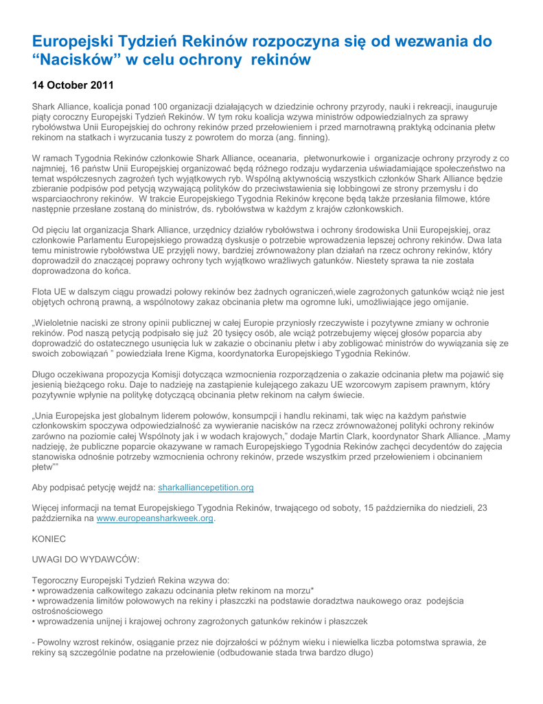 Europejski Tydzień Rekinów rozpoczyna się od wezwania do “Nacisków” w celu ochrony rekinów 14 October 2011 Shark Alliance, koalicja ponad 100 organizacji działających w dziedzinie ochrony przyrody, nauki i rekreacji, inauguruje piąty coroczny Europejski Tydzień Rekinów. W tym roku koalicja wzywa ministrów odpowiedzialnych za sprawy rybołówstwa Unii Europejskiej do ochrony rekinów przed przełowieniem i przed marnotrawną praktyką odcinania płetw rekinom na statkach i wyrzucania tuszy z powrotem do morza (ang. finning). W ramach Tygodnia Rekinów członkowie Shark Alliance, oceanaria, płetwonurkowie i organizacje ochrony przyrody z co najmniej, 16 państw Unii Europejskiej organizować będą różnego rodzaju wydarzenia uświadamiające społeczeństwo na temat współczesnych zagrożeń tych wyjątkowych ryb. Wspólną aktywnością wszystkich członków Shark Alliance będzie zbieranie podpisów pod petycją wzywającą polityków do przeciwstawienia się lobbingowi ze strony przemysłu i do wsparciaochrony rekinów. W trakcie Europejskiego Tygodnia Rekinów kręcone będą także przesłania filmowe, które następnie przesłane zostaną do ministrów, ds. rybołówstwa w każdym z krajów członkowskich. Od pięciu lat organizacja Shark Alliance, urzędnicy działów rybołówstwa i ochrony środowiska Unii Europejskiej, oraz członkowie Parlamentu Europejskiego prowadzą dyskusje o potrzebie wprowadzenia lepszej ochrony rekinów. Dwa lata temu ministrowie rybołówstwa UE przyjęli nowy, bardziej zrównoważony plan działań na rzecz ochrony rekinów, który doprowadził do znaczącej poprawy ochrony tych wyjątkowo wrażliwych gatunków. Niestety sprawa ta nie została doprowadzona do końca. Flota UE w dalszym ciągu prowadzi połowy rekinów bez żadnych ograniczeń,wiele zagrożonych gatunków wciąż nie jest objętych ochroną prawną, a wspólnotowy zakaz obcinania płetw ma ogromne luki, umożliwiające jego omijanie. „Wieloletnie naciski ze strony opinii publicznej w całej Europie przyniosły rzeczywiste i pozytywne zmiany w ochronie rekinów. Pod naszą petycją podpisało się już 20 tysięcy osób, ale wciąż potrzebujemy więcej głosów poparcia aby doprowadzić do ostatecznego usunięcia luk w zakazie o obcinaniu płetw i aby zobligować ministrów do wywiązania się ze swoich zobowiązań ” powiedziała Irene Kigma, koordynatorka Europejskiego Tygodnia Rekinów. Długo oczekiwana propozycja Komisji dotycząca wzmocnienia rozporządzenia o zakazie odcinania płetw ma pojawić się jesienią bieżącego roku. Daje to nadzieję na zastąpienie kulejącego zakazu UE wzorcowym zapisem prawnym, który pozytywnie wpłynie na politykę dotyczącą obcinania płetw rekinom na całym świecie. „Unia Europejska jest globalnym liderem połowów, konsumpcji i handlu rekinami, tak więc na każdym państwie członkowskim spoczywa odpowiedzialność za wywieranie nacisków na rzecz zrównoważonej polityki ochrony rekinów zarówno na poziomie całej Wspólnoty jak i w wodach krajowych,” dodaje Martin Clark, koordynator Shark Alliance. „Mamy nadzieję, że publiczne poparcie okazywane w ramach Europejskiego Tygodnia Rekinów zachęci decydentów do zajęcia stanowiska odnośnie potrzeby wzmocnienia ochrony rekinów, przede wszystkim przed przełowieniem i obcinaniem płetw”” Aby podpisać petycję wejdź na: sharkalliancepetition.org Więcej informacji na temat Europejskiego Tygodnia Rekinów, trwającego od soboty, 15 października do niedzieli, 23 października na www.europeansharkweek.org. KONIEC UWAGI DO WYDAWCÓW: Tegoroczny Europejski Tydzień Rekina wzywa do: • wprowadzenia całkowitego zakazu odcinania płetw rekinom na morzu* • wprowadzenia limitów połowowych na rekiny i płaszczki na podstawie doradztwa naukowego oraz podejścia ostrośnościowego • wprowadzenia unijnej i krajowej ochrony zagrożonych gatunków rekinów i płaszczek - Powolny wzrost rekinów, osiąganie przez nie dojrzałości w późnym wieku i niewielka liczba potomstwa sprawia, że rekiny są szczególnie podatne na przełowienie (odbudowanie stada trwa bardzo długo) - Wysoka cena płetw rekina kontrastuje z niską rynkową wartością jego mięsa, co stwarza ekonomiczną zachętę do obcinania płetw rekinom na morzu. Postulowane m.in. przez Shark Alliance wprowadzenie obowiązku wyładunku całych ciał rekinów (z płetwami naturalnie przymocowanymi do tuszy) nie tylko skutecznie powstrzyma praktykę obcinania rekinom płetw na morzu, ale również znacznie ułatwi zbieranie danych o poławianych gatunkach, które są niezbędne do oceny populacji i zarządzania nią. - *Mimo, że obecnie obowiązujące rozporządzenie unijne zakazuje obcinania płetw rekinom na morzu, derogacja pozwala państwom członkowskim na wydawanie na to rybakom specjalnych zezwoleń, pod warunkiem, że współczynnik masy płetwy rekina do złowionego całego osobnika nie przekracza 5%. Ten współczynnik jest wyższy, stąd bardziej pobłażliwe współczynniki stosowane są w innych krajach. Ponadto rybacy posiadający zezwolenie mogą w pełni legalnie dokonywać wyładunku płetw i tusz rekinów w osobnych portach, co znacznie utrudnia kontrolę i egzekwowanie prawa. Niemcy i Wielka Brytania ostatnio zaprzestały wydawania tych pozwoleń. Hiszpania i Portugalia wydają je wciąż większości rybaków łowiących rekiny. Cypr ostatnio wydał jedno takie zezwolenie. - Wspólnotowy Plan działania na rzecz ochrony rekinów zawiera, między innymi, zobowiązanie do wzmocnienia zakazu odcinania płetw rekinom w UE. W 2009 roku Rada UE przyjęła ten plan i wezwała Komisję UE do zwrócenia szczególnej uwagi i nadania priorytetowego znaczenia kwestii zakazu odcinania płetw. - Na początku roku Komisja Europejska zakończyła trzymiesięczne publiczne konsultacje na temat opcji zmiany rozporządzenia o zakazie odcinania płetw, zawierającego zakaz odcinania płetw na morzu.