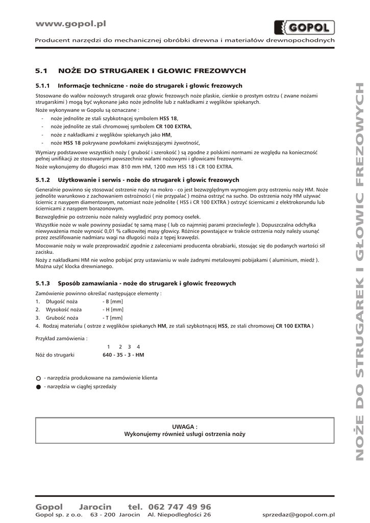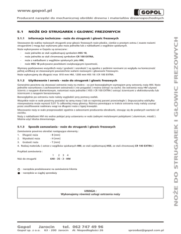 www.gopol.pl Producent narzędzi do mechanicznej obróbki drewna i materiałów drewnopochodnych 5.1 NOŻE DO STRUGAREK I GŁOWIC FREZOWYCH 5.1.1 Informacje techniczne - noże do strugarek i głowic frezowych Stosowane do wałów nożowych strugarek oraz głowic frezowych noże płaskie, cienkie o prostym ostrzu ( zwane nożami strugarskimi ) mogą być wykonane jako noże jednolite lub z nakładkami z węglików spiekanych. Noże wykonywane w Gopolu są oznaczane : - noże jednolite ze stali szybkotnącej symbolem HSS 18, - noże jednolite ze stali chromowej symbolem CR 100 EXTRA, - noże z nakładkami z węglików spiekanych jako HM, - noże HSS 18 pokrywane powłokami zwiększającymi żywotność, Wymiary podstawowe wszystkich noży ( grubość i szerokość ) są zgodne z polskimi normami ze względu na konieczność pełnej unifikacji ze stosowanymi powszechnie wałami nożowymi i głowicami frezowymi. Noże wykonujemy do długości max 810 mm HM, 1200 mm HSS 18 i CR 100 EXTRA. 5.1.2 Użytkowanie i serwis - noże do strugarek i głowic frezowych Generalnie powinno się stosować ostrzenie noży na mokro - co jest bezwzględnym wymogiem przy ostrzeniu noży HM. Noże jednolite warunkowo z zachowaniem ostrożności ( nie przypalać ) można ostrzyć na sucho. Do ostrzenia noży HM używać ściernic z nasypem diamentowym, natomiast noże jednolite ( HSS i CR 100 EXTRA ) ostrzyć ściernicami z elektrokorundu lub ściernicami z nasypem borazonowym. Bezwzględnie po ostrzeniu noże należy wygładzić przy pomocy osełek. Wszystkie noże w wale powinny posiadać tę samą masę ( lub co najmniej parami przeciwległe ). Dopuszczalna odchyłka niewyważenia może wynosić 0,01 % całkowitej masy głowicy. Różnice powstające w trakcie ostrzenia noży należy usunąć przez zeszlifowanie nadmiaru wagi na długości noża z tępej krawędzi. Mocowanie noży w wale przeprowadzić zgodnie z zaleceniami producenta obrabiarki, stosując się do podanych wartości sił zacisku. Noży z nakładkami HM nie wolno pobijać przy ustawianiu w wale żadnymi metalowymi pobijakami ( aluminium, miedź ). Można użyć klocka drewnianego. 5.1.3 Sposób zamawiania - noże do strugarek i głowic frezowych Zamówienie powinno określać następujące elementy : 1. Długość noża - B [mm] 2. Wysokość noża - H [mm] 3. Grubość noża - T [mm] 4. Rodzaj materiału ( ostrze z węglików spiekanych HM, ze stali szybkotnącej HSS, ze stali chromowej CR 100 EXTRA ) Przykład zamówienia : 1 Nóż do strugarki 2 3 4 640 - 35 - 3 - HM - narzędzia produkowane na zamówienie klienta - narzędzia w ciągłej sprzedaży UWAGA : Wykonujemy również usługi ostrzenia noży Gopol Jarocin Gopol sp. z o.o. tel. 062 747 49 96 63 - 200 Jarocin Al. Niepodległości 26 [email protected]