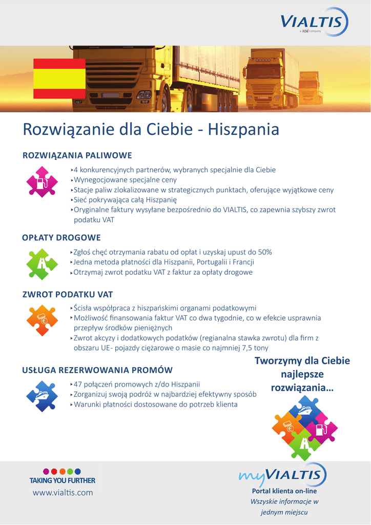 a company Rozwiązanie dla Ciebie - Hiszpania ROZWIĄZANIA PALIWOWE 4 konkurencyjnych partnerów, wybranych specjalnie dla Ciebie Wynegocjowane specjalne ceny Stacje paliw zlokalizowane w strategicznych punktach, oferujące wyjątkowe ceny Sieć pokrywająca całą Hiszpanię Oryginalne faktury wysyłane bezpośrednio do VIALTIS, co zapewnia szybszy zwrot podatku VAT OPŁATY DROGOWE Zgłoś chęć otrzymania rabatu od opłat i uzyskaj upust do 50% Jedna metoda płatności dla Hiszpanii, Portugalii i Francji Otrzymaj zwrot podatku VAT z faktur za opłaty drogowe ZWROT PODATKU VAT Ścisła współpraca z hiszpańskimi organami podatkowymi Możliwość finansowania faktur VAT co dwa tygodnie, co w efekcie usprawnia przepływ środków pieniężnych Zwrot akcyzy i dodatkowych podatków (regianalna stawka zwrotu) dla firm z obszaru UE - pojazdy ciężarowe o masie co najmniej 7,5 tony USŁUGA REZERWOWANIA PROMÓW Tworzymy dla Ciebie najlepsze rozwiązania… 47 połączeń promowych z/do Hiszpanii Zorganizuj swoją podróż w najbardziej efektywny sposób Warunki płatności dostosowane do potrzeb klienta www.vial www vial ss.com com Portal klienta on-line Wszyskie informacje w jednym miejscu