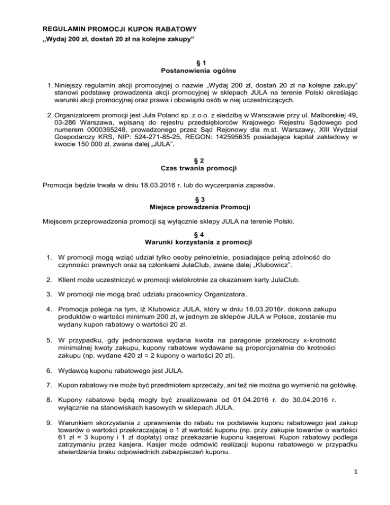 REGULAMIN PROMOCJI KUPON RABATOWY „Wydaj 200 zł, dostań 20 zł na kolejne zakupy” §1 Postanowienia ogólne 1. Niniejszy regulamin akcji promocyjnej o nazwie „Wydaj 200 zł, dostań 20 zł na kolejne zakupy” stanowi podstawę prowadzenia akcji promocyjnej w sklepach JULA na terenie Polski określając warunki akcji promocyjnej oraz prawa i obowiązki osób w niej uczestniczących. 2. Organizatorem promocji jest Jula Poland sp. z o.o. z siedzibą w Warszawie przy ul. Malborskiej 49, 03-286 Warszawa, wpisaną do rejestru przedsiębiorców Krajowego Rejestru Sądowego pod numerem 0000365248, prowadzonego przez Sąd Rejonowy dla m.st. Warszawy, XIII Wydział Gospodarczy KRS, NIP: 524-271-85-25, REGON: 142595635 posiadająca kapitał zakładowy w kwocie 150 000 zł, zwana dalej „JULA”. §2 Czas trwania promocji Promocja będzie trwała w dniu 18.03.2016 r. lub do wyczerpania zapasów. §3 Miejsce prowadzenia Promocji Miejscem przeprowadzenia promocji są wyłącznie sklepy JULA na terenie Polski. §4 Warunki korzystania z promocji 1. W promocji mogą wziąć udział tylko osoby pełnoletnie, posiadające pełną zdolność do czynności prawnych oraz są członkami JulaClub, zwane dalej „Klubowicz”. 2. Klient może uczestniczyć w promocji wielokrotnie za okazaniem karty JulaClub. 3. W promocji nie mogą brać udziału pracownicy Organizatora. 4. Promocja polega na tym, iż Klubowicz JULA, który w dniu 18.03.2016r. dokona zakupu produktów o wartości minimum 200 zł, w jednym ze sklepów JULA w Polsce, zostanie mu wydany kupon rabatowy o wartości 20 zł. 5. W przypadku, gdy jednorazowa wydana kwota na paragonie przekroczy x-krotność minimalnej kwoty zakupu, kupony rabatowe wydawane są proporcjonalnie do krotności zakupu (np. wydane 420 zł = 2 kupony o wartości 20 zł). 6. Wydawcą kuponu rabatowego jest JULA. 7. Kupon rabatowy nie może być przedmiotem sprzedaży, ani też nie można go wymienić na gotówkę. 8. Kupony rabatowe będą mogły być zrealizowane od 01.04.2016 r. do 30.04.2016 r. wyłącznie na stanowiskach kasowych w sklepach JULA. 9. Warunkiem skorzystania z uprawnienia do rabatu na podstawie kuponu rabatowego jest zakup towarów o wartości przekraczającej o 1 zł wartość kuponu (np. przy zakupie towarów o wartości 61 zł = 3 kupony i 1 zł dopłaty) oraz przekazanie kuponu kasjerowi. Kupon rabatowy podlega zatrzymaniu przez kasjera. Kasjer może odmówić realizacji kuponu rabatowego w przypadku stwierdzenia braku odpowiednich zabezpieczeń kuponu. 1 10. Do jednej transakcji kasowej może być użytych kilka kuponów rabatowych. Kwota kuponów rabatowych jest odejmowana od całkowitej ceny nabytych towarów na paragonie (tj. ostateczna cena = całkowita cena nabytych towarów - kwota rabatów). 11. Ostateczną cenę za towar (kwotę należną) po udzieleniu rabatu Klubowicz zobowiązany jest uiścić korzystając z odpowiedniego środka płatniczego. 12. Niezrealizowany kupon rabatowy traci swoją ważność po upływie terminu, na który został wystawiony. W przypadku braku określenia na kuponie terminu jego ważności traci on swoją ważność po upływie okresu trwania promocji. 13. Niniejsza promocja nie łączy się z innymi promocjami prowadzonymi przez JULA. §5 Zasady zwrotu towaru 1. Klubowicz ma możliwość zwrotu towaru nabytego w sklepach JULA w ciągu 30 dni od chwili zakupu, po okazaniu w sklepie JULA dowodu zakupu tego towaru (np. paragonu fiskalnego, faktury VAT itd.) oraz pod warunkiem, że towar jest kompletny, nie nosi jakichkolwiek śladów użytkowania i pozostaje w oryginalnym opakowaniu. 2. Zwrot ceny zakupu towaru następuje w takiej samej formie, w jakiej uregulowana była płatność w chwili zakupu towaru. 3. W przypadku zwrotu towaru nabytego przy wykorzystaniu kuponu rabatowego, JULA zwróci wyłącznie cenę zapłaconą za ten towar po odjęciu wartości kuponu rabatowego zrealizowanego podczas transakcji kupna. Klient dokonujący zwrotu towaru zakupionego z bonem 20zł, traci do niego prawo. 4. W przypadku, gdy Klubowicz nie zwraca wszystkich zakupionych na jednym paragonie towarów, otrzymuje zwrot gotówki pomniejszony proporcjonalnie o wartość kuponu. 5. W przypadku zwrotu towaru zakupionego w dniu 18.03.2016 r. do którego został wydany kupon rabatowy, Klubowicz traci uprawnienia do kuponu rabatowego i jest zobowiązany do zwrócenia kuponu rabatowego wraz z dowodem zakupu towaru opisanym przez kasjera JULA. W przeciwnym wypadku towar nie podlega zwrotowi. §6 Postanowienia końcowe 1. Wzięcie udziału w promocji oznacza zgodę Klubowicza na warunki promocji określone w niniejszym regulaminie. 2. Niniejszy regulamin promocji dostępny jest w punktach obsługi Klienta w sklepach JULA na terenie Polski oraz na stronie www.jula.pl. 3. W sprawach nieuregulowanych niniejszym regulaminem mają zastosowanie odpowiednie przepisy kodeksu cywilnego. 4. JULA zastrzega sobie prawo do odwołania, skrócenia lub wydłużenia trwania promocji lub zmiany regulaminu w trakcie trwania promocji bez podawania przyczyn poprzez umieszczenie takiej informacji na stronie www.jula.pl. Data: 17.03.2016 r. 2