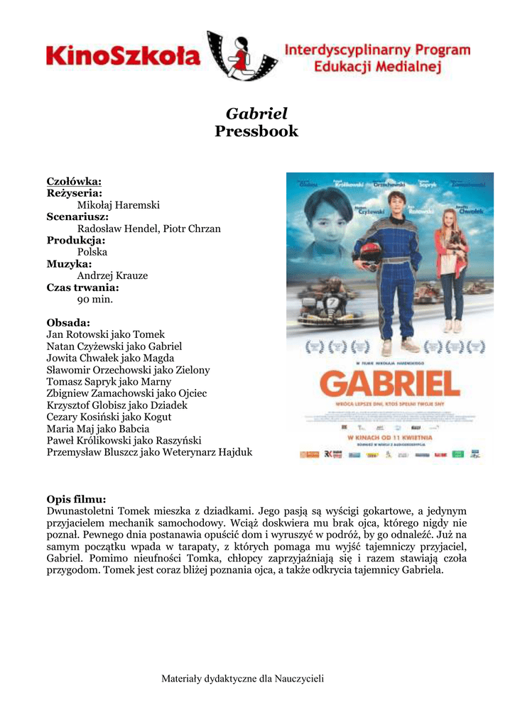 Gabriel Pressbook Czołówka: Reżyseria: Mikołaj Haremski Scenariusz: Radosław Hendel, Piotr Chrzan Produkcja: Polska Muzyka: Andrzej Krauze Czas trwania: 90 min. Obsada: Jan Rotowski jako Tomek Natan Czyżewski jako Gabriel Jowita Chwałek jako Magda Sławomir Orzechowski jako Zielony Tomasz Sapryk jako Marny Zbigniew Zamachowski jako Ojciec Krzysztof Globisz jako Dziadek Cezary Kosiński jako Kogut Maria Maj jako Babcia Paweł Królikowski jako Raszyński Przemysław Bluszcz jako Weterynarz Hajduk Opis filmu: Dwunastoletni Tomek mieszka z dziadkami. Jego pasją są wyścigi gokartowe, a jedynym przyjacielem mechanik samochodowy. Wciąż doskwiera mu brak ojca, którego nigdy nie poznał. Pewnego dnia postanawia opuścić dom i wyruszyć w podróż, by go odnaleźć. Już na samym początku wpada w tarapaty, z których pomaga mu wyjść tajemniczy przyjaciel, Gabriel. Pomimo nieufności Tomka, chłopcy zaprzyjaźniają się i razem stawiają czoła przygodom. Tomek jest coraz bliżej poznania ojca, a także odkrycia tajemnicy Gabriela. Materiały dydaktyczne dla Nauczycieli O PRODUKCJI: Nagradzany na międzynarodowych festiwalach filmów dla dzieci i młodzieży familijny film przygodowy ze Zbigniewem Zamachowskim, Krzysztofem Globiszem i Pawłem Królikowskim oraz młodymi aktorami Janem Rotowskim i Natanem Czyżewskim w rolach głównych. Pozytywny film o przyjaźni i o tym, że warto mieć marzenia i je realizować. FESTIWALE I NAGRODY § Międzynarodowy Festiwal Filmów dla Dzieci w Toronto, Kanada, (8-21.IV.2014) § Festiwal Filmów dla Dzieci w Sztokholmie, Sweden (7-12.IV.2014) § Festiwal Filmów dla Dzieci Prowidence, USA (13-23.II.2014) § 4. Green Bay Film Festival (21-23.II.2014) - konkurs Filmy Familmów dla Dzieci i Filmów Familijnych - Nagroda Publiczności § Festiwal Filmów dla Dzieci w Seattle (23.I – 08.II. 2014) § 31. Międzynarodowy Festiwal Filmów Młodego Widza, Ale Kino! (1-8.XII.2013) § 18. Międzynarodowy Festiwal Filmów dla Dzieci SCHLINGEL (14-20.X.2013) - Nagroda Specjalna Jury § Festiwal Filmów Polskich w Seattle (11-20.X.2013) § 25. Festiwal Filmów Polskich w Chicago (8-24.XI.2013) § 18. Międzynarodowy Festiwal dla Dzieci w Indiach (14-20.XI.2013) § Międzynarodowy Festiwal Filmowy Cinerockom (17 -20.IX 2013) Nagroda w kategorii Najlepszy Film Nagroda w kategorii Najlepsze Zdjęcia - Jan Paweł Trzaska Nagroda w kategorii Najlepsza Muzyka - Andrzej Krauze Najlepszy w kategorii Młody Aktor - Jan Rotowski Na podstawie materiałów: http://www.i-film.eu/wp-content/uploads/2014/02/GABRIEL-PRESS-KIT-11.pdf http://www.filmweb.pl/film/Gabriel-2013-662232 Materiały dydaktyczne dla Nauczycieli