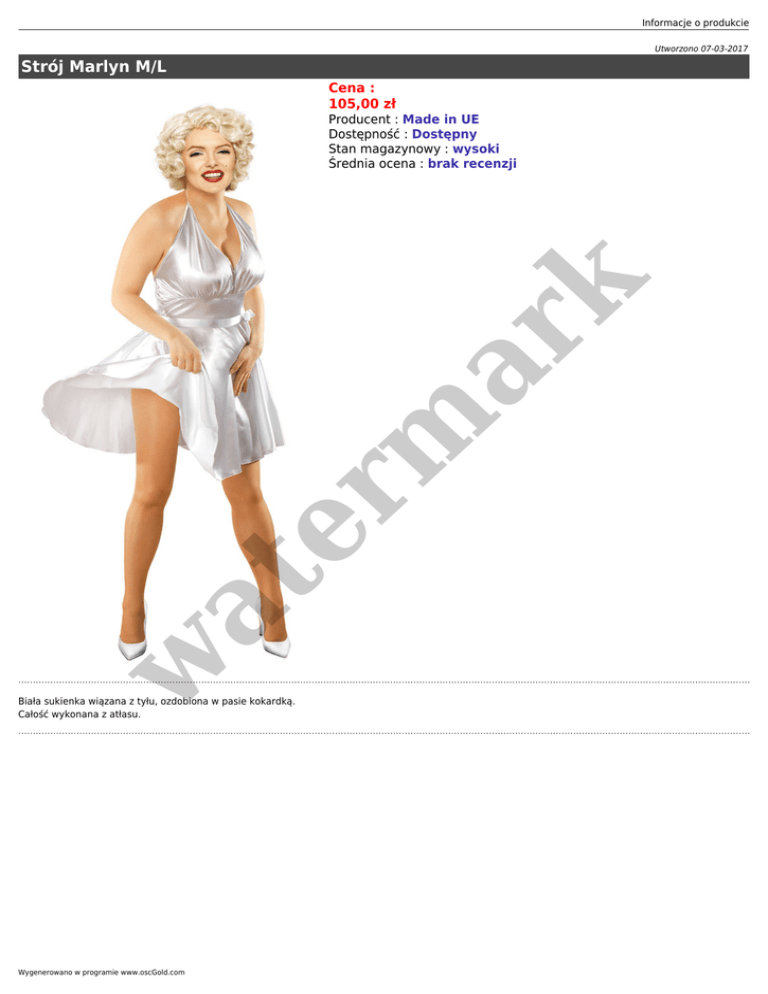 Informacje o produkcie Utworzono 07-03-2017 Strój Marlyn M/L Cena : 105,00 zł w at er m ar k Producent : Made in UE Dostępność : Dostępny Stan magazynowy : wysoki Średnia ocena : brak recenzji Biała sukienka wiązana z tyłu, ozdobiona w pasie kokardką. Całość wykonana z atłasu. Wygenerowano w programie www.oscGold.com