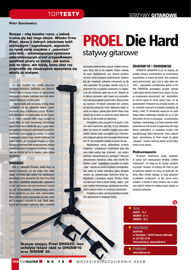 TOPTESTY STATYWY GITAROWE Piotr Danielewicz Statyw – niby banalna rzecz, a jednak trudno się bez niego obejść. Włoska firma Proel, znana z dobrych jakościowo kabli zasilających i sygnałowych, wypuściła na rynek serie stojaków z „patentem” auto-lock – automatycznym systemem zabezpieczającym przed przypadkowym upadkiem gitary za ziemię. Jak ważna jest to rzecz, wie każdy, komu choć raz przytrafiło się nieszczęście wysunięcia się wiosła ze statywu. Do testu dostałem trzy modele, oznaczone symbolami DHGSW10, DHGSW30 oraz DHGS20. Pierwsze dwa to uchwyty służące do zamocowania instrumentu na ścianie, natomiast trzeci jest wolnostojącym stojakiem na jedną gitarę. Najważniejszą, jeśli nie jedyną, funkcją owego „ustrojstwa” jest jak najbardziej stabilne i pewne utrzymanie gitary w zamierzonej pozycji. W warunkach domowych, co prawda gitara nie jest narażona na multum zagrożeń, które mogą wystąpić na scenie. Mam na myśli nieuważnego technicznego panoszącego się po scenie lub, jak to często bywa, szczególnie na mniejszych, plenerowych koncertach, niepokojąco chyboczącego się podestu. Co prawda w domowym zaciszu mogą również zaskoczyć nas pewne aspekty, jak na przykład biegający po domu labrador lub kochany kotek naszej wybranki, którego największa pasją jest drapanie wszystkiego, co znajduje się dookoła (ale na to, niestety, żaden statyw nie pomoże). DHGS20 Pod tą melodyjnie brzmiącą nazwa kryje się typowy na pierwszy rzut oka stojak, który dzięki swojej mobilności jako jedyny ma zastosowanie koncertowe. Seria akcesoriów Die Hard firmy Proel jest znana z produktów znanych jako „zaprawione w boju”, jak mówią o nich sami producenci. Szczycą się one wytrzymałością i niezawodnością, sprawdzoną i docenioną już przez wielu użytkowników. Mimo usilnych starań zaprzeczenia tej tezie muszę dać za wygraną i przyznać im rację. Stojak autentycznie jest porządnie wykonany, lekki, a chwytnię PROEL Die Hard statywy gitarowe dla bezpieczeństwa lakieru pokryto miękkim tworzywem. Gitara stoi na nim stabilnie. Statyw rozkłada się wręcz błyskawicznie, a po złożeniu przybiera rozmiary bardzo przyjazne użytkownikowi. Zarówno kąt, jak i wysokość położenia instrumentu są dla mnie optymalne. Na początku zdziwiło mnie to, że instrument jest w zasadzie powieszony na stojaku, a nie, jak zazwyczaj, opiera się na nim. Okazało się to dobrym pomysłem, gdyż nawet przy przypadkowym potrąceniu główki wiosła trudno całą konstrukcję wywrócić. W małych statywach bez uchwytu na gryf przy potrąceniu może i faktycznie stojak zostanie na miejscu, jednak gitara bardzo łatwo może znaleźć się na ziemi, co raczej nie rokuje dobrze ani dla niej, ani dla nerwów jej właściciela. Szczegółem, który przypadł mi do gustu i o którym warto wspomnieć, jest fakt, iż przy odkładaniu gitary nie muszę się martwić o wygięty przez dolne widełki statywu kabel (szczególnie przy instrumentach mających gniazdo Jack na swojej dolnej krawędzi). W tym przypadku widełek po prostu nie ma. Najciekawszą rzeczą zastosowaną w owym urządzeniu – przepraszam: urządzeniach, gdyż cała seria działa według tego schematu – jest system auto-lock, czyli automatyczny „zamykacz”, który jest zdecydowanie największą zaletą całej rodzinki Die Hardów. „Łapa”, wyglądająca z początku na zwykły „bajer”, okazała się bardzo przydatna i funkcjonalna. Gdy nawet na chwilę odkładamy gitarę, dźwignia zamyka się, zabezpieczając instrument przed wyślizgnięciem z pożądanej pozycji. Pomimo moich początkowych obaw o jakość owego „bajeru”, podczas możliwie intensywnego użytkowania nie stwierdziłem żadnych luzów na ruchomych elementach. Przejdźmy w takim razie do pozostałych produktów, opisywanych w niniejszym teście. DHGSW10 i DHGSW30 DHGSW10 i DHGSW30 to już nie statywy, ale bardziej uchwyty przystosowane do zamocowania bezpośrednio na ścianie lub listwie. Oba urządzenia opiszę jednocześnie, gdyż różni je tylko jeden element – odpowiednio ukształtowana blacha w modelu DHGSW30, pozwalająca zaczepić wieszak o jakiś płaski element (listwę?) przy ścianie. Od razu po rozpakowaniu niepozornych „łap”, stwierdziłem, że montaż zajmie mi trochę więcej czasu, niż się spodziewałem. Producent nie pomyślał bowiem, że do uchwytów ściennych w zestawie przydałyby się wkręty i kołki. Po dwukrotnej wycieczce do pobliskiego sklepu metalowego (okazało się, że na tych elementach nie ma co oszczędzać – po powieszeniu ciężkiego, mahoniowego Les Paula przymały kołek postanowił po woli opuścić przygotowaną dla niego dziurę) stwierdziłem, że urządzenia w pełni mnie satysfakcjonują. Gitara wisi pewnie i mimo usilnych starań udowodnienia, że Proel musiał się gdzieś „wysypać” i system auto-lock jednak nie jest fajny, znowu mi nie wyszło... Podsumowanie W ramach zakończenia muszę stwierdzić, że oprócz tych nieszczęsnych wkrętów i kołków rozporowych, nie mogę się do niczego poważnie przyczepić. Uważam, że statywy Die Hard są godne polecenia zarówno na scenę, do studia jak i do domu. Mam również nadzieję, że śruby zakupione w pobliskim „metalowym” na tyle mocno zamocowałem, iż będzie to dobry pretekst, aby na jakiś czas opóźnić oddanie do redakcji owych, dobrze mi służących uchwytów. td Cena: DHGS20 - 74 zł DHGSW10 - 27 zł DHGSW30 - 28 zł Dystrybutor: Statyw stojący Proel DHGS20, dwa uchwyty leżące obok to DHGSW10 oraz DHGSW 30. 128 TOPGUITAR k N R 1 8 k SoundTrade ul. Kineskopowa 1, 05-500 Piaseczno k/Warszawy tel. 022 632 02 85 [email protected], www.soundtrade.pl Producent: www.proelgroup.com W R Z E S I E Ń / PA Ź D Z I E R N I K 2 0 0 8