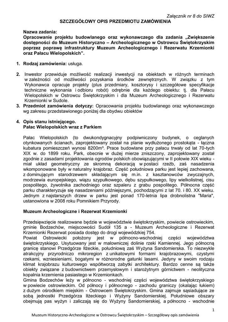 Załącznik nr 8 do SIWZ SZCZEGÓŁOWY OPIS PRZEDMIOTU ZAMÓWIENIA Nazwa zadania: Opracowanie projektu budowlanego oraz wykonawczego dla zadania „Zwiększenie dostępności do Muzeum Historyczno – Archeologicznego w Ostrowcu Świętokrzyskim poprzez poprawę infrastruktury Muzeum Archeologicznego i Rezerwatu Krzemionki oraz Pałacu Wielopolskich”. 1. Rodzaj zamówienia: usługa. 2. Inwestor przewiduje możliwość realizacji inwestycji na obiektach w różnych terminach w zależności od możliwości pozyskania środków zewnętrznych. W związku z tym Wykonawca opracuje projekty (plus przedmiary, kosztorysy i szczegółowe specyfikacje techniczne wykonania i odbioru robót) odrębnie dla każdego obiektu: tj. dla Pałacu Wielopolskich w Ostrowcu Świętokrzyskim i dla Muzeum Archeologicznego i Rezerwatu Krzemionki w Sudole. 3. Przedmiot zamówienia dotyczy: Opracowania projektu budowlanego oraz wykonawczego wg zakresu przedstawionego poniżej dla obydwu obiektów 4. Opis stanu istniejącego. Pałac Wielopolskich wraz z Parkiem Pałac Wielopolskich (to dwukondygnacyjny podpiwniczony budynek, o ceglanych otynkowanych ścianach, zaprojektowany został na planie wydłużonego prostokąta - łączna kubatura pomieszczeń wynosi 8200m³. Prace budowlane przy pałacu trwały od lat 70-tych XIX w. do 1899 roku. Park, obecnie w dużej mierze zniszczony, zaprojektowany został zgodnie z zasadami projektowania ogrodów polskich obowiązującymi w II połowie XIX wieku miał układ geometryczny ze skromną dekoracją w postaci rzeźb, zaś nasadzenia wkomponowane były w naturalny krajobraz. Część południowa parku jest lepiej zachowana, z dominującym starodrzewem składającym się m.in. z kasztanowców zwyczajnych, modrzewia europejskiego, wiązu szypułkowego, dębu szypułkowego, lipy wielkolistnej, cisu pospolitego, żywotnika zachodniego oraz szpaleru z grabu pospolitego. Północna część parku charakteryzuje się nasadzeniami późniejszymi, pochodzącymi z lat 70. i 80. XX wieku. Jednym z najstarszych drzew w parku jest ponad 170-letnia lipa drobnolistna "Maria", ustanowiona w 2008 roku Pomnikiem Przyrody. Muzeum Archeologiczne i Rezerwat Krzemionki Przedsięwzięcie realizowane będzie w województwie świętokrzyskim, powiecie ostrowieckim, gminie Bodzechów, miejscowości Sudół 135 a - Muzeum Archeologiczne i Rezerwat Krzemionki Rezerwat posiada dostęp do drogi wojewódzkiej 754. Powiat Ostrowiecki położony jest w północno-wschodniej części województwa świętokrzyskiego. Usytuowany jest w malowniczej dolinie rzeki Kamiennej. Jego północną granicę stanowi Przedgórze Iłżeckie, południową zaś Wyżyna Sandomierska. To niezwykle atrakcyjny przyrodniczo mikroregion z unikatowymi formami krajobrazowymi, czystymi rzekami, wzniesieniami, bogatymi w różnorodne gatunki lasami. Jedyny w swoim rodzaju klimat krajobrazu kulturowego współtworzą zabytki architektury. Bardzo cenne są także obiekty związane z budownictwem przemysłowym i starożytnym górnictwem - neolityczna kopalnia krzemienia pasiastego w Krzemionkach. Gmina Bodzechów leży w północno - wschodniej części województwa świętokrzyskiego w powiecie ostrowieckim. Od północy i północnego - zachodu graniczy (okalając łukiem) z dużym ośrodkiem miejskim - Ostrowcem Świętokrzyskim. Gmina zajmuje sąsiadujące ze sobą jednostki Przedgórza Iłżeckiego i Wyżyny Sandomierskiej. Południowe obszary obejmują pas wyżyn i zaliczają się do Wyżyny Sandomierskiej, a północno - wschodnie 1 Muzeum Historyczno-Archeologiczne w Ostrowcu Świętokrzyskim – Szczegółowy opis zamówienia należą do Przedgórza Iłżeckiego i pokryte są znacznymi kompleksami leśnymi wchodzącymi w skład Puszczy Iłżeckiej. Te dwie jednostki dzieli pradolina rzeki Kamiennej. Prawdziwą perłą Gminy Bodzechów jest neolityczna kopalnia krzemienia pasiastego w Krzemionkach. Można tu podziwiać ślady górnictwa z młodszej epoki kamienia i wczesnej epoki brązu, czyli około 3500 - 1600 lat p.n.e. Krzemionki to obiekt unikatowy, z tego względu czynione są starania o wpis na Listę Światowego Dziedzictwa UNESCO. 5. Wymagania do opracowań projektowych. 5.1. Opracowania projektowe mają obejmować: aktualną mapy do celów projektowych w skali 1:500 (mapa numeryczna) jeżeli jest wymagana, projekty budowlane, projekty wykonawcze wraz z przedmiarami robót, kosztorysami inwestorskimi, kosztorysami ślepymi (ofertowymi) oraz Specyfikacjami Technicznymi Wykonania i Odbioru Robót, opinie, uzgodnienia i decyzje, konieczne do prawidłowego zrealizowania inwestycji Rozwiązania projektowe zawarte w projekcie budowlanym powinny być poprawne technicznie, wewnętrznie spójne i skoordynowane. 5.2. Projekty budowlane powinien być opracowane zgodnie z art.34 ust.3 ustawy Prawo Budowlane, i powinny zawierać m.in.: projekt zagospodarowania terenu, projekt architektoniczno – budowlany, projekt rozbiórki istniejących budynków składowych, projekt instalacji wewnętrznych, sieci zewnętrznych, informację BIOZ, 5.3. Projekt wykonawczy, zwierający m.in.: rozwiązania konstrukcyjne dla obiektów budowlanych, projekt instalacji elektrycznych z instalacją oświetlenia awaryjnego ppoż. projekt instalacji sanitarnych: wody, kanalizacji i centralnego ogrzewania wraz z przyłączeniem do istniejącej instalacji na warunkach wydanych przez gestorów sieci, projekt wentylacji i klimatyzacji, projekt wewnętrznej instalacji teletechnicznej z przyłączem do istniejącej sieci na warunkach wydanych przez gestora sieci, projekt budowy dróg dojazdowych wraz z miejscami postojowymi, ciągami pieszymi, projekt zieleni łącznie z inwentaryzacją stanu istniejącego, graficznym oznaczeniem na mapie drzew i krzewów przewidzianych do wycinki, opisem gatunku i podaniem obwodu, projekt monitoringu wizyjnego oraz instalacji alarmowej, 5.4. Przedmiary robót. 5.5. Kosztorysy inwestorskie, 5.6. Kosztorysy ofertowe (ślepe); 5.7. S