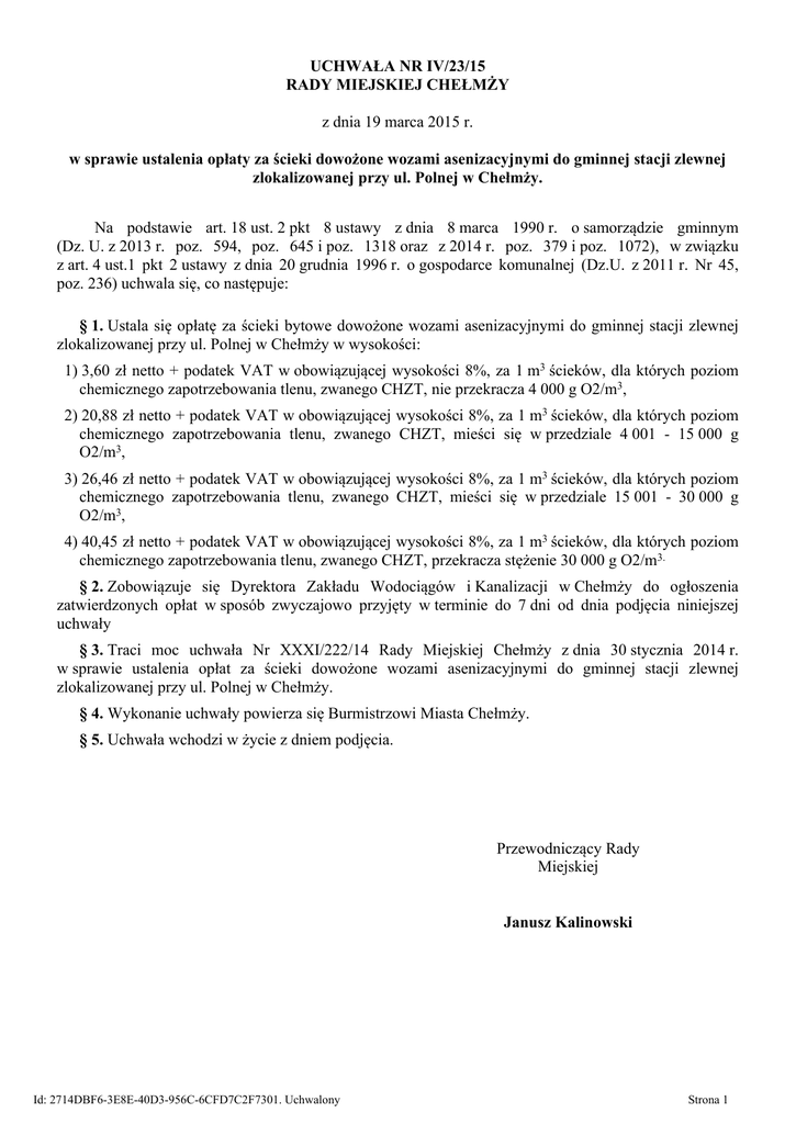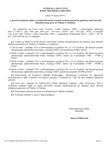 UCHWAŁA NR IV/23/15 RADY MIEJSKIEJ CHEŁMŻY z dnia 19 marca 2015 r. w sprawie ustalenia opłaty za ścieki dowożone wozami asenizacyjnymi do gminnej stacji zlewnej zlokalizowanej przy ul. Polnej w Chełmży. Na podstawie art. 18 ust. 2 pkt 8 ustawy z dnia 8 marca 1990 r. o samorządzie gminnym (Dz. U. z 2013 r. poz. 594, poz. 645 i poz. 1318 oraz z 2014 r. poz. 379 i poz. 1072), w związku z art. 4 ust.1 pkt 2 ustawy z dnia 20 grudnia 1996 r. o gospodarce komunalnej (Dz.U. z 2011 r. Nr 45, poz. 236) uchwala się, co następuje: § 1. Ustala się opłatę za ścieki bytowe dowożone wozami asenizacyjnymi do gminnej stacji zlewnej zlokalizowanej przy ul. Polnej w Chełmży w wysokości: 1) 3,60 zł netto + podatek VAT w obowiązującej wysokości 8%, za 1 m3 ścieków, dla których poziom chemicznego zapotrzebowania tlenu, zwanego CHZT, nie przekracza 4 000 g O2/m3, 2) 20,88 zł netto + podatek VAT w obowiązującej wysokości 8%, za 1 m3 ścieków, dla których poziom chemicznego zapotrzebowania tlenu, zwanego CHZT, mieści się w przedziale 4 001 - 15 000 g O2/m3, 3) 26,46 zł netto + podatek VAT w obowiązującej wysokości 8%, za 1 m3 ścieków, dla których poziom chemicznego zapotrzebowania tlenu, zwanego CHZT, mieści się w przedziale 15 001 - 30 000 g O2/m3, 4) 40,45 zł netto + podatek VAT w obowiązującej wysokości 8%, za 1 m3 ścieków, dla których poziom chemicznego zapotrzebowania tlenu, zwanego CHZT, przekracza stężenie 30 000 g O2/m3. § 2. Zobowiązuje się Dyrektora Zakładu Wodociągów i Kanalizacji w Chełmży do ogłoszenia zatwierdzonych opłat w sposób zwyczajowo przyjęty w terminie do 7 dni od dnia podjęcia niniejszej uchwały § 3. Traci moc uchwała Nr XXXI/222/14 Rady Miejskiej Chełmży z dnia 30 stycznia 2014 r. w sprawie ustalenia opłat za ścieki dowożone wozami asenizacyjnymi do gminnej stacji zlewnej zlokalizowanej przy ul. Polnej w Chełmży. § 4. Wykonanie uchwały powierza się Burmistrzowi Miasta Chełmży. § 5. Uchwała wchodzi w życie z dniem podjęcia. Przewodniczący Rady Miejskiej Janusz Kalinowski Id: 2714DBF6-3E8E-40D3-956C-6CFD7C2F7301. Uchwalony Strona 1 Uzasadnienie do uchwały nr IV/23/15 Rady Miejskiej Chełmży z dnia 19 marca 2015 r. w sprawie opłaty za ścieki dowożone wozami asenizacyjnymi do gminnej stacji zlewnej zlokalizowanej przy ul. Polnej w Chełmży. Stosownie do art. 18 ust. 2 pkt 8 ustawy z dnia 8 marca 1990r. o samorządzie gminnym (Dz. U. z 2013 r. poz. 594, poz. 645 i poz. 1318 oraz z 2014 r. poz. 379 i poz. 1072) oraz art.4 ust.1 pkt 2 ustawy z dnia 20 grudnia 1996r. o gospodarce komunalnej (Dz.U. z 2011 r., Nr 45, poz. 236), rada gminy jest organem kompetentnym do ustalenia opłat za usługi komunalne o charakterze użyteczności publicznej oraz za korzystanie z obiektów i urządzeń użyteczności publicznej jednostek samorządu terytorialnego. W związku z faktem, iż od dnia 1 lutego 2013r. wszystkie ścieki odbierane wozami asenizacyjnymi z terenu miasta Chełmży są dowożone do stacji zlewnej zlokalizowanej przy ul. Polnej w Chełmży, zaistniała konieczność ustalenie wysokości opłaty za przyjmowanie przedmiotowych ścieków. W dniu 30 stycznia 2014 r. została przyjęta uchwała, która ustaliła opłaty za ścieki dowożone wozami asenizacyjnymi do gminnej stacji zlewnej przy ul. Polnej w Chełmży na następującym poziomie: 1) 3,46 zł netto + podatek VAT w obowiązującej wysokości 8% tj. 3,74 zł brutto za 1 m 3 ścieków, dla których poziom chemicznego zapotrzebowania tlenu, zwanego CHZT, nie przekracza 4 000 g O2/m 3, 2) 20,88 zł netto + podatek VAT w obowiązującej wysokości 8% tj. 22,55 zł brutto za 1 m 3 ścieków, dla których poziom chemicznego zapotrzebowania tlenu, zwanego CHZT, mieści się w przedziale 4 001 - 15 000 g O2/m 3, 3) 26,46 zł netto + podatek VAT w obowiązującej wysokości 8% tj. 28,58 zł brutto za 1 m 3 ścieków, dla których poziom chemicznego zapotrzebowania tlenu, zwanego CHZT, mieści się w przedziale 15 001 - 30 000 g O2/m 3, 4) 40,45 zł netto + podatek VAT w obowiązującej wysokości 8% tj. 43,69 zł brutto za 1 m 3 ścieków, dla których poziom chemicznego zapotrzebowania tlenu, zwanego CHZT, przekracza stężenie 30 000 g O2/m 3. Kalkulacja wysokości ww. obecnie obowiązujących opłat została opracowana w grudniu 2013 r. Po kolejnym roku funkcjonowania stacji zlewnej została opracowana nowa kalkulacja uwaględniająca: faktyczne koszty funkcjonowania zlewni, konieczność zwiększenia ilości kontrolnych badań zanieczyszcenia ścieków, a także wzrost ceny ścieków odprowadzanych do oczyszczalni ścieków w Toruniu. Uwaględniając powyższe zapropnowane nowe opłaty przedstawiają się następująco: 1) 3,60 zł netto + podatek VAT w obowiązującej wysokości 8% tj. 3,89 zł brutto za 1 m 3 ścieków, dla których poziom chemicznego zapotrzebowania tlenu, zwanego CHZT, nie przekracza 4 000 g O2/m 3, 2) 20,88 zł netto + podatek VAT w obowiązującej wysokości 8% tj. 22,55 zł brutto za 1 m 3 ścieków, dla których poziom chemicznego zapotrzebowania tlenu, zwanego CHZT, mieści się w przedziale 4 001 - 15 000 g O2/m 3, 3) 26,46 zł netto + podatek VAT w obowiązującej wysokości 8% tj. 28,58 zł brutto za 1 m 3 ścieków, dla których poziom chemicznego zapotrzebowania tlenu, zwanego CHZT, mieści się w przedziale 15 001 - 30 000 g O2/m 3, 4) 40,45 zł netto + podatek VAT w obowiązującej wysokości 8% tj. 43,69 zł brutto za 1 m 3 ścieków, dla których poziom chemicznego zapotrzebowania tlenu, zwanego CHZT, przekracza stężenie 30 000 g O2/m 3. Wzrost opłat nastąpiłby jedynie w pierwszej pozycji o 0,15 zł brutto za 1 m 3 ścieków. Mając na uwadze powyższe, uznano wysokość opłaty za odbieranie ścieków w zaproponowanej wysokości za zasadne. Id: 2714DBF6-3E8E-40D3-956C-6CFD7C2F7301. Uchwalony Strona 1