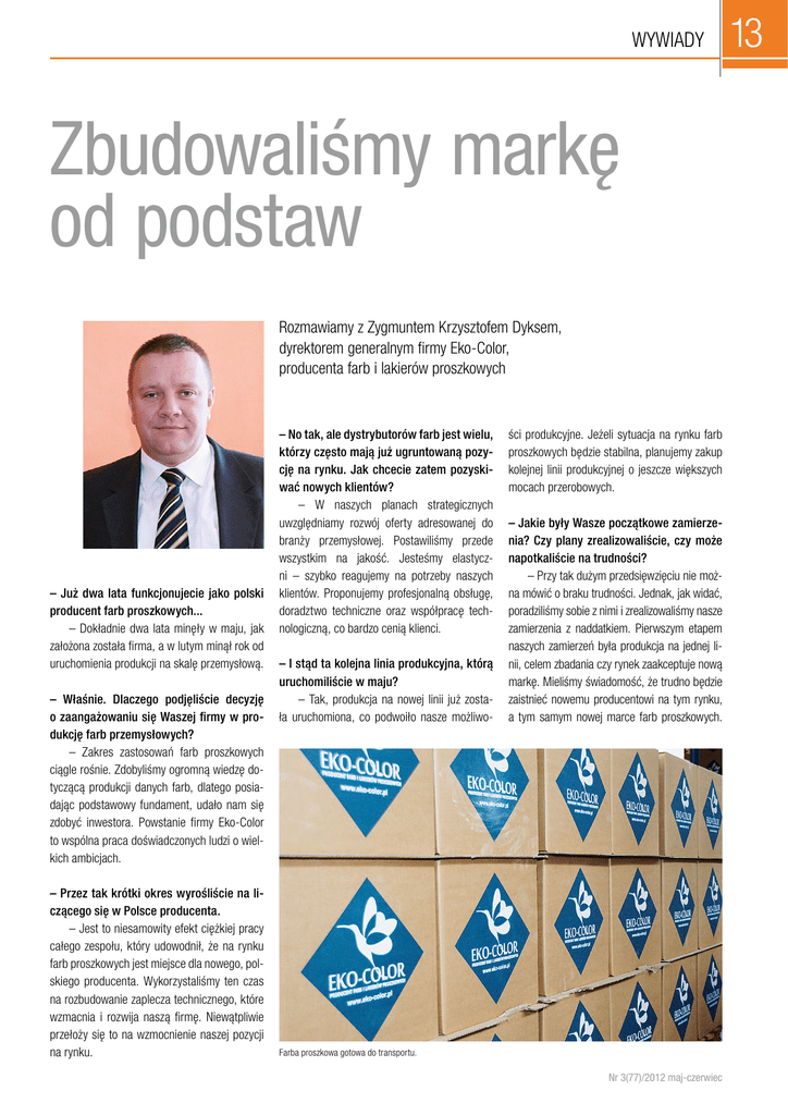 WYWIADY Zbudowaliśmy markę od podstaw Rozmawiamy z Zygmuntem Krzysztofem Dyksem, dyrektorem generalnym firmy Eko-Color, producenta farb i lakierów proszkowych – Już dwa lata funkcjonujecie jako polski producent farb proszkowych... – Dokładnie dwa lata minęły w maju, jak założona została firma, a w lutym minął rok od uruchomienia produkcji na skalę przemysłową. – Właśnie. Dlaczego podjęliście decyzję o zaangażowaniu się Waszej firmy w produkcję farb przemysłowych? – Zakres zastosowań farb proszkowych ciągle rośnie. Zdobyliśmy ogromną wiedzę dotyczącą produkcji danych farb, dlatego posiadając podstawowy fundament, udało nam się zdobyć inwestora. Powstanie firmy Eko-Color to wspólna praca doświadczonych ludzi o wielkich ambicjach. – Przez tak krótki okres wyrośliście na liczącego się w Polsce producenta. – Jest to niesamowity efekt ciężkiej pracy całego zespołu, który udowodnił, że na rynku farb proszkowych jest miejsce dla nowego, polskiego producenta. Wykorzystaliśmy ten czas na rozbudowanie zaplecza technicznego, które wzmacnia i rozwija naszą firmę. Niewątpliwie przełoży się to na wzmocnienie naszej pozycji na rynku. – No tak, ale dystrybutorów farb jest wielu, którzy często mają już ugruntowaną pozycję na rynku. Jak chcecie zatem pozyskiwać nowych klientów? – W naszych planach strategicznych uwzględniamy rozwój oferty adresowanej do branży przemysłowej. Postawiliśmy przede wszystkim na jakość. Jesteśmy elastyczni – szybko reagujemy na potrzeby naszych klientów. Proponujemy profesjonalną obsługę, doradztwo techniczne oraz współpracę technologiczną, co bardzo cenią klienci. – I stąd ta kolejna linia produkcyjna, którą uruchomiliście w maju? – Tak, produkcja na nowej linii już została uruchomiona, co podwoiło nasze możliwo- ści produkcyjne. Jeżeli sytuacja na rynku farb proszkowych będzie stabilna, planujemy zakup kolejnej linii produkcyjnej o jeszcze większych mocach przerobowych. – Jakie były Wasze początkowe zamierzenia? Czy plany zrealizowaliście, czy może napotkaliście na trudności? – Przy tak dużym przedsięwzięciu nie można mówić o braku trudności. Jednak, jak widać, poradziliśmy sobie z nimi i zrealizowaliśmy nasze zamierzenia z naddatkiem. Pierwszym etapem naszych zamierzeń była produkcja na jednej linii, celem zbadania czy rynek zaakceptuje nową markę. Mieliśmy świadomość, że trudno będzie zaistnieć nowemu producentowi na tym rynku, a tym samym nowej marce farb proszkowych. Farba proszkowa gotowa do transportu. Nr 3(77)/2012 maj-czerwiec 13 14 Wywiady Ryzyko się opłaciło. Pokazaliśmy się na rynku, przekonaliśmy klientów wysoką jakością naszych produktów. Stale rosnąca sprzedaż pokazuje, że nie tylko zbudowaliśmy firmę od podstaw, ale i zdobyliśmy część rynku. Oczywiście, nie zamierzamy na tym poprzestać. Skanowania wzornika barwy kolorymetrem. – Jaki jest Wasz profil jako producenta farb? Czy specjalizujecie się w produkcji dla pewnych grup odbiorców? – Nasza oferta skierowana jest do szerokiej grupy odbiorców. Obecnie specjalizujemy się w produkcji farb proszkowych dla przemysłu maszyn rolniczych, produkcji i renowacji butli gazowych, producentów szafek, regałów, znaków drogowych. Aktualnie skupiliśmy się na polskim rynku, ale w planach na kolejne lata ważne miejsce zajmuje dynamiczny rozwój sprzedaży na rynkach zagranicznych. – Kryzys Wam nie zaszkodził? – Bardziej bym powiedział, że kryzys wprowadził zamęt. Nie odczuliśmy pogorszenia sytuacji na rynku, ale dostrzegamy pewne zagrożenie w tak dynamicznie zmieniającej się sytuacji. Jesteśmy dobrej myśli, nie zamierzamy się zatrzymać, tylko iść do przodu. Żywica – jeden z komponentów farby proszkowej. Pokruszone plastry. www.lakiernictwo.net – Jakie obecnie obowiązują trendy na rynku farb proszkowych? Przez rok działalności na pewno zauważył Pan czego oczekują klienci? – W naszej branży trend jest dostosowany do potrzeb klientów. Rynek farb proszkowych dynamicznie się rozwija. Klienci coraz częściej sięgają po nowe kolory, połyski. Zauważa się tendencję do różnorodnych wykończeń i powłok. Dodatkowo często podejmujemy się wykonania farby proszkowej pod indywidualne zamówienie klienta. – Jakie macie plany na najbliższą przyszłość? – Dążąc do coraz pełniejszego zaspokajania oczekiwań klientów oraz zdobywania nowych segmentów rynku, duży nacisk kładziemy na prowadzone przez nas badania i rozwój nowych linii produktowych. Nawiązując do wcześniejszych wypowiedzi, przy zachowaniu obecnego wzrostu sprzedaży w naszych najbliższych planach jest uruchomienie trzeciej linii produkcyjnej. Cały czas szukamy skutecznych rozwiązań, które będą podnosiły efektywność naszej działalności. WYWIADY posażone laboratorium, w którym pomagamy im zrozumieć specyfikę produkcji farb proszkowych, a tym samym odpowiedzieć na ich pytania. Uplastyczniona masa. – Czyli nie tylko produkcja i sprzedaż, ale i pomoc technologiczna? – W dzisiejszych czasach sprzedaż to bardzo szerokie pojęcie. Klienci oprócz odpowiedniego produktu oczekują również wsparcia i pomocy w sprawach technologicznych. W miarę możliwości udostępniamy naszym klientom bogato wy- – W jaki sposób dbacie o jakość swoich produktów? – Tworząc firmę produkującą farby proszkowe, wiedzieliśmy, że do zapewnienia jakości ważny jest zakup odpowiedniego i nowoczesnego parku maszynowego-laboratoryjnego i produkcyjnego. Nasze wyroby kontrolujemy na każdym etapie produkcji z wykorzystaniem najnowocześniejszych urządzeń kontrolno-pomiarowych. Prowadzimy również stałą kontrolę i ocenę odporności naszych powłok proszkowych na korozję w komorze solnej. Nadzór Kontroli Jakości nad wyrobem końcowym prowadzony jest aż do chwili wysyłki farby z naszego magazynu. Kontrolę jakości prowadzimy w 