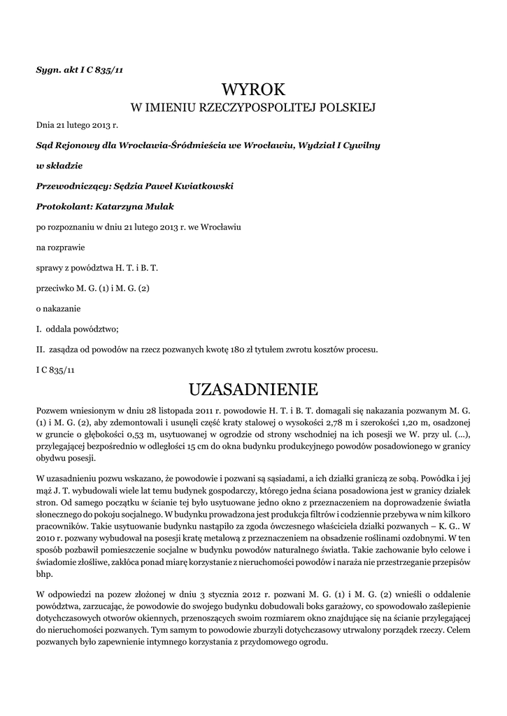 Sygn. akt I C 835/11 WYROK W IMIENIU RZECZYPOSPOLITEJ POLSKIEJ Dnia 21 lutego 2013 r. Sąd Rejonowy dla Wrocławia-Śródmieścia we Wrocławiu, Wydział I Cywilny w składzie Przewodniczący: Sędzia Paweł Kwiatkowski Protokolant: Katarzyna Mulak po rozpoznaniu w dniu 21 lutego 2013 r. we Wrocławiu na rozprawie sprawy z powództwa H. T. i B. T. przeciwko M. G. (1) i M. G. (2) o nakazanie I. oddala powództwo; II. zasądza od powodów na rzecz pozwanych kwotę 180 zł tytułem zwrotu kosztów procesu. I C 835/11 UZASADNIENIE Pozwem wniesionym w dniu 28 listopada 2011 r. powodowie H. T. i B. T. domagali się nakazania pozwanym M. G. (1) i M. G. (2), aby zdemontowali i usunęli część kraty stalowej o wysokości 2,78 m i szerokości 1,20 m, osadzonej w gruncie o głębokości 0,53 m, usytuowanej w ogrodzie od strony wschodniej na ich posesji we W. przy ul. (...), przylegającej bezpośrednio w odległości 15 cm do okna budynku produkcyjnego powodów posadowionego w granicy obydwu posesji. W uzasadnieniu pozwu wskazano, że powodowie i pozwani są sąsiadami, a ich działki graniczą ze sobą. Powódka i jej mąż J. T. wybudowali wiele lat temu budynek gospodarczy, którego jedna ściana posadowiona jest w granicy działek stron. Od samego początku w ścianie tej było usytuowane jedno okno z przeznaczeniem na doprowadzenie światła słonecznego do pokoju socjalnego. W budynku prowadzona jest produkcja filtrów i codziennie przebywa w nim kilkoro pracowników. Takie usytuowanie budynku nastąpiło za zgoda ówczesnego właściciela działki pozwanych – K. G.. W 2010 r. pozwany wybudował na posesji kratę metalową z przeznaczeniem na obsadzenie roślinami ozdobnymi. W ten sposób pozbawił pomieszczenie socjalne w budynku powodów naturalnego światła. Takie zachowanie było celowe i świadomie złośliwe, zakłóca ponad miarę korzystanie z nieruchomości powodów i naraża nie przestrzeganie przepisów bhp. W odpowiedzi na pozew złożonej w dniu 3 stycznia 2012 r. pozwani M. G. (1) i M. G. (2) wnieśli o oddalenie powództwa, zarzucając, że powodowie do swojego budynku dobudowali boks garażowy, co spowodowało zaślepienie dotychczasowych otworów okiennych, przenoszących swoim rozmiarem okno znajdujące się na ścianie przylegającej do nieruchomości pozwanych. Tym samym to powodowie zburzyli dotychczasowy utrwalony porządek rzeczy. Celem pozwanych było zapewnienie intymnego korzystania z przydomowego ogrodu. Ponadto pozwani zarzucili, że kwestia legalności umieszczenia obecnie zasłoniętego otworu okiennego będzie badana w postępowaniu administracyjnym. Sąd ustalił następujący stan faktyczny. Na granicy nieruchomości należących do powodów H. T. i B. T. i pozwanych M. G. (1) i M. G. (2), na nieruchomości powodów znajduje się budynek gospodarczy, w którym powodowie prowadzą działalność gospodarczą. Budynek powstał na przełomie lat 60.i 70. (dowód: akta postępowania administracyjnego (...) w załączeniu do akt głównych) Na ścianie przylegającej do nieruchomości pozwanych znajdował się otwór okienny. (bezsporne) Wskazany otwór okienny powstał po 1995 r. (dowód: akta postępowania administracyjnego (...) w załączeniu do akt głównych) W budynku znajdowały się także inne otwory okienne, zlikwidowane na skutek jego rozbudowy. (dowód: fakt uznany za przyznany na podstawie art. 230 kpc) W 2010 r. pozwani postawili na swojej nieruchomości, w odległości 0,15 m od nieruchomości powodów kratę stalową o wysokości 2,78 m i szerokości 1,20 m, osadzoną w gruncie o głębokości 0,53 m i obsadzili ją następnie kwiatami ozdobnymi. W ten sposób zasłonili od swojej strony widok na budynek gospodarczy powodów i zasłonili dostęp światła do otworu okiennego w ścianie tego budynku. (dowód: akta postępowania administracyjnego (...) w załączeniu do akt głównych, zdjęcia nieruchomości – k. 41) Ostateczną decyzją z 19 listopada 2012 r. Powiatowy Inspektor Nadzoru Budowlanego dla miasta W. nakazał powodom demontaż istniejącej stolarki okiennej i zamurowanie otworu okiennego wykonanego w obrębie pomieszczenia socjalnego w ścianie budynku posadowionego na granicy działek stron. W uzasadnieniu decyzji wskazano, że dopuszczone będzie trwałe wypełnienie przedmiotowego otworu okiennego ścianą z luksferów lub cegły szklanej. (bezsporne – por. decyzja – k. 57-59) Mając powyższe na uwadze, Sąd zważył, co następuje. Powództwo nie zasługiwało na uwzględnienie. Zgodnie z art. 144 kc właściciel nieruchomości powinien przy wykonywaniu swojego prawa powstrzymać się od działań, które by zakłócały korzystanie z nieruchomości ponad przeciętną miarę, wynikającą ze społecznogospodarczego przeznaczenia nieruchomości i stosunków miejscowych. W rozpoznawanej sprawie konieczna była zatem ocena, czy pozwani zakłócili powodom korzystanie z ich nieruchomości w sposób niedozwolony. Nie ulegało wątpliwości, że sposób używania nieruchomości bezpośrednio przy granicy z nieruchomością sąsiednią musi uwzględniać istniejący wcześniej sposób korzystania z nieruchomości sąsiedniej, jeżeli był on pomiędzy sąsiadami uzgodniony. W realiach rozpoznawanej sprawy okazało się, że o ile umiejscowienie budynku powodów przy granicy działek było uzgodnione, to nie było przekonujących dowodów, że elementem trwałego, zaakceptowanego stanu było również okno w ścianie przylegającej do nieruchomości pozwanych. W postępowaniu administracyjnym stwierdzono jednoznacznie, że wykonanie otworu okiennego było nielegalne. Wypada także zauważyć, że pozwani podnieśli zarzut, iż budynek powodów posiadał inne jeszcze otwory okienne, które zniknęły po dobudowaniu boksu garażowego. Powodowie nie próbowali nawet odnieść się do tego zarzutu. Pełnomocnicy stron zrezygnowali zaś z przesłuchania swoich mocodawców. Prowadzi to do wniosku, że powodowie mieli inne możliwości