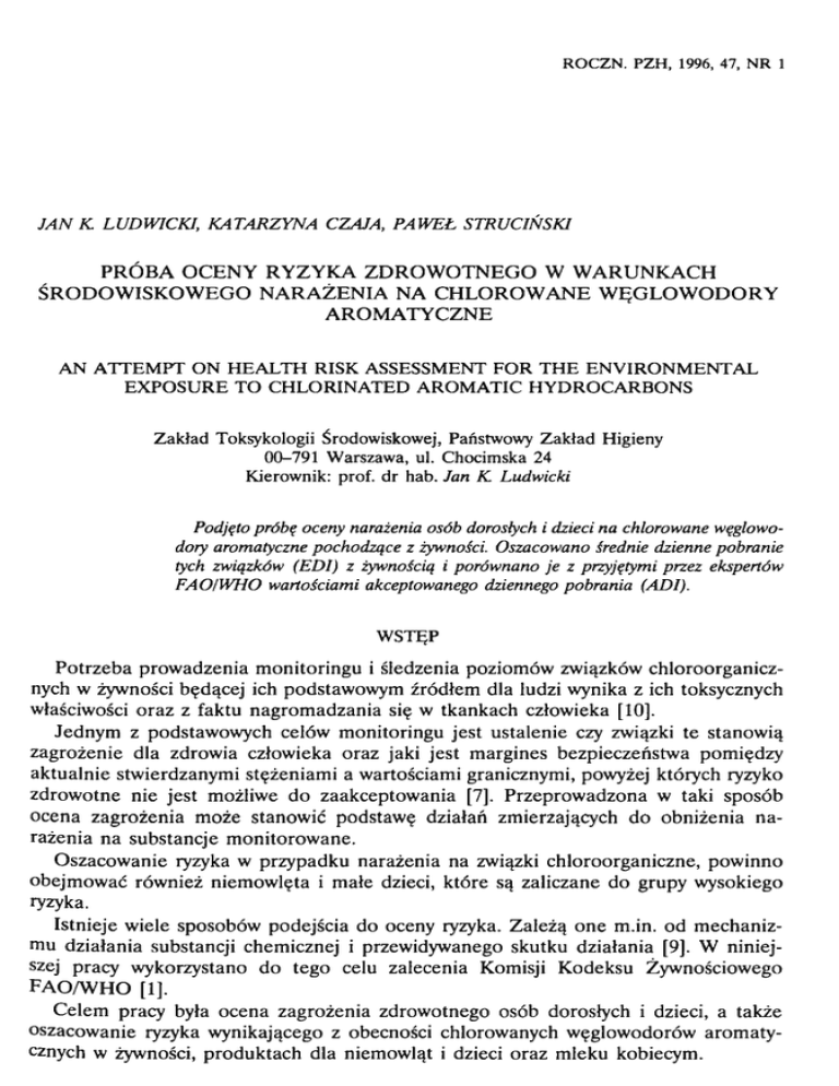 ROCZN. PZH, 1996, 47, NR 1 J A N К LUDW1CKI, K A TA RZYN A CZAJA, PAW EŁ STRUCIŃSKI PRÓBA O CENY RYZYKA ZD RO W O TN EG O W W ARUNKACH Ś R O D O W IS K O W E G O N A R A Ż E N IA N A C H L O R O W A N E W Ę G L O W O D O R Y AROM ATYCZNE A N A TTEM PT ON H EA LTH RISK ASSESSMENT FO R T H E EN V IRO N M EN TA L E X PO SU R E TO C H LO RIN A TED A RO M A TIC HY DROCA RBO N S Zakład Toksykologii Środowiskowej, Państwowy Zakład Higieny 00-791 Warszawa, ul. Chocimska 24 Kierownik: prof. dr hab. Jan К Ludwicki Podjęto próbę oceny narażenia osób dorosłych i dzieci na chlorowane węglowo dory aromatyczne pochodzące z żywności. Oszacowano średnie dzienne pobranie tych związków (EDI) z żywnością i porównano je z przyjętymi przez ekspertów FAOIWHO wartościami akceptowanego dziennego pobrania (ADI). WSTĘP P otrzeba prow adzenia m onitoringu i śledzenia poziom ów związków chloroorganicz nych w żywności będącej ich podstawowym źródłem dla ludzi wynika z ich toksycznych właściwości o raz z faktu nagrom adzania się w tkankach człowieka [10]. Jednym z podstawowych celów m onitoringu jest ustalenie czy związki te stanow ią zagrożenie dla zdrowia człowieka oraz jaki jest m argines bezpieczeństw a pom iędzy aktualnie stw ierdzanym i stężeniam i a wartościam i granicznymi, powyżej których ryzyko zdrow otne nie jest możliwe do zaakceptow ania [7]. Przeprow adzona w taki sposób ocena zagrożenia m oże stanow ić podstaw ę działań zm ierzających do obniżenia n a rażenia na substancje m onitorow ane. O sza co w a n ie ryzyka w p rzy p a d k u n a ra ż e n ia na zw iązki c h lo ro o rg an icz n e, p o w in n o o b ejm o w ać ró w n ież n ie m o w lęta i m ałe dzieci, k tó re są za liczan e d o g ru p y w ysokiego ryzyka. Istnieje wiele sposobów podejścia do oceny ryzyka. Zależą one m.in. od m echaniz mu działania substancji chem icznej i przewidywanego skutku działania [9]. W niniej szej pracy wykorzystano do tego celu zalecenia Komisji K odeksu Żywnościowego F A O /W H O [1]. Celem pracy była ocena zagrożenia zdrow otnego osób dorosłych i dzieci, a także oszacow anie ryzyka wynikającego z obecności chlorowanych w ęglowodorów arom aty cznych w żywności, produktach dla niem ow ląt i dzieci oraz m leku kobiecym. 34 J.K. Ludwicki i in. Nr 1 Nr 1 Ocena ryzyka narażania na chlorowane węglowodory aromatyczne Pozostałości 35 chlorowanych węglowodorów aromatycznych D o oceny ryzyka w w arunkach środowiskowego narażenia człowieka na D D T , H C H , H C B i PCB obecne w jego diecie posłużyły dane dotyczące pozostałości tych związków w środkach spożywczych, p roduktach dla niem ow ląt i dzieci oraz m leku kobiecym uzyskane w ram ach m onitoringu środowiskowego i biologicznego [6, 8]. D ane dotyczące pozostałości związków chloroorganicznych w rybach pochodziły z piśm iennictw a [3, 4]. Poniew aż zarów no D D T jak i D D E m ogą uczestniczyć w procesie kancerogenezy [5], dla oceny ryzyka uznano za celowe obliczanie łącznego pobrania D D T i jego m etabolitów (D D E i D D D ). Rów nież ze względu na zbliżone właściwości toksyczne izom erów H C H uznano za uzasadnione dokonanie łącznej analizy zagrożenia w odni esieniu do sumy tych izomerów. WYNIKI I ICH OMÓWIENIE Osoby dorosłe O ceny narażen ia osób dorosłych na chlorow ane węglowodory arom atyczne dok o n a no obliczając średnie dzienne p obranie tych związków z żywnością. W yniki odzw ier ciedlające oszacow ane dzienne p obranie przez człowieka przedstaw iono w tabeli I. Tabela I. Średnie dzienne pobranie DDT, HCH, HCB i PCB z poszczególnych grup produktów spożywczych (mg/człowieka) Average daily intake of DDT, HCH, HCB and PCBs from different food groups (mg/person) W następnym etapie porów nano wartości T eoretycznego Najwyższego D ziennego Pobrania (T M D I) z w artościam i Oszacowanego D ziennego Pobrania (E D I) wyrażonego w mg/kg m.c., co umożliwiło określenie różnicy między aktualnym p o b ra niem danego związku a najwyższym dopuszczalnym przez przepisy. W yniki tego porów nania przedstaw iono w tabeli II. Ocena zagrożenia O ceny zagrożenia dokonyw ano porów nując oszacowane dzienne pobranie (E D I) z w artościam i przyjętym i za bezpieczne, traktow anym i jako w artości odniesienia. J.K. Ludwicki i in. 36 Tabela II. Nr 1 Wartości TMDI i EDI dla chlorowanych węglowodorów aromatycznych (mg/kg m.c. /dzień). TMDI i EDI values for chlorinated aromatic hydrocarbons (mg/kg b. w. daily). W przypadku zanieczyszczeń występujących w żywności należy liczyć się z ciągłym narażeniem na niewielkie dawki przez większą część życia. Z tego względu przyjęto odpow iednie w artości A D I, jako akceptow ane najwyższe pobranie danej substancji, służące w niniejszych badaniach jako podstaw a przy ocenie ryzyka. W tabeli III przedstaw iono wartości odniesienia dla badanych związków ch loroor ganicznych oraz w artości T M D I i E D I wyrażając je jako odsetek A D I. Tabela I I I . TMDI i EDI wyrażone jako odsetek ADI TMDI and EDI expressed as percentage of ADI Wartość przyjęta za US FDA [13]. Z powyższego zestaw ienia wartości A D I, T M D I i E D I wynika, że teoretyczne pobranie chlorow anych węglowodorów aromatycznych (D D T , H C H , H C B i PCB), obliczone na podstaw ie tzw. „najgorszego przypadku” nie przekracza A D I, stanow iąc zawsze ułam ek tej wartości. O znacza to, że najwyższe dopuszczalne pozostałości tych związków w produktach spożywczych, przyjęte w krajowym ustawodawstwie [12] zostały opracow ane z uw zględnieniem odpow iednich m arginesów bezpieczeństw a. Oszacow ane rzeczywiste dzienne pobranie (E D I) chlorowanych węglow odorów a ro matycznych jest jeszcze m niejsze i z wyjątkiem PCB (38% ), nie przekracza 5% A D I (tabela III). N a podstaw ie powyższej analizy m ożna ocenić, że zagrożenie konsum entów w Polsce ze stron