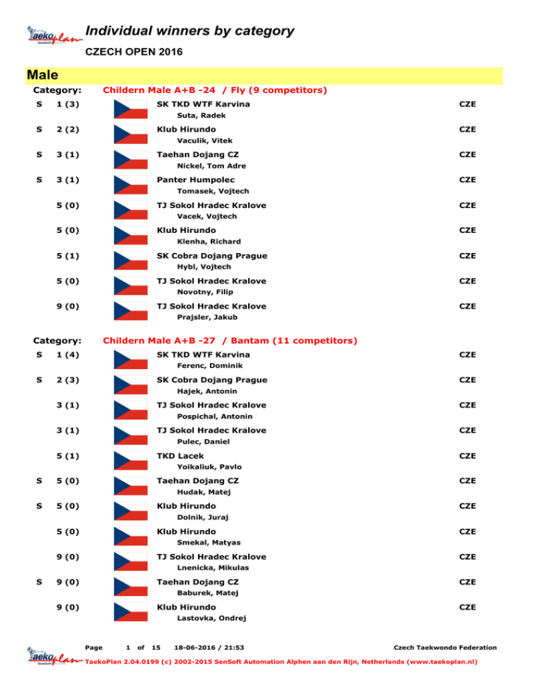 Individual winners by category CZECH OPEN 2016 Male Category: S Childern Male A+B -24 / Fly (9 competitors) 1 (3) SK TKD WTF Karvina CZE Suta, Radek S 2 (2) Klub Hirundo CZE Vaculik, Vitek S 3 (1) Taehan Dojang CZ CZE Nickel, Tom Adre S 3 (1) Panter Humpolec CZE Tomasek, Vojtech 5 (0) TJ Sokol Hradec Kralove CZE Vacek, Vojtech 5 (0) Klub Hirundo CZE Klenha, Richard 5 (1) SK Cobra Dojang Prague CZE Hybl, Vojtech 5 (0) TJ Sokol Hradec Kralove CZE Novotny, Filip 9 (0) TJ Sokol Hradec Kralove CZE Prajsler, Jakub Category: S Childern Male A+B -27 / Bantam (11 competitors) 1 (4) SK TKD WTF Karvina CZE Ferenc, Dominik S 2 (3) SK Cobra Dojang Prague CZE Hajek, Antonin 3 (1) TJ Sokol Hradec Kralove CZE Pospichal, Antonin 3 (1) TJ Sokol Hradec Kralove CZE Pulec, Daniel 5 (1) TKD Lacek CZE Yoikaliuk, Pavlo S 5 (0) Taehan Dojang CZ CZE Hudak, Matej S 5 (0) Klub Hirundo CZE Dolnik, Juraj 5 (0) Klub Hirundo CZE Smekal, Matyas 9 (0) TJ Sokol Hradec Kralove CZE Lnenicka, Mikulas S 9 (0) Taehan Dojang CZ CZE Baburek, Matej 9 (0) Klub Hirundo CZE Lastovka, Ondrej Page 1 of 15 18-06-2016 / 21:53 Czech Taekwondo Federation TaekoPlan 2.04.0199 (c) 2002-2015 SenSoft Automation Alphen aan den Rijn, Netherlands (www.taekoplan.nl) Individual winners by category CZECH OPEN 2016 Male Category: S Childern Male A+B -30 / Feather (5 competitors) 1 (3) SK Cobra Dojang Prague CZE Tiefa, Krystof 2 (1) TKD Lacek CZE Kačur, Josef 3 (0) TKD Lacek CZE Smejkal, Daniel 3 (0) TKD Lacek CZE Simsa, Matos 5 (0) Taejang Dojang CZE Barsa, Ondrej Category: S Childern Male A+B -33 / Light (3 competitors) 1 (1) Taejang Dojang CZE Broz, Matej S 2 (1) TKD Gepard CZE Cap, Bernard 3 (0) Klub Hirundo CZE Zdimera, David Category: S Childern Male A+B -36 / Welter (5 competitors) 1 (3) TKD Lacek CZE Pohan, Michal S 2 (1) Taekwondo WTF Klub Praha CZE Uzsak, Martin 3 (0) TKD Lacek CZE Musel, David 3 (0) TKD Lacek CZE Hunal, Martin 5 (0) SK Cobra Dojang Prague CZE Zrzavy, Jakub Category: S Childern Male A+B +40 / Middle (2 competitors) 1 (1) SK Cobra Dojang Prague CZE Mensik, Marek 2 (0) SK Cobra Dojang Prague CZE Cuda, Vojtech Page 2 of 15 18-06-2016 / 21:53 Czech Taekwondo Federation TaekoPlan 2.04.0199 (c) 2002-2015 SenSoft Automation Alphen aan den Rijn, Netherlands (www.taekoplan.nl) Individual winners by category CZECH OPEN 2016 Male Category: S Pupils Male A+B -30 / Fly (6 competitors) 1 (3) Panter Humpolec CZE Tomasek, Adam S 2 (1) TKD Gepard CZE Bartos, David 3 (0) Taejang Dojang CZE Paruzek, Krystof 3 (1) SK Cobra Dojang Prague CZE Midyanka, Viktor 5 (0) Klub Hirundo CZE Rydvan, Tobias S 5 (0) Ilyo - Taekwondo Trenčín SVK Nevlacil, Erik Category: S Pupils Male A+B -33 / Bantam (2 competitors) 1 (1) Ilyo - Taekwondo Trenčín SVK Ferletjak, Damian S 2 (0) Taejang Dojang CZE Cermak, Pavel Category: S Pupils Male A+B -36 / Feather (5 competitors) 1 (2) SK Cobra Dojang Prague CZE Kotek, Vojtech 2 (1) TKD Lacek CZE Jelinek, Tomas 3 (0) TKD Lacek CZE Neshyba, Tomas S 3 (1) Klub Hirundo CZE Leisky, Leander S 5 (0) TKD Kelti Beroun CZE Rada, Oliver Category: S Pupils Male A+B -40 / Light (5 competitors) 1 (2) TJ Sokol Hradec Kralove CZE Jochman, Adam S 2 (1) Panter Humpolec CZE Prokop, Dominik 3 (1) SK Cobra Dojang Prague CZE Ludwig, Albert 3 (0) SK Cobra Dojang Prague CZE Marsik, Tomas 5 (0) TKD Lacek CZE Brychca, Stepan Page 3 of 15 18-06-2016 / 21:53 Czech Taekwondo Federation TaekoPlan 2.04.0199 (c) 2002-2015 SenSoft Automation Alphen aan den Rijn, Netherlands (www.taekoplan.nl) Individual winners by category CZECH OPEN 2016 Male Category: Pupils Male A+B -45 / Welter (2 competitors) 1 (1) TKD Lacek CZE Janik, Ondra S 2 (0) TJ Sokol Hradec Kralove CZE Brandt, Maron Category: S Pupils Male A+B +50 / Middle (2 competitors) 1 (1) Klub Hirundo CZE Masa, Martin 2 (0) TKD Lacek CZE Madlo, Patrik Category: S Cadets Male A+B -33 / Fin (3 competitors) 1 (2) TJ Sokol Hradec Kralove CZE Stohwasser, Tadeas S 2 (0) Klub Hirundo CZE Vesely, Vaclav 3 (0) SK Cobra Dojang Prague CZE Lehovec, Tomas Category: S Cadets Male A+B -37 / Fly (4 competitors) 1 (2) Kangsim Dojang CZE Vlaciha, Denis S 2 (1) Klub Hirundo CZE Kvasnicka, Jakub 3 (0) TJ Sokol Hradec Kralove CZE Caslavsky, Daniel 3 (0) TJ Sokol Hradec Kralove CZE Danihel, Jan Page 4 of 15 18-06-2016 / 21:53 Czech Taekwondo Federation TaekoPlan 2.04.0199 (c) 2002-2015 SenSoft Automation Alphen aan den Rijn, Netherlands (www.taekoplan.nl) Individual winners by category CZECH OPEN 2016 Male Category: S Cadets Male A+B -41 / Bantam (7 competitors) 1 (3) Kangsim Dojang CZE Nepras, Stepan S 2 (2) TJ Sokol Hradec Kralove CZE Fibiger, Patrik 3 (0) TJ Sokol Hradec Kralove CZE Stoklasek, Roman 3 (1) Taejang Dojang CZE Polak, Michal 5 (0) TJ Sokol Hradec Kralove CZE Baliar, Marian S 5 (0) Koryo TKD Slavia Upjs Kosice SVK Horvath, Matej S 5 (0) TKD Gepard CZE Kotnauer, Tomas Category: S Cadets Male A+B -45 / Feather (8 competitors) 1 (3) TKD Lacek CZE Kaman, Matej 2 (2) TKD Lacek CZE Stastny, Jiri 3 (1) Taejang Dojang CZE Broz, Krystof S 3 (1) Koryo TKD Slavia Upjs Kosice SVK Briskar, Richard 5 (0) TJ Sokol Hradec Kralove CZE Cabalka, Oliver 5 (0) Kangsim Dojang CZE Vesely, Jiri 5 (0) Klub Hirundo CZE Vacovsky, Tomas 5 (0) Klub Hirundo CZE Lastovka, David Page 5 of 15 18-06-2016 / 21:53 Czech Taekwondo Federation TaekoPlan 2.04.0199 (c) 2002-2015 SenSoft Automation Alphen aan den Rijn, Netherlands (www.taekoplan.nl) Individual winners by category CZECH OPEN 2016 Male Category: S Cadets Male A+B -49 / Light (10 competitors) 1 (4) TKD Lacek CZE Vanhasselle, David S 2 (2) TKD Gepard CZE Bodlak, Pavel S 3 (2) TJ Sokol Hradec Kralove CZE Kloucek, David S 3 (1) TKD Gepard CZE Fiala, Daniel 5 (0) TKD Lacek CZE Kuanishbek, Abdarrakhim 5 (0) Kangsim Dojang CZE Pilny, Jan 5 (0) Kangsim Dojang CZE Skotnica, Josef S 5 (0) Taekwondo WTF Klub Praha CZE Gega, Gabriel 9 (0) Taejang Dojang CZE Sajner, Filip 9 (0) SK Cobra Dojang Prague CZE Sittek, Tomas Category: S Cadets Male A+B -65 / Light Heavy (3 competitors) 1 (2) SK Cobra 