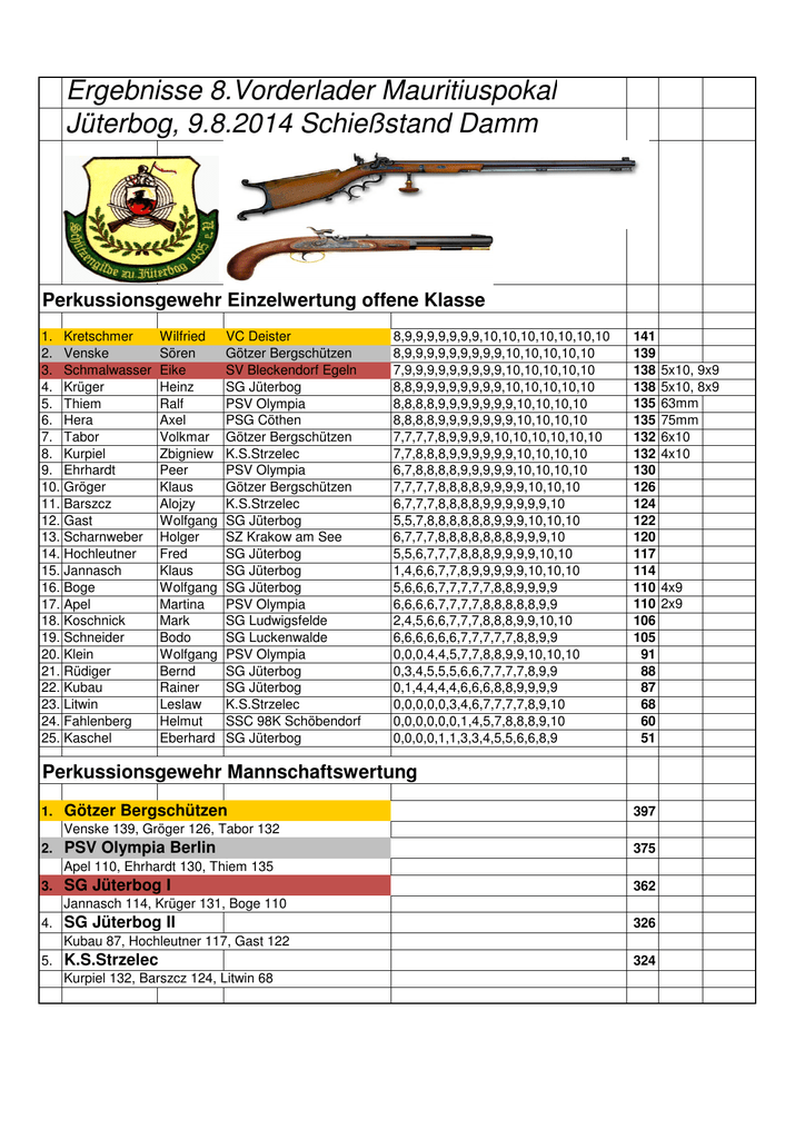 Ergebnisse 8.Vorderlader Mauritiuspokal Jüterbog, 9.8.2014 Schießstand Damm Perkussionsgewehr Einzelwertung offene Klasse 1. Kretschmer 2. Venske 3. Schmalwasser 4. Krüger 5. Thiem 6. Hera 7. Tabor 8. Kurpiel 9. Ehrhardt 10. Gröger 11. Barszcz 12. Gast 13. Scharnweber 14. Hochleutner 15. Jannasch 16. Boge 17. Apel 18. Koschnick 19. Schneider 20. Klein 21. Rüdiger 22. Kubau 23. Litwin 24. Fahlenberg 25. Kaschel Wilfried Sören Eike Heinz Ralf Axel Volkmar Zbigniew Peer Klaus Alojzy Wolfgang Holger Fred Klaus Wolfgang Martina Mark Bodo Wolfgang Bernd Rainer Leslaw Helmut Eberhard VC Deister Götzer Bergschützen SV Bleckendorf Egeln SG Jüterbog PSV Olympia PSG Cöthen Götzer Bergschützen K.S.Strzelec PSV Olympia Götzer Bergschützen K.S.Strzelec SG Jüterbog SZ Krakow am See SG Jüterbog SG Jüterbog SG Jüterbog PSV Olympia SG Ludwigsfelde SG Luckenwalde PSV Olympia SG Jüterbog SG Jüterbog K.S.Strzelec SSC 98K Schöbendorf SG Jüterbog 8,9,9,9,9,9,9,9,10,10,10,10,10,10,10 8,9,9,9,9,9,9,9,9,9,10,10,10,10,10 7,9,9,9,9,9,9,9,9,9,10,10,10,10,10 8,8,9,9,9,9,9,9,9,9,10,10,10,10,10 8,8,8,8,9,9,9,9,9,9,9,10,10,10,10 8,8,8,8,9,9,9,9,9,9,9,10,10,10,10 7,7,7,7,8,9,9,9,9,10,10,10,10,10,10 7,7,8,8,8,9,9,9,9,9,9,10,10,10,10 6,7,8,8,8,8,9,9,9,9,9,10,10,10,10 7,7,7,7,8,8,8,8,9,9,9,9,10,10,10 6,7,7,7,8,8,8,8,9,9,9,9,9,9,10 5,5,7,8,8,8,8,8,8,9,9,9,10,10,10 6,7,7,7,8,8,8,8,8,8,8,9,9,9,10 5,5,6,7,7,7,8,8,8,9,9,9,9,10,10 1,4,6,6,7,7,8,9,9,9,9,9,10,10,10 5,6,6,6,7,7,7,7,7,8,8,9,9,9,9 6,6,6,6,7,7,7,7,8,8,8,8,8,9,9 2,4,5,6,6,7,7,7,8,8,8,9,9,10,10 6,6,6,6,6,6,7,7,7,7,7,8,8,9,9 0,0,0,4,4,5,7,7,8,8,9,9,10,10,10 0,3,4,5,5,5,6,6,7,7,7,7,8,9,9 0,1,4,4,4,4,6,6,6,8,8,9,9,9,9 0,0,0,0,0,3,4,6,7,7,7,7,8,9,10 0,0,0,0,0,0,1,4,5,7,8,8,8,9,10 0,0,0,0,1,1,3,3,4,5,5,6,6,8,9 141 139 138 138 135 135 132 132 130 126 124 122 120 117 114 110 110 106 105 91 88 87 68 60 51 Perkussionsgewehr Mannschaftswertung 1. Götzer Bergschützen 397 Venske 139, Gröger 126, Tabor 132 2. PSV Olympia Berlin 375 Apel 110, Ehrhardt 130, Thiem 135 3. SG Jüterbog I 362 Jannasch 114, Krüger 131, Boge 110 4. SG Jüterbog II 326 Kubau 87, Hochleutner 117, Gast 122 5. K.S.Strzelec Kurpiel 132, Barszcz 124, Litwin 68 324 5x10, 9x9 5x10, 8x9 63mm 75mm 6x10 4x10 4x9 2x9 Perkussionspistole Einzelwertung offene Klasse 1. Kretschmer 2. Fröse 3. Erb 4. Konegen 5. Zielke 6. Valentin 7. Kurpiel 8. Schlösinger 9. Cal 10. Holz 11. Hahmeyer 12. Tabor 13. Hellwig 14. Nitsch 15. Nitsch 16. Müller 17. Venske 18. Goralczyk 19. Dalz 20. Scharnweber 21. Rinderle 22. Schneider 23. Luka 24. Rüdiger 25. Koschnick 26. John 27. Glapa 28. Barela 29. Kronenberger 30. Hahmeyer 31. Jannasch 32. Stumpf 33. Eyink 34. Litwin 35. Kaschel Wilfried Uwe Martin Thomas Christian Volker Zbigniew Bodo Damian Andreas Charlie Volkmar Sabine T.-Arlett Wolfgang Herbert Sören Heinrich Daniel Holger Peter Bodo Norbert Bernd Mark Steffen Hans-Luz Sebastian Udo Slavica Klaus Erhard Jens Leslaw Eberhard VC Deister SV Lichtenrade PSV Olympia PSV Olympia SG Frankfurt/Oder SG Frankfurt/Oder K.S. Strzelec SG Frankfurt/Oder K.S. Strzelec SG Frankfurt/Oder Lützowsche Jäger Götzer Bergschützen PSV Olympia SV Wendlingen SSV Bötzow SG Jüterbog Götzer Bergschützen SV Lichenrade Lützowsche Jäger SZ Krakow am See SG Jüterbog SG Luckenwalde Lützowsche Jäger SG Jüterbog SG Ludwigsfelde SG Ludwigsfelde SV Lichenrade K.S. Strzelec Götzer Bergschützen Lützowsche Jäger SG Jüterbog Schweriner See Schützen Schweriner See Schützen K.S. Strzelec SG Jüterbog 8,8,9,9,9,9,9,10,10,10,10,10,10,10,10 7,8,8,9,9,9,9,9,9,9,10,10,10,10,10 8,8,8,8,9,9,9,9,9,9,10,10,10,10,10 5,8,8,9,9,9,9,9,9,10,10,10,10,10,10 7,7,8,9,9,9,9,9,9,9,10,10,10,10,10 8,8,8,8,8,9,9,9,9,9,10,10,10,10,10 6,7,8,8,8,8,9,9,9,9,9,10,10,10,10 7,8,8,8,8,8,9,9,9,9,9,9,9,9,10 6,7,7,8,8,9,9,9,9,9,9,9,9,10,10 6,7,7,8,8,8,8,8,9,9,9,10,10,10,10 5,5,8,8,8,8,9,9,9,9,9,9,10,10,10 4,7,7,8,8,8,9,9,9,9,9,9,10,10,10 7,7,8,8,8,8,8,8,8,8,9,9,10,10,10 6,7,7,7,8,8,8,8,9,9,9,9,10,10,10 6,7,7,8,8,8,8,8,9,9,9,9,9,9,10 6,7,8,8,8,8,8,8,8,9,9,9,9,9,10 6,7,7,7,8,8,8,8,8,8,8,9,9,9,9 6,6,6,6,7,7,7,7,8,8,9,9,10,10,10 4,5,6,6,7,7,8,8,8,8,8,9,9,9,10 5,5,6,6,7,7,7,8,8,8,9,9,9,9,9 3,5,5,6,6,6,7,8,8,9,9,9,10,10,10 2,4,5,6,7,7,8,8,8,9,9,9,9,10,10 3,5,6,6,7,7,7,7,8,8,8,8,9,9,10 4,5,5,6,6,7,7,7,8,8,8,8,8,10,10 0,1,4,6,7,8,8,8,8,9,9,9,9,9,10 2,4,5,5,6,6,7,7,7,8,8,9,9,9,10 2,5,5,5,6,6,6,6,7,7,8,9,9,10,10 2,5,5,5,6,7,7,7,7,8,8,8,8,9,9 1,4,4,4,6,6,7,7,8,8,8,8,8,9,10 0,4,5,5,6,6,6,7,8,8,8,8,8,9,9 2,4,4,4,5,5,7,7,7,8,8,8,9,9,9 4,4,4,5,5,6,6,6,7,7,8,8,8,8,8 0,0,3,4,5,6,6,6,7,7,7,7,8,9,9 0,0,0,0,0,1,2,3,4,4,4,5,6,7,10 0,0,0,0,0,0,0,0,0,0,3,4,5,6,10 141 136 136 135 135 135 130 129 128 127 126 126 126 125 124 124 119 116 112 112 111 111 108 107 105 102 101 101 98 97 96 94 84 46 28 5x10, 7x9, 5x10, 6x9, 6x10 5x10, 7x9 5x10, 5x9 3x10, 6x9, 4x8 3x10, 6x9, 3x8 3x10, 2x9 1x10, 6x9 1x10, 5x9 1x10 3x10 2x10 2x10 Perkussionspistole Mannschaftswertung 1. SG Frankfurt/Oder 397 14x10, 15x9 Valentin 135, Zielke 135, Holz 127 2. PSV Olympia Berlin 397 14x10, 14x9 Erb 136, Konegen 135, Hellwig 126 3. SV Lichtenrade 353 Fröse 136, Goralczyk 116, Glapa 101 4. Lützowsche Jäger 346 Luka 108, Dalz 112, C. Hahmeyer 126 5. Götzer Bergschützen 343 Venske 119, Kronenberger 98, Tabor 126 6. SG Jüterbog 331 Müller 124, Rinderle 111, Jannasch 96 7. K.S.Strzelec 277 Litwin 46, Barela 101, Kurpiel 130 Wettkampfleiter: Frank Dombrowski Auswertung: Heinz Krüger