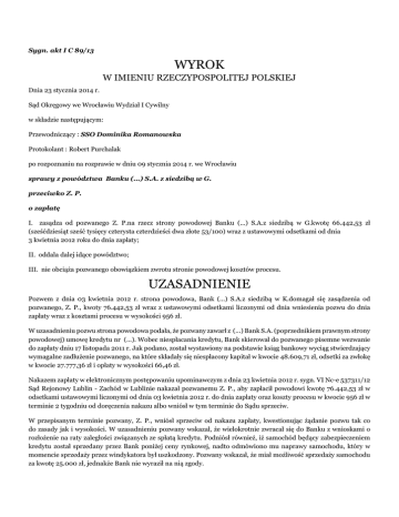 Sygn. akt I C 89/13 WYROK W IMIENIU RZECZYPOSPOLITEJ POLSKIEJ Dnia 23 stycznia 2014 r. Sąd Okręgowy we Wrocławiu Wydział I Cywilny w składzie następującym: Przewodniczący : SSO Dominika Romanowska Protokolant : Robert Purchalak po rozpoznaniu na rozprawie w dniu 09 stycznia 2014 r. we Wrocławiu sprawy z powództwa Banku (...) S.A. z siedzibą w G. przeciwko Z. P. o zapłatę I. zasądza od pozwanego Z. P.na rzecz strony powodowej Banku (...) S.A.z siedzibą w G.kwotę 66.442,53 zł (sześćdziesiąt sześć tysięcy czterysta czterdzieści dwa złote 53/100) wraz z ustawowymi odsetkami od dnia 3 kwietnia 2012 roku do dnia zapłaty; II. oddala dalej idące powództwo; III. nie obciąża pozwanego obowiązkiem zwrotu stronie powodowej kosztów procesu. UZASADNIENIE Pozwem z dnia 03 kwietnia 2012 r. strona powodowa, Bank (...) S.A.z siedzibą w K.domagał się zasądzenia od pozwanego, Z. P., kwoty 76.442,53 zł wraz z ustawowymi odsetkami liczonymi od dnia wniesienia pozwu do dnia zapłaty wraz z kosztami procesu w wysokości 956 zł. W uzasadnieniu pozwu strona powodowa podała, że pozwany zawarł z (...) Bank S.A. (poprzednikiem prawnym strony powodowej) umowę kredytu nr (...). Wobec niespłacania kredytu, Bank skierował do pozwanego pisemne wezwanie do zapłaty dniu 17 listopada 2011 r. Jak podano, został wystawiony na podstawie ksiąg bankowy wyciąg stwierdzający wymagalne zadłużenie pozwanego, na które składały się niespłacony kapitał w kwocie 48.609,71 zł, odsetki za zwłokę w kwocie 27.777,36 zł i opłaty w wysokości 66,46 zł. Nakazem zapłaty w elektronicznym postępowaniu upominawczym z dnia 23 kwietnia 2012 r. sygn. VI Nc-e 537311/12 Sąd Rejonowy Lublin - Zachód w Lublinie nakazał pozwanemu Z. P., aby zapłacił powodowi kwotę 76.442,53 zł w odsetkami ustawowymi liczonymi od dnia 03 kwietnia 2012 r. do dnia zapłaty oraz koszty procesu w kwocie 956 zł w terminie 2 tygodniu od doręczenia nakazu albo wniósł w tym terminie do Sądu sprzeciw. W przepisanym terminie pozwany, Z. P., wniósł sprzeciw od nakazu zapłaty, kwestionując żądanie pozwu tak co do zasady jak i wysokości. W uzasadnieniu pozwany wskazał, że wielokrotnie zwracał się do Banku z wnioskami o rozłożenie na raty zaległości związanych ze spłatą kredytu. Podniósł również, iż samochód będący zabezpieczeniem kredytu został sprzedany przez Bank poniżej ceny rynkowej, nadto odmówiono mu naprawy samochodu, który w momencie sprzedaży przez windykatora był uszkodzony. Pozwany wskazał, że miał możliwość sprzedaży samochodu za kwotę 25.000 zł, jednakże Bank nie wyraził na nią zgody. Postanowieniem z dnia 14 września 2012 r. Sąd Rejonowy Lublin - Zachód w Lublinie stwierdził skuteczne wniesienie sprzeciwu i utratę mocy nakazu zapłaty w całości. Strona powodowa, ustosunkowując się do zarzutów pozwanego podała, że zgodnie z treścią umowy przewłaszczenia na zabezpieczenie w przypadku niedotrzymania przez przewłaszczającego (pozwanego) warunków określonych w umowie kredytu, Bank mógł przystąpić do zaspokojenia swojej wierzytelności poprzez zbycie pojazdu albo jego zatrzymanie. Przy czym, jak podał, zgodnie z umową pojazd miał być wyceniony przez niezależnego rzeczoznawcę wskazanego przez Bank, na co pozwany wyraził zgodę. Dalej strona powodowa wskazała, że z zabezpieczenia kredytu skorzystała dopiero, gdy pozwany zaprzestał jego spłaty. Sąd ustalił następujący stan faktyczny: W dniu 09 lutego 2008 r. powód Z. P.zawarł z (...) Bank S.A.w G.umowę kredytu denominowanego na zakup pojazdu i kredytu gotówkowego nr (...). Łączna wysokość kredytu w walucie obcej wynosiła 21.447,25 CHF, stanowiącą na dzień 11 lutego 2008 r. równowartość 46.755 zł. Zgodnie z punktem 6 umowy, zabezpieczenie spłaty kredytu stanowiły cesja praw z umowy ubezpieczenia AC oraz przewłaszczenie pojazdu na zabezpieczenie/produktu. Bank mógł wypowiedzieć umowę kredytu, jeżeli kredytobiorca nie zapłaci w terminach określonych w umowie pełnych rat kredytu za co najmniej dwa okresy płatności, po uprzednim pisemnym wezwaniu Kredytobiorcy do zapłaty zaległych rat lub i części w terminie nie krótszym niż 7 dni od otrzymania wezwania lub w przypadku niedotrzymania przez Kredytobiorcę innych warunków udzielenia kredytu albo w razie utraty przez Kredytobiorcę zdolności kredytowej (pkt 8 umowy). W dniu podpisania umowy kredytu strony zawarły również umowę przewłaszczenia na zabezpieczenie, której przedmiotem był samochód osobowy marki V. (...). Zgodnie z umową pozwany przeniósł na Bank udział w 49/100 części w prawie własności pojazdu. Przewłaszczający (pozwany) zgodnie z umową przenosi na Bank pozostały udział we własności pojazdu, z zastrzeżeniem, że udział ten przejdzie na własność Banku w terminie 2 miesięcy od dnia otrzymania wypowiedzenia umowy kredytu ( §2 umowy). W razie niedotrzymania warunków zawartych w umowie kredytu, Bank był uprawniony do zaspokojenia swojej wierzytelności, poprzez bądź zbycie pojazdu bądź jego zatrzymanie. Niezależnie od wyboru kredytodawcy pojazd miał być wyceniony przez niezależnego rzeczoznawcę wskazanego przez Bank, na co przewłaszczający wyraził zgodę. Kwota uzyskana ze sprzedaży podlegała zaliczeniu na poczet zadłużenia. Przewłaszczający zobowiązuje się do sprzedaży pojazdu na rachunek Banku za pośrednictwem wskazanego przez Bank podmiotu trudniącego się sprzedażą pojazdów (§8 umowy). Dowód: • umowa kredytu z dnia 09 lutego 2008 r. k. 132-137 • umowa przewłaszczenia na zabezpieczenie z dnia 09 lutego 2008 k. 138-139 Pozwany, Z. P., wielokrotnie występował do Banku z prośbą o odroczenie terminu spłaty kredytu i obniżenie wysokości rat z uwagi na sytuację osobistą i finansową - brak zatrudnienia uniemożliwiający wywiązywanie się z zobowiązań kredytowych. Bank pismem z dnia 06 grudnia 2008 r. odmówił poz