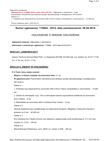 Page 1 of 3 Ogłoszenie powiązane: Ogłoszenie nr 115886-2014 z dnia 2014-04-04 r. Ogłoszenie o zamówieniu - Łódź Przedmiotem zamówienia jest dostawa sprzętu laboratoryjnego w postępowaniu ZP/73/2014. Pakiet nr 1 1. Probówka typu Eppendorff do osmometru 800 cl firmy Trident, kompatybilne z osmometrem. - 12 000 szt. ... Termin składania ofert: 2014-04-15 Numer ogłoszenia: 119844 - 2014; data zamieszczenia: 08.04.2014 OGŁOSZENIE O ZMIANIE OGŁOSZENIA Ogłoszenie dotyczy: Ogłoszenia o zamówieniu. Informacje o zmienianym ogłoszeniu: 115886 - 2014 data 04.04.2014 r. SEKCJA I: ZAMAWIAJĄCY Instytut "Centrum Zdrowia Matki Polki", ul. Rzgowska 281/289, 93-338 Łódź, woj. łódzkie, tel. 42 271 17 52; 271 17 53, fax. 42 271 17 50. SEKCJA II: ZMIANY W OGŁOSZENIU II.1) Tekst, który należy zmienić: Miejsce, w którym znajduje się zmieniany tekst: II.1.4). W ogłoszeniu jest: Przedmiotem zamówienia jest dostawa sprzętu laboratoryjnego w postępowaniu ZP/73/2014. Pakiet nr 1 1. Probówka typu Eppendorff do osmometru 800 cl firmy Trident, kompatybilne z osmometrem. - 12 000 szt. 2. Zestaw do mikropipety o poj. 100 µl (mikropipeta stanowi wyposażenie dodatkowe do osmometru firmy Trident). - 6 szt. 3. Mieszadełko do osmometru 800 cl (Vibrator) firmy Trident. - 10 szt. Pakiet nr 2 Haczyki plastikowe typu szydełkowego do wyjmowania skrzepów. (Bagietka z harpunem) Haczyki o grubości do 2 mm. - 40 000 szt. Pakiet nr 3 Eza metalowa lub z Nickel-chrome, bez kalibracji z pojedynczego drutu kantalowego śr. 0,7 mm oraz oczkiem śr. 2 mm. - 100 szt. Pakiet nr 4 Bibuła filtracyjna Whatmana, rozm. 46x57 cm, rodzaj: 2 CHR. - 400 szt. http://bzp0.portal.uzp.gov.pl/index.php?ogloszenie=show&pozycja=119844&rok=20... 2014-04-08 Page 2 of 3 Pakiet nr 5 Probówki o poj. 1,2 ml z heparyną litową do pobierabia krwi do badań laboratoryjnych systemem aspiracyjno-próżniowym firmy Sarstedt - 500 szt. Pakiet nr 6 Probówki do hodowli ze skosem, poj.10 ml, zakręcane białym korkiem, bezbarwne, szczelne, zapewniające prawidłowy wzrost hodowli, sterylne. - 4 000 szt. Pakiet nr 7 Szalki Petriego o śr 90x16 mm, sterylne - 200 szt. Pakiet nr 8 Miska ze stali nierdzewnej, rozm. 220 mm x 70 mm, poj. 2,0 l, autoklawowalna. - 8 szt. Pakiet nr 9 Kieliszek medyczny ze stali nierdzewnej o poj. 0,25 i z wewnętrznym skalowaniem i uchem zewnętrznym. - 12 szt. Pakiet nr 10 Kapilary szklane, hemakrytowe, bez heparyny, dł. 6-7,5 cm, grubość min. 2 mm. - 5 000 szt. Pakiet nr 11 Słoje szklane do zbiórki moczu, poj. 1,5 l typu Tulipan. - 80 szt. Pakiet nr 12 Butelka do karmienia niemowląt, zakręcana, typu SIMAX poj. 250 ml. - 100 szt. Pakiet nr 13 Szalki Petriego o śr. 10 cm wys. 15 mm, szklane, bez wentylacji. - 30 szt. Pakiet nr 14 Szalki Petriego o śr. 15 cm wys. 25 mm, szklane, bez wentylacji. - 30 szt. Pakiet nr 15 Szalki Petriego o śr. 20 cm wys. 30 mm, szklane, bez wentylacji. - 6 szt. W ogłoszeniu powinno być: Przedmiotem zamówienia jest dostawa sprzętu laboratoryjnego w postępowaniu ZP/73/2014. Pakiet nr 1 1. Probówka typu Eppendorff do osmometru 800 cl firmy Trident, kompatybilne z osmometrem. - 12 000 szt. 2. Zestaw do mikropipety o poj. 100 µl (mikropipeta stanowi wyposażenie dodatkowe do osmometru firmy Trident). - 6 szt. 3. Mieszadełko do osmometru 800 cl (Vibrator) firmy Trident. - 10 szt. Pakiet nr 2 Haczyki plastikowe typu szydełkowego do wyjmowania skrzepów. (Bagietka z harpunem) Haczyki o grubości do 2 mm. - 40 000 szt. http://bzp0.portal.uzp.gov.pl/index.php?ogloszenie=show&pozycja=119844&rok=20... 2014-04-08 Page 3 of 3 Pakiet nr 3 Eza metalowa lub z Nickel-chrome, bez kalibracji z pojedynczego drutu kantalowego śr. 0,7 mm oraz oczkiem śr. 2 mm. - 100 szt. Pakiet nr 4 Bibuła filtracyjna Whatmana, rozm. 46x57 cm, rodzaj: 2 CHR. - 400 szt. Pakiet nr 5 Probówki o poj. 1,2 ml z heparyną litową do pobierabia krwi do badań laboratoryjnych systemem aspiracyjno-próżniowym firmy Sarstedt - 500 szt. Pakiet nr 6 Probówki do hodowli ze skosem, poj.10 ml, zakręcane białym korkiem, bezbarwne, szczelne, zapewniające prawidłowy wzrost hodowli, sterylne. - 4 000 szt. Pakiet nr 7 Szalki Petriego o śr 90-92x16 mm, sterylne - 200 szt. Pakiet nr 8 Miska ze stali nierdzewnej, rozm. 220 mm x 70 mm, poj. 2,0 l, autoklawowalna. - 8 szt. Pakiet nr 9 Kieliszek medyczny ze stali nierdzewnej o poj. 0,25 i z wewnętrznym skalowaniem i uchem zewnętrznym. - 12 szt. Pakiet nr 10 Kapilary szklane, hemakrytowe, bez heparyny, dł. 6-7,5 cm, grubość min. 2 mm. - 5 000 szt. Pakiet nr 11 Słoje szklane do zbiórki moczu, poj. 1,5 l typu Tulipan. - 80 szt. Pakiet nr 12 Butelka do karmienia niemowląt, zakręcana, typu SIMAX poj. 250 ml. - 100 szt. Pakiet nr 13 Szalki Petriego o śr. 10 cm wys. 15 mm, szklane, bez wentylacji. - 30 szt. Pakiet nr 14 Szalki Petriego o śr. 15 cm wys. 25 mm, szklane, bez wentylacji. - 30 szt. Pakiet nr 15 Szalki Petriego o śr. 20 cm wys. 30 mm, szklane, bez wentylacji. - 6 szt. http://bzp0.portal.uzp.gov.pl/index.php?ogloszenie=show&pozycja=119844&rok=20... 2014-04-08