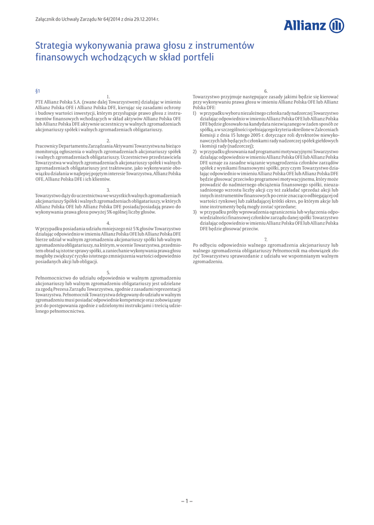 Załącznik do Uchwały Zarządu Nr 64/2014 z dnia 29.12.2014 r. Strategia wykonywania prawa głosu z instrumentów finansowych wchodzących w skład portfeli §1 1. PTE Allianz Polska S.A. (zwane dalej Towarzystwem) działając w imieniu Allianz Polska OFE i Allianz Polska DFE, kierując się zasadami ochrony i budowy wartości inwestycji, którym przysługuje prawo głosu z instrumentów finansowych wchodzących w skład aktywów Allianz Polska OFE lub Allianz Polska DFE aktywnie uczestniczy w walnych zgromadzeniach akcjonariuszy spółek i walnych zgromadzeniach obligatariuszy. 2. Pracownicy Departamentu Zarządzania Aktywami Towarzystwa na bieżąco monitorują ogłoszenia o walnych zgromadzeniach akcjonariuszy spółek i walnych zgromadzeniach obligatariuszy. Uczestnictwo przedstawiciela Towarzystwa w walnych zgromadzeniach akcjonariuszy spółek i walnych zgromadzeniach obligatariuszy jest traktowane, jako wykonywanie obowiązku działania w najlepiej pojętym interesie Towarzystwa, Allianz Polska OFE, Allianz Polska DFE i ich klientów. 3. Towarzystwo dąży do uczestnictwa we wszystkich walnych zgromadzeniach akcjonariuszy Spółek i walnych zgromadzeniach obligatariuszy, w których Allianz Polska OFE lub Allianz Polska DFE posiada/posiadają prawo do wykonywania prawa głosu powyżej 5% ogólnej liczby głosów. 4. W przypadku posiadania udziału mniejszego niż 5 % głosów Towarzystwo działając odpowiednio w imieniu Allianz Polska OFE lub Allianz Polska DFE bierze udział w walnym zgromadzeniu akcjonariuszy spółki lub walnym zgromadzeniu obligatariuszy, na którym, w ocenie Towarzystwa, przedmiotem obrad są istotne sprawy spółki, a zaniechanie wykonywania prawa głosu mogłoby zwiększyć ryzyko istotnego zmniejszenia wartości odpowiednio posiadanych akcji lub obligacji. 5. Pełnomocnictwo do udziału odpowiednio w walnym zgromadzeniu akcjonariuszy lub walnym zgromadzeniu obligatariuszy jest udzielane za zgodą Prezesa Zarządu Towarzystwa, zgodnie z zasadami reprezentacji Towarzystwa. Pełnomocnik Towarzystwa delegowany do udziału w walnym zgromadzeniu musi posiadać odpowiednie kompetencje oraz zobowiązany jest do postępowania zgodnie z udzielonymi instrukcjami i treścią udzielonego pełnomocnictwa. –1– 6. Towarzystwo przyjmuje następujące zasady jakimi będzie się kierować przy wykonywaniu prawa głosu w imieniu Allianz Polska OFE lub Allianz Polska DFE: 1) w przypadku wyboru niezależnego członka rady nadzorczej Towarzystwo działając odpowiednio w imieniu Allianz Polska OFE lub Allianz Polska DFE będzie głosowało na kandydata niezwiązanego w żaden sposób ze spółką, a w szczególności spełniającego kryteria określone w Zaleceniach Komisji z dnia 15 lutego 2005 r. dotyczące roli dyrektorów niewykonawczych lub będących członkami rady nadzorczej spółek giełdowych i komisji rady (nadzorczej); 2) w przypadku głosowania nad programami motywacyjnymi Towarzystwo działając odpowiednio w imieniu Allianz Polska OFE lub Allianz Polska DFE uznaje za zasadne wiązanie wynagrodzenia członków zarządów spółek z wynikami finansowymi spółki, przy czym Towarzystwo działając odpowiednio w imieniu Allianz Polska OFE lub Allianz Polska DFE będzie głosować przeciwko programowi motywacyjnemu, który może prowadzić do nadmiernego obciążenia finansowego spółki, nieuzasadnionego wzrostu liczby akcji czy też zakładać sprzedaż akcji lub innych instrumentów finansowych po cenie znacząco odbiegającej od wartości rynkowej lub zakładającej krótki okres, po którym akcje lub inne instrumenty będą mogły zostać sprzedane; 3) w przypadku próby wprowadzenia ograniczenia lub wyłączenia odpowiedzialności finansowej członków zarządu danej spółki Towarzystwo działając odpowiednio w imieniu Allianz Polska OFE lub Allianz Polska DFE będzie głosować przeciw. 7. Po odbyciu odpowiednio walnego zgromadzenia akcjonariuszy lub walnego zgromadzenia obligatariuszy Pełnomocnik ma obowiązek złożyć Towarzystwu sprawozdanie z udziału we wspomnianym walnym zgromadzeniu.
