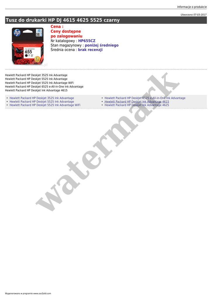 Informacje o produkcie Utworzono 07-03-2017 Tusz do drukarki HP DJ 4615 4625 5525 czarny Cena : Ceny dostępne po zalogowaniu Nr katalogowy : HP655CZ Stan magazynowy : poniżej średniego Średnia ocena : brak recenzji er m ar k Hewlett Packard HP Deskjet 3525 Ink Advantage Hewlett Packard HP Deskjet 5525 Ink Advantage Hewlett Packard HP Deskjet 5525 Ink Advantage WiFi Hewlett Packard HP DeskJet 6525 e-All-in-One Ink Advantage Hewlett Packard HP DeskJet Ink Advantage 4615 w at • Hewlett Packard HP Deskjet 3525 Ink Advantage • Hewlett Packard HP Deskjet 5525 Ink Advantage • Hewlett Packard HP Deskjet 5525 Ink Advantage WiFi Wygenerowano w programie www.oscGold.com • Hewlett Packard HP DeskJet 6525 e-All-in-One Ink Advantage • Hewlett Packard HP DeskJet Ink Advantage 4615 • Hewlett Packard HP Deskjet Ink Advantage 4625