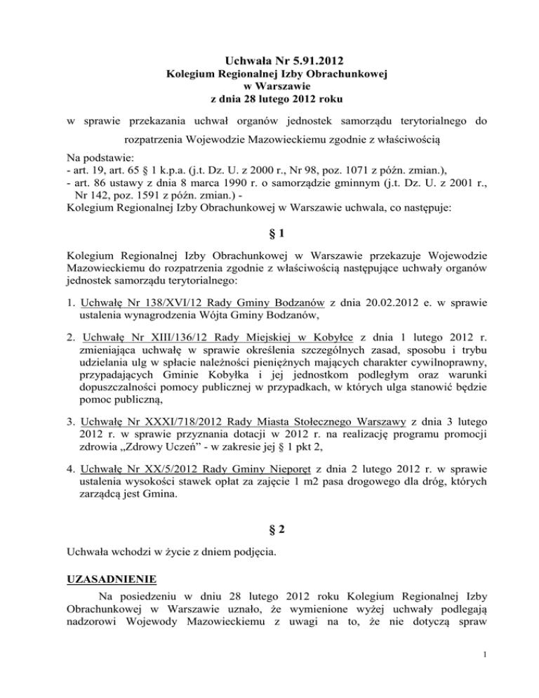 Uchwała Nr 5.91.2012 Kolegium Regionalnej Izby Obrachunkowej w Warszawie z dnia 28 lutego 2012 roku w sprawie przekazania uchwał organów jednostek samorządu terytorialnego do rozpatrzenia Wojewodzie Mazowieckiemu zgodnie z właściwością Na podstawie: - art. 19, art. 65 § 1 k.p.a. (j.t. Dz. U. z 2000 r., Nr 98, poz. 1071 z późn. zmian.), - art. 86 ustawy z dnia 8 marca 1990 r. o samorządzie gminnym (j.t. Dz. U. z 2001 r., Nr 142, poz. 1591 z późn. zmian.) Kolegium Regionalnej Izby Obrachunkowej w Warszawie uchwala, co następuje: §1 Kolegium Regionalnej Izby Obrachunkowej w Warszawie przekazuje Wojewodzie Mazowieckiemu do rozpatrzenia zgodnie z właściwością następujące uchwały organów jednostek samorządu terytorialnego: 1. Uchwałę Nr 138/XVI/12 Rady Gminy Bodzanów z dnia 20.02.2012 e. w sprawie ustalenia wynagrodzenia Wójta Gminy Bodzanów, 2. Uchwałę Nr XIII/136/12 Rady Miejskiej w Kobyłce z dnia 1 lutego 2012 r. zmieniająca uchwałę w sprawie określenia szczególnych zasad, sposobu i trybu udzielania ulg w spłacie należności pieniężnych mających charakter cywilnoprawny, przypadających Gminie Kobyłka i jej jednostkom podległym oraz warunki dopuszczalności pomocy publicznej w przypadkach, w których ulga stanowić będzie pomoc publiczną, 3. Uchwałę Nr XXXI/718/2012 Rady Miasta Stołecznego Warszawy z dnia 3 lutego 2012 r. w sprawie przyznania dotacji w 2012 r. na realizację programu promocji zdrowia „Zdrowy Uczeń” - w zakresie jej § 1 pkt 2, 4. Uchwałę Nr XX/5/2012 Rady Gminy Nieporęt z dnia 2 lutego 2012 r. w sprawie ustalenia wysokości stawek opłat za zajęcie 1 m2 pasa drogowego dla dróg, których zarządcą jest Gmina. §2 Uchwała wchodzi w życie z dniem podjęcia. UZASADNIENIE Na posiedzeniu w dniu 28 lutego 2012 roku Kolegium Regionalnej Izby Obrachunkowej w Warszawie uznało, że wymienione wyżej uchwały podlegają nadzorowi Wojewody Mazowieckiemu z uwagi na to, że nie dotyczą spraw 1 finansowych, o których mowa w art. 11 ust. 1 pkt 1-7 ustawy z dnia 7 października 1992 roku o regionalnych izbach obrachunkowych. Mając powyższe na uwadze na podstawie art. 19 i art. 65 § 1 k.p.a., art. 86 ustawy samorządzie gminnym, Kolegium postanowiło przekazać w/w uchwały Wojewodzie Mazowieckiemu do rozpatrzenia zgodnie z właściwością. Przewodniczący Kolegium Wojciech Balcerzak 2