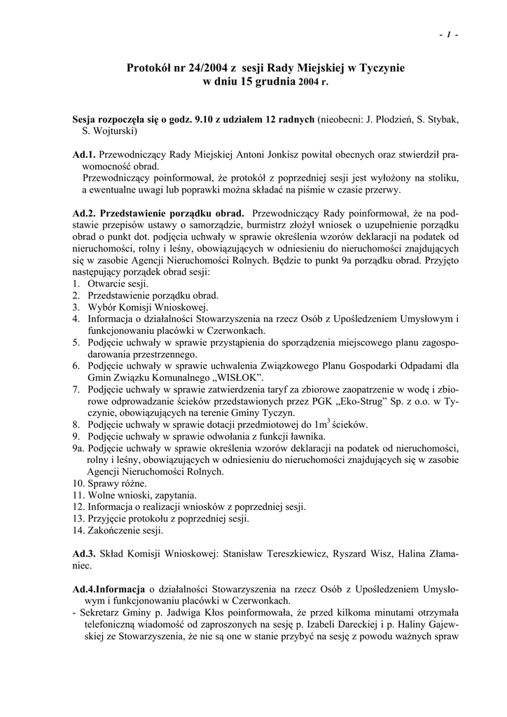 - 1 - Protokół nr 24/2004 z sesji Rady Miejskiej w Tyczynie w dniu 15 grudnia 2004 r. Sesja rozpoczęła się o godz. 9.10 z udziałem 12 radnych (nieobecni: J. Płodzień, S. Stybak, S. Wojturski) Ad.1. Przewodniczący Rady Miejskiej Antoni Jonkisz powitał obecnych oraz stwierdził prawomocność obrad. Przewodniczący poinformował, że protokół z poprzedniej sesji jest wyłożony na stoliku, a ewentualne uwagi lub poprawki można składać na piśmie w czasie przerwy. Ad.2. Przedstawienie porządku obrad. Przewodniczący Rady poinformował, że na podstawie przepisów ustawy o samorządzie, burmistrz złożył wniosek o uzupełnienie porządku obrad o punkt dot. podjęcia uchwały w sprawie określenia wzorów deklaracji na podatek od nieruchomości, rolny i leśny, obowiązujących w odniesieniu do nieruchomości znajdujących się w zasobie Agencji Nieruchomości Rolnych. Będzie to punkt 9a porządku obrad. Przyjęto następujący porządek obrad sesji: 1. Otwarcie sesji. 2. Przedstawienie porządku obrad. 3. Wybór Komisji Wnioskowej. 4. Informacja o działalności Stowarzyszenia na rzecz Osób z Upośledzeniem Umysłowym i funkcjonowaniu placówki w Czerwonkach. 5. Podjęcie uchwały w sprawie przystąpienia do sporządzenia miejscowego planu zagospodarowania przestrzennego. 6. Podjęcie uchwały w sprawie uchwalenia Związkowego Planu Gospodarki Odpadami dla Gmin Związku Komunalnego „WISŁOK”. 7. Podjęcie uchwały w sprawie zatwierdzenia taryf za zbiorowe zaopatrzenie w wodę i zbiorowe odprowadzanie ścieków przedstawionych przez PGK „Eko-Strug” Sp. z o.o. w Tyczynie, obowiązujących na terenie Gminy Tyczyn. 8. Podjęcie uchwały w sprawie dotacji przedmiotowej do 1m3 ścieków. 9. Podjęcie uchwały w sprawie odwołania z funkcji ławnika. 9a. Podjęcie uchwały w sprawie określenia wzorów deklaracji na podatek od nieruchomości, rolny i leśny, obowiązujących w odniesieniu do nieruchomości znajdujących się w zasobie Agencji Nieruchomości Rolnych. 10. Sprawy różne. 11. Wolne wnioski, zapytania. 12. Informacja o realizacji wniosków z poprzedniej sesji. 13. Przyjęcie protokołu z poprzedniej sesji. 14. Zakończenie sesji. Ad.3. Skład Komisji Wnioskowej: Stanisław Tereszkiewicz, Ryszard Wisz, Halina Złamaniec. Ad.4.Informacja o działalności Stowarzyszenia na rzecz Osób z Upośledzeniem Umysłowym i funkcjonowaniu placówki w Czerwonkach. - Sekretarz Gminy p. Jadwiga Kłos poinformowała, że przed kilkoma minutami otrzymała telefoniczną wiadomość od zaproszonych na sesję p. Izabeli Dareckiej i p. Haliny Gajewskiej ze Stowarzyszenia, że nie są one w stanie przybyć na sesję z powodu ważnych spraw - 2 - służbowych. Panie te zadeklarowały, że w nieodległym czasie prześlą pisemną informację o działalności Stowarzyszenia, a także odpowiedzą na wszelkie pytania radnych. Radni wyrazili zgodę, by zmodyfikować porządek obrad, tj. przesunąć na początek punkty 9 i 9a, gdyż nie ma jeszcze na sali osób zaproszonych do przedstawienia komentarza do punktu 5 i 6 – były one poinformowane, iż omawianie punktu 5 rozpocznie się o godz. 10.00 Ad.9. Uchwała: odwołanie z funkcji ławnika. - Przewodniczący Rady poinformował, że do Rady wpłynęło pismo prezesa Sądu Okręgowego o odwołanie z funkcji ławnika p. Anny Magdaleny Skubisz z Białej, która prawomocnym wyrokiem sądu z 3 listopada 2004 r. została uznana winną popełnienia zarzucanego jej czynu i skazana na karę pozbawienia wolności, której wykonanie zostało warunkowo zawieszone na okres próby 2 lat. Prezes Sądu nie wnosi o uzupełnienie liczby ławników z gminy Tyczyn. Głosowanie uchwały Za przyjęciem uchwały głosowało 12 radnych, głosów przeciwnych i wstrzymujących się nie było (uchwała nr XXIV/197/2004). Ad.9a. Uchwała: określenie wzorów deklaracji na podatek od nieruchomości, rolny i leśny, obowiązujących w odniesieniu do nieruchomości znajdujących się w zasobie Agencji Nieruchomości Rolnych. - Skarbnik Gminy p. Barbara Matuła poinformowała, że Agencja Nieruchomości Rolnych Oddział w Rzeszowie zwróciła się o przyjęcie uchwałą Rady wzorów deklaracji opracowanych przez Agencję na podatek od nieruchomości, rolny i leśny celem ich stosowania do nieruchomości będących w zasobie Agencji. W uzasadnieniu Agencja podaje iż ma własny program komputerowy, który wymaga jednolitego druku dla wszystkich gmin. Głosowanie uchwały Za przyjęciem uchwały głosowało 12 radnych, głosów przeciwnych i wstrzymujących się nie było (uchwała nr XXIV/195/2004). Ad.5. Uchwała: przystąpienie do sporządzenia miejscowego planu zagospodarowania przestrzennego. - Projektantka, p. Halina Koś wyjaśniła, że wniosek o zmianę planu dotyczy działki przy ul. Cegielnianej w Budziwoju, złożyła go osoba prywatna. Wnioskodawca wniósł o ustanowienie przeznaczenia terenu pod zabudowę mieszkaniową. Studium określa ten teren jako „możliwy” do zabudowy mieszkaniowej, lecz Studium nie jest prawem miejscowym – stąd projekt uchwały. Opracowanie przeszło wymagane procedury (ogłoszenie, wyłożenie, przyjmowanie wniosków i uwag). Po analizie, nie widzi się przeszkód do zmiany planu. Działki leżą w istniejącej zabudowie, są uzbrojone, mają dostęp do drogi publicznej. Teren podlegający zmianie planu ma obszar ok. 0,60 a, są to grunty I-III klasy bonitacji, stąd niezbędna była zgoda Ministerstwa Rolnictwa. Głosowanie uchwały Za przyjęciem uchwały głosowało 12 radnych, głosów przeciwnych i wstrzymujących się nie było (uchwała nr XXIV/193/2004). Ad.6. Uchwała: uchwalenie Związkowego Planu Gospodarki Odpadami dla Gmin Związku Komunalnego „WISŁOK”. - p. Katarzyna Salamon z ZI „WISŁOK” wyjaśniła, że w ubr. wszystkie gminy wchodzące w skład ZK, podjęły uchwałę deklaracyjną w tej samej sprawie. Jest to zatem ciąg dalszy tej sprawy. Przedstawiony Radzie plan jest wspólnym dokumentem kilk