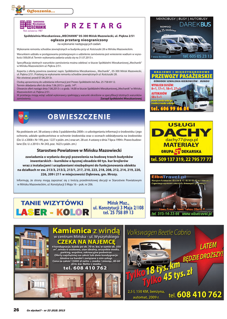 Ogłoszenia... PRZETARG Spółdzielnia Mieszkaniowa „MECHANIK” 05-300 Mińsk Mazowiecki, ul. Piękna 2/51 ogłasza przetarg nieograniczony na wykonanie następujących zadań: Wykonanie remontu schodów zewnętrznych w budynku przy ul. Kościuszki 28 w Mińsku Mazowieckim. Warunkiem udziału w postępowaniu przetargowym o udzielenie zamówienia jest wniesienie wadium w wysokości 500,00 zł. Termin wykonania zadania ustala się na 31.07.2013 r. Specyfikację istotnych warunków zamówienia można odebrać w biurze Spółdzielni Mieszkaniowej „Mechanik” w Mińsku Mazowieckim ul. Piękna 2/51. Koperta z ofertą powinna zawierać napis: Spółdzielnia Mieszkaniowa „ Mechanik” , 05-300 Mińsk Mazowiecki, ul. Piękna 2/51. Przetarg na wykonanie remontu schodów zewnętrznych ul. Kościuszki 28. Nie otwierać przed 07.06.2013r. PRZEWOZY PASAŻERSKIE Osobą uprawnioną do udzielania informacji jest Prezes Spółdzielni tel./fax. 25 758 69 12. Termin składania ofert do dnia 7.06.2013 r. godz. 1400. Otwarcie ofert nastąpi dnia 7.06.2013 r. o godz. 14.00 w biurze Spółdzielni Mieszkaniowej „Mechanik” w Mińsku Mazowieckim ul. Piękna 2/51. W przetargu mogą wziąć udział wykonawcy spełniający warunki określone w specyfikacji istotnych warunków zamówienia. Zarząd Spółdzielni Mieszkaniowej WYNAJEM BUSÓW: 8+1, 17+1, 18+1, 27+1 AUTOKARÓW 50+1+1 KRA JOWE I MIĘDZYNARODOWE www.rondo.edu.pl [email protected] tel. 606 99 66 04 OBWIESZCZENIE USŁUGI Na podstawie art. 38 ustawy z dnia 3 października 2008 r. o udostępnianiu informacji o środowisku i jego ochronie, udziale społeczeństwa w ochronie środowiska oraz o ocenach oddziaływania na środowisko (Dz. U. z 2008 r. Nr 199, poz. 1227 z późn. zm.) oraz art. 28 ust. 4 ustawy z dnia 7 lipca 1994 r. Prawo budowlane (Dz. U. z 2010 r. Nr 243, poz. 1623 z późn. zm.) Starostwo Powiatowe w Mińsku Mazowiecki zawiadamia o wydaniu decyzji pozwolenia na budowę trzech budynków inwentarskich – kurników o łącznej obsadzie 60 tys. kur brojlerów wraz z instalacjami i urządzeniami niezbędnymi do funkcjonowania obiektu na działkach nr ew. 213/3, 213/2, 213/1, 217, 210, 223, 218, 208, 212, 214, 219, 220, 226, 209 i 211 w miejscowości Dąbrowa, gm. Mrozy. [email protected] MATERIAŁY tel. 509 137 319, 22 795 77 77 Informuję, że strony mogą zapoznać się z treścią przedmiotowej decyzji w Starostwie Powiatowym w Mińsku Mazowieckim, ul. Konstytucji 3 Maja 16 – pok. nr 206. TANIE WIZYTÓWKI Mińsk Maz., ul. Konstytucji 3 Maja 2/108 tel. 25 758 89 13 Kamienica z windą w centrum Mińska - ul. Wyszyńskiego czeka na najemcę LATEM 4 kondygnacje, każda po ok. 70 m. kw, w sumie ok. 350 m², winda 6-osobowa, stan idealny, wszystkie media, parking, wspólne, rekreacyjne podwórze. Oferty najchętniej na całość lub dwie kondygnacje. Idealne na handel i związane z nim usługi. Cena za całość 15000 zł netto + media / miesiąc, 40-60 zł/m. kw. Netto + media. SZY! Ż BĘDZIE DRO tel. 608 410 762 2,5 l, 150 KM, benzyna, automat, 2009 r. 26 Co słychać? - nr 23 (818) 2013 tel. 608 410 762