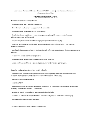 Mazowiecko-Warszawski Związek Kolarski (MWZKol) poszukuje współpracownika na umowę zlecenie na stanowisko: TRENERA KOORDYNATORA Pożądane kwalifikacje i umiejętności: - doświadczenie w pracy w klubie sportowym; - skrupulatność i dokładność w wypełnianiu dokumentów; - doświadczenie w aplikowaniu i rozliczaniu dotacji; - doświadczenie we współpracy z administracją samorządową lub państwową (zwłaszcza z Ministerstwem Sportu i Turystyki); - znajomość systemu sportu młodzieżowego (http://sport-mlodziezowy.pl/); - minimum wykształcenie średnie, mile widziane wykształcenie z zakresu kultury fizycznej (np. instruktor kolarstwa); - szeroka wiedza z zakresu kolarstwa (m.in. znajomość informatora sportowego dostępnego na stronie pzkol.pl); - podstawowa wiedza z zakresu księgowości; - doświadczenie w prowadzeniu kasy klubu bądź innej instytucji; - wiedza z zakresu działalności organizacji pozarządowych (zwłaszcza sportowych). Do zadań osoby na tym stanowisku będzie należało: - koordynowanie i rozliczenie akcji szkoleniowych kolarskiej kadry Mazowsza w Polskim Związku Kolarskim (PZKol) oraz w Unii Związków Sportowych Warszawy i Mazowsza; - kontakty z trenerami klubowymi; - kontakty z PZKol; - pełnienie dyżuru raz w tygodniu w siedzibie związku (m.in. zbieranie korespondencji, prowadzenie ewidencji zawodników i klubów z Mazowsza); - wyrabianie licencji i prowadzenie w tym zakresie kasy Związku; - obecność na zebraniach Zarządu MWZKol. (zebrania odbywają się średnio raz w miesiącu); - bieżąca współpraca z zarządem MWZkol. CV proszę kierować na adres mailowy: [email protected]
